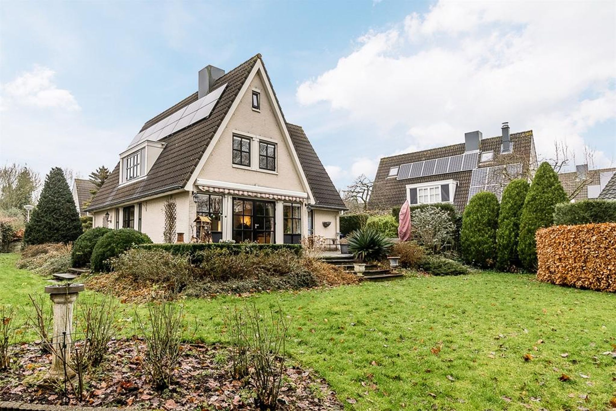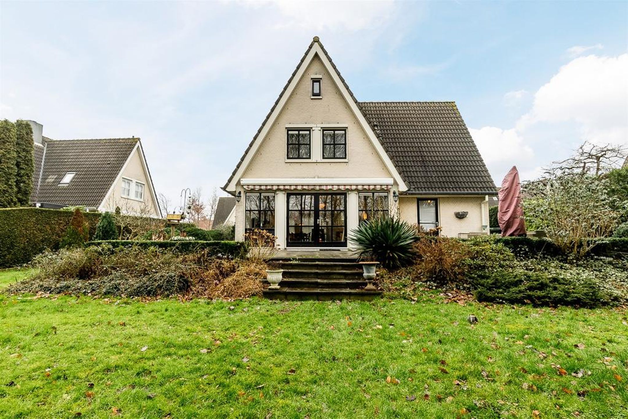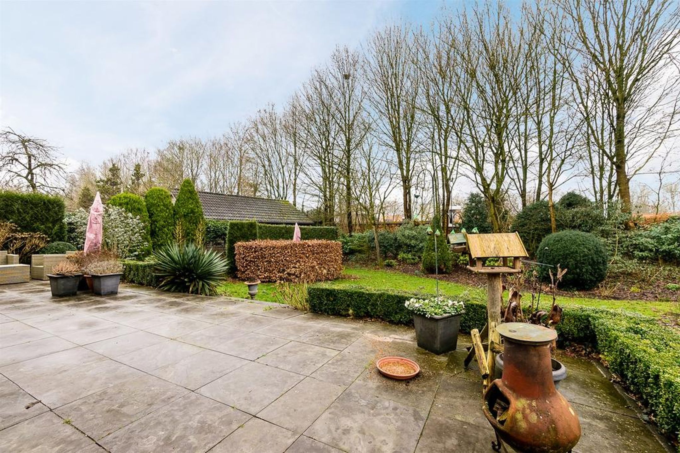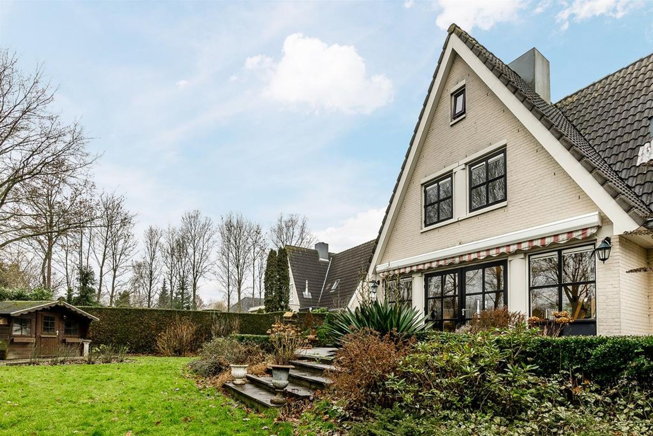 Extern Opmerkelijke stijlkenmerken van deze fraaie villa zijn de lichte tint gevels, de donker grijze betonpannen, de zinken goten en de fantastische grote raampartijen met roedeverdelingen rond de gehele woning. De voortuin is ingedeeld met een brede oprit voorzien van sierbestrating, gazon en borders met een diversiteit aan bomen en planten zoals een grote dennenboom en sierpluimen. Achter de woning, volledig aan het straatzicht onttrokken, ligt een prachtige royale brede en vooral diepe tuin. Deze ligt voornamelijk op het zuiden dus kunt u hier de gehele dag van het zonlicht genieten. De brede hout- en boswal zal het gevoel van het wonen in de natuur zeker versterken. Zo treft u een breed zonneterras langs de achtergevel t.p.v. de dubbele openslaande deuren. Voorts is de tuin grotendeels ingericht met een groot lager gelegen gazon en diverse ruime borders. Rondom wordt de tuin omsloten door natuurlijke groen erfscheidingen en de diepe boswal aan de achterzijde. Het houten tuinhuis in de tuin biedt u veel extra bergruimte voor uw tuingereedschap e.d. Uiteraard ontbreekt de buitenkraan niet.