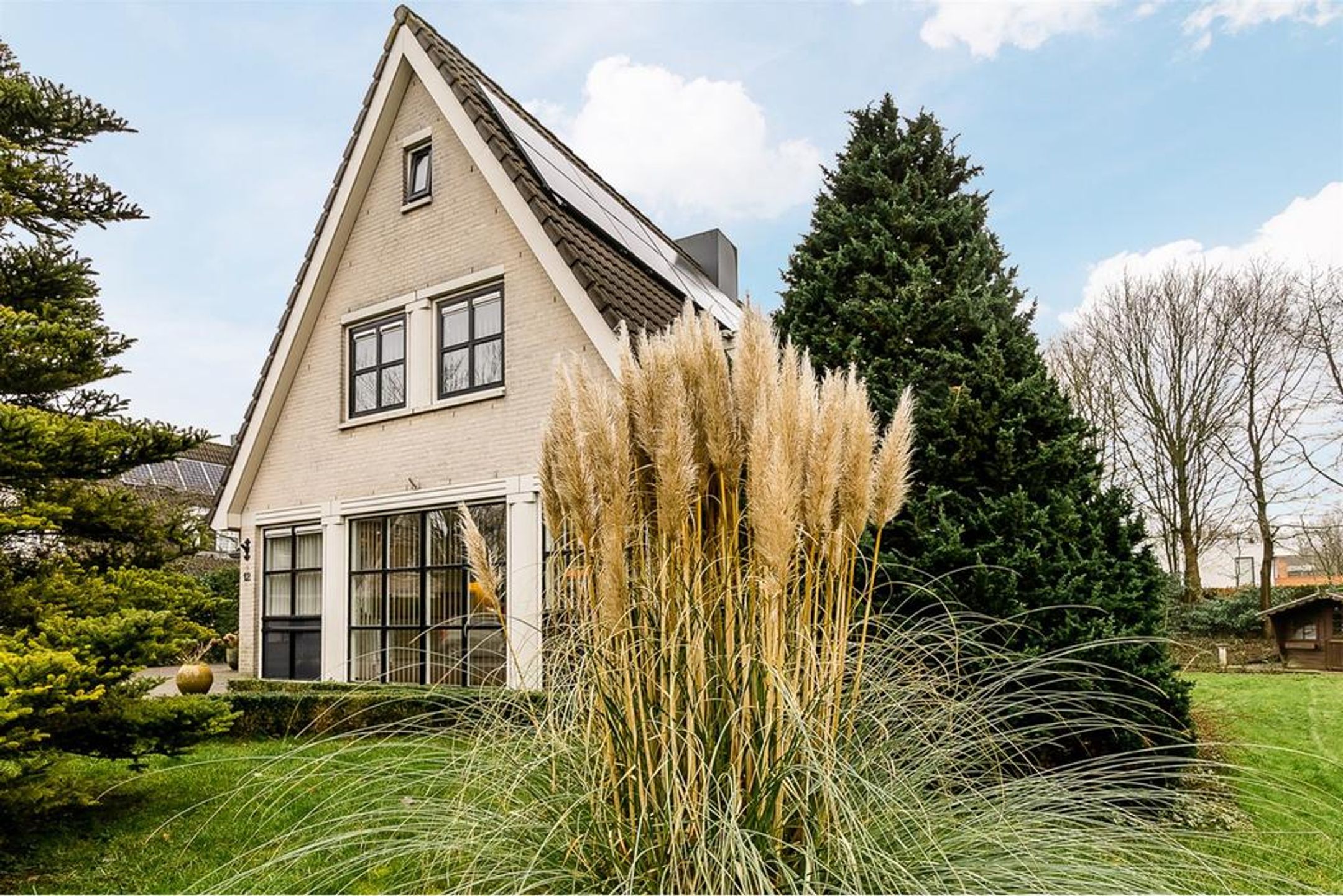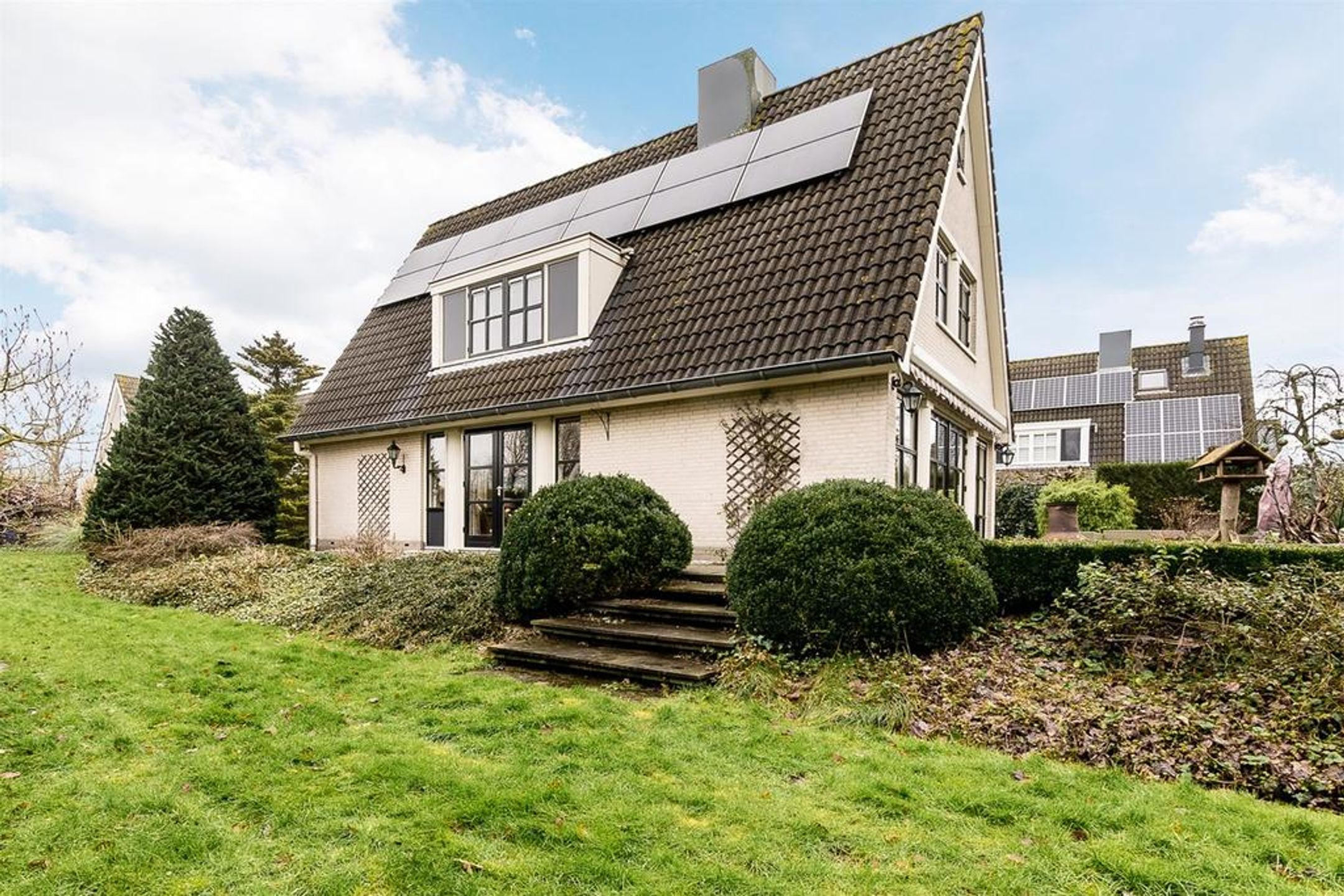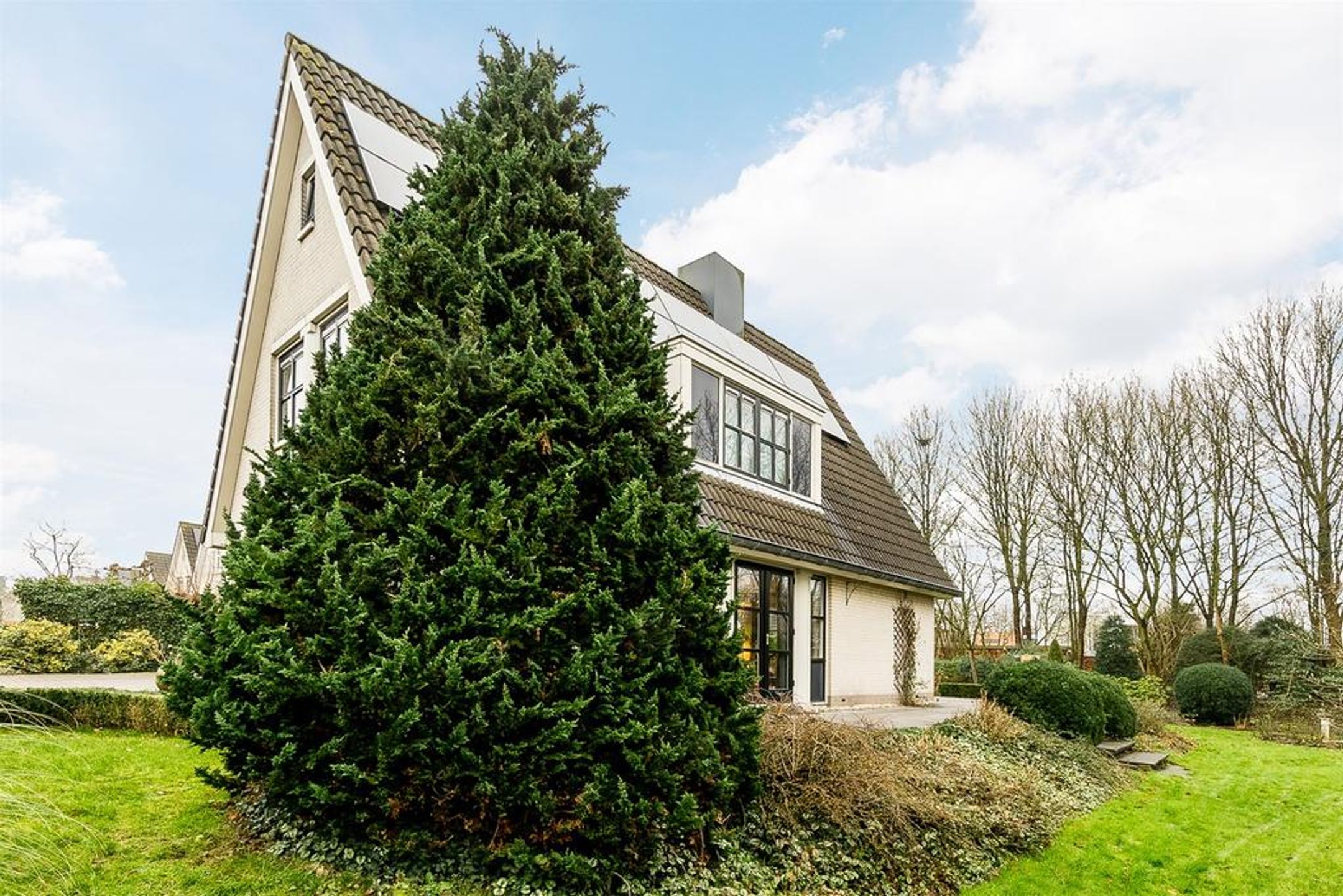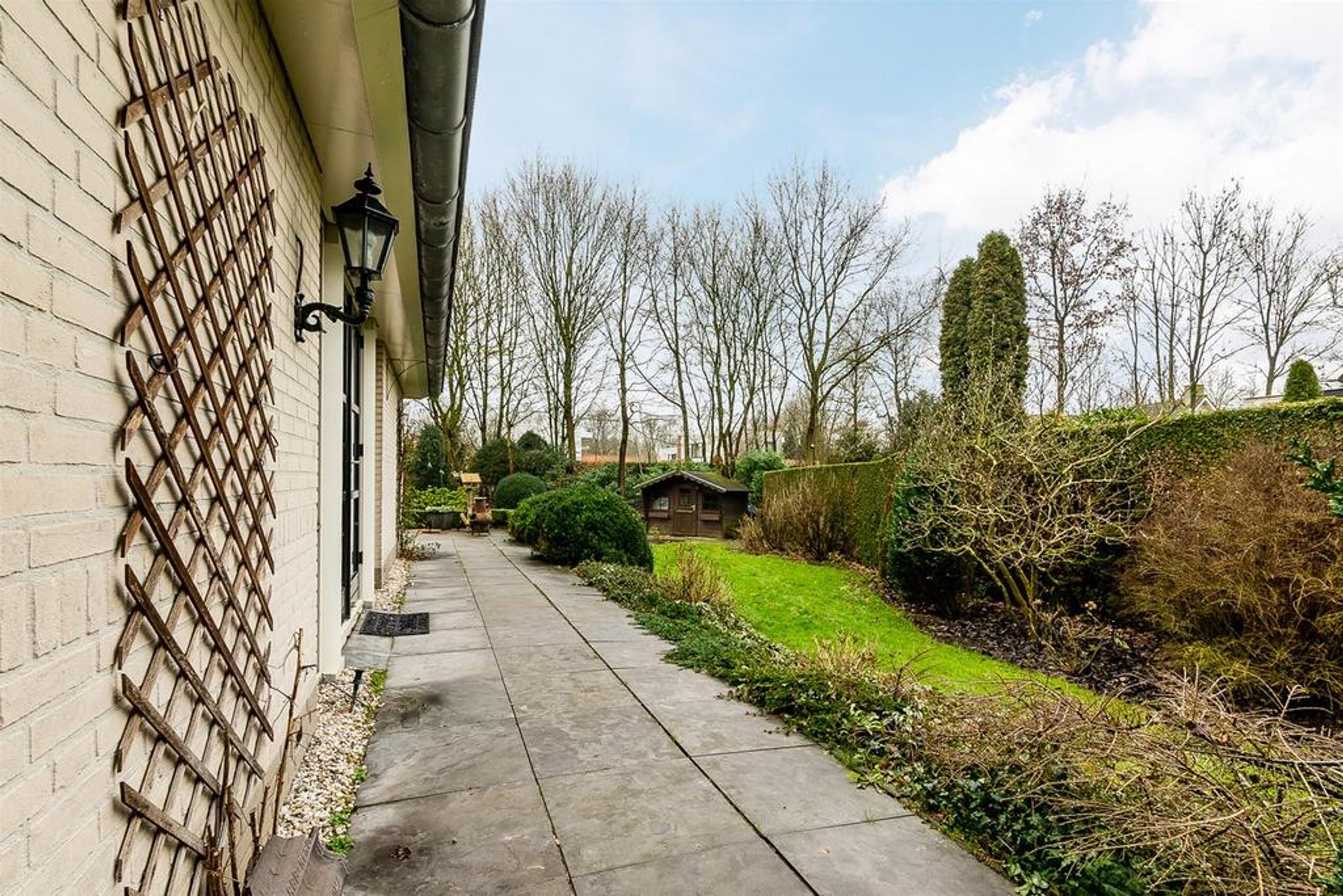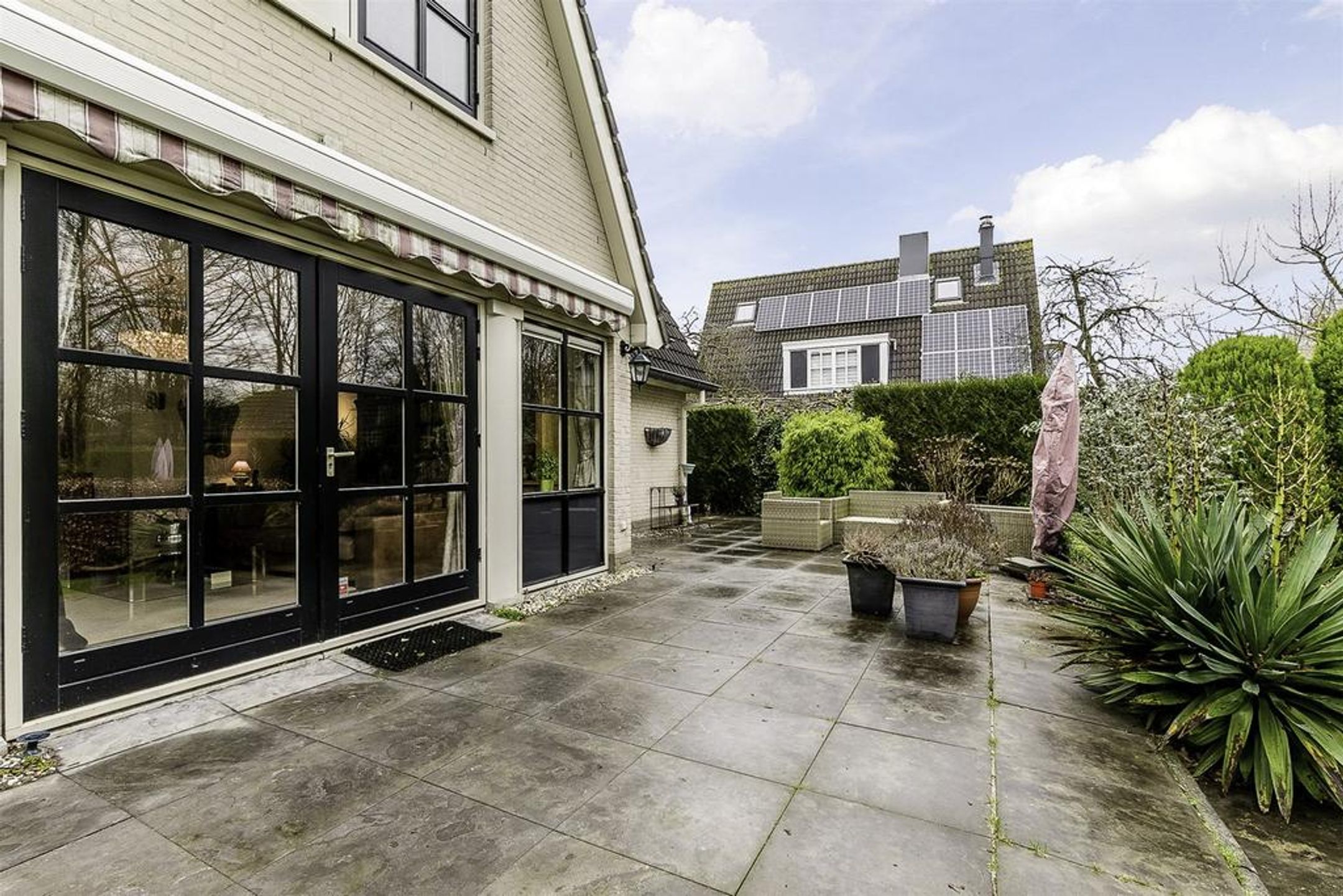 Extern Opmerkelijke stijlkenmerken van deze fraaie villa zijn de lichte tint gevels, de donker grijze betonpannen, de zinken goten en de fantastische grote raampartijen met roedeverdelingen rond de gehele woning. De voortuin is ingedeeld met een brede oprit voorzien van sierbestrating, gazon en borders met een diversiteit aan bomen en planten zoals een grote dennenboom en sierpluimen. Achter de woning, volledig aan het straatzicht onttrokken, ligt een prachtige royale brede en vooral diepe tuin. Deze ligt voornamelijk op het zuiden dus kunt u hier de gehele dag van het zonlicht genieten. De brede hout- en boswal zal het gevoel van het wonen in de natuur zeker versterken. Zo treft u een breed zonneterras langs de achtergevel t.p.v. de dubbele openslaande deuren. Voorts is de tuin grotendeels ingericht met een groot lager gelegen gazon en diverse ruime borders. Rondom wordt de tuin omsloten door natuurlijke groen erfscheidingen en de diepe boswal aan de achterzijde. Het houten tuinhuis in de tuin biedt u veel extra bergruimte voor uw tuingereedschap e.d. Uiteraard ontbreekt de buitenkraan niet.