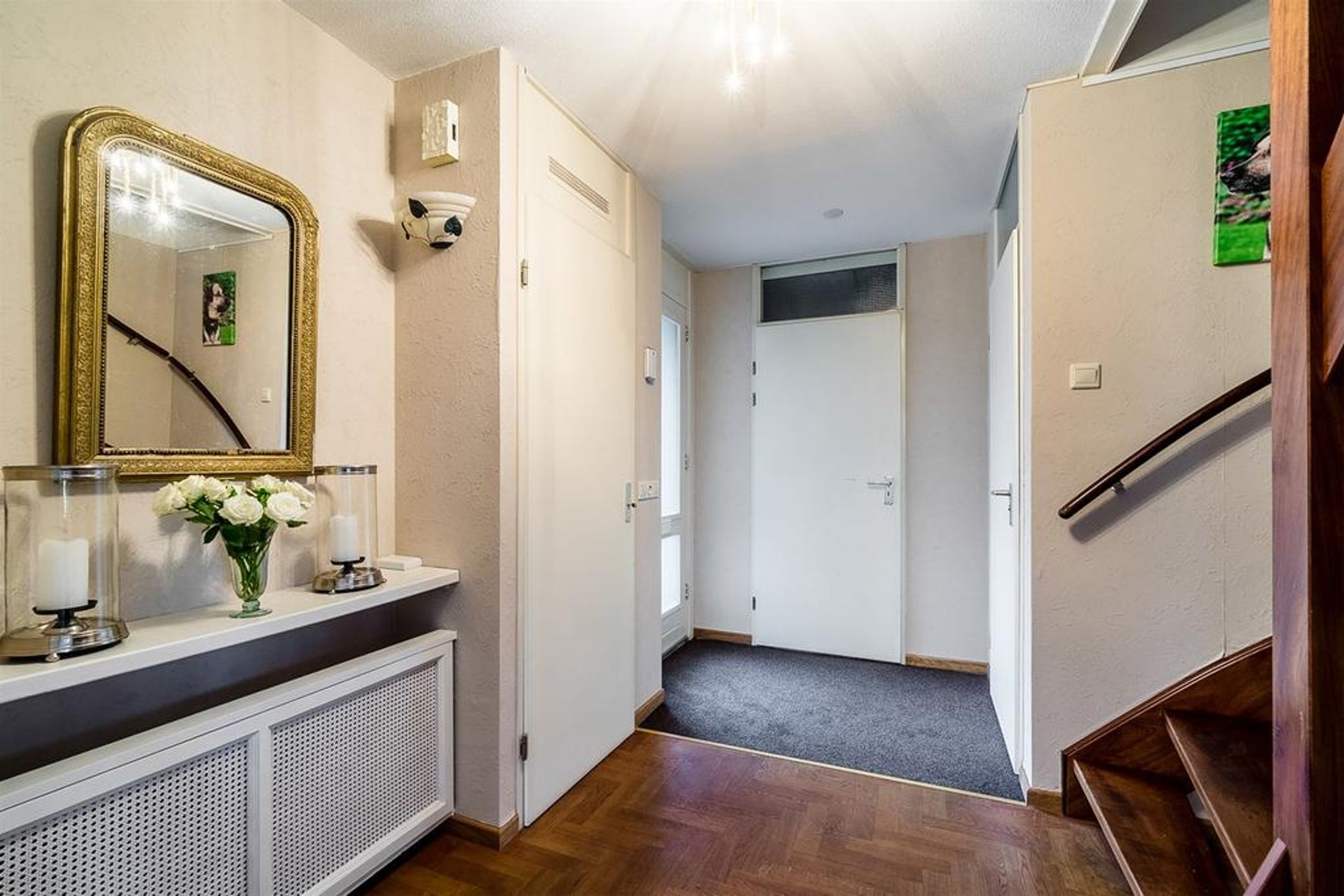 Begane grond Ruime hal welke toegang biedt tot de garderobe, de meterkast, de toiletruimte, de ruime inpandige garage, de royale living en de trapopgang naar de 1e verdieping. De vloer is voorzien van een Eiken houten parket in visgraatmotief. De toiletruimte is betegeld met lichte tint wand- en vloertegels en voorzien van closet en fonteintje. De ruime en praktische garage is voorzien van overheaddeur. De zijramen dragen zorg voor wenselijk daglicht. Een deur in de achtergevel biedt toegang tot de zeer royale achtertuin. De garage biedt heerlijk veel bergruimte maar kan tevens bij de woning betrokken worden als zijnde een werk- of hobbykamer.