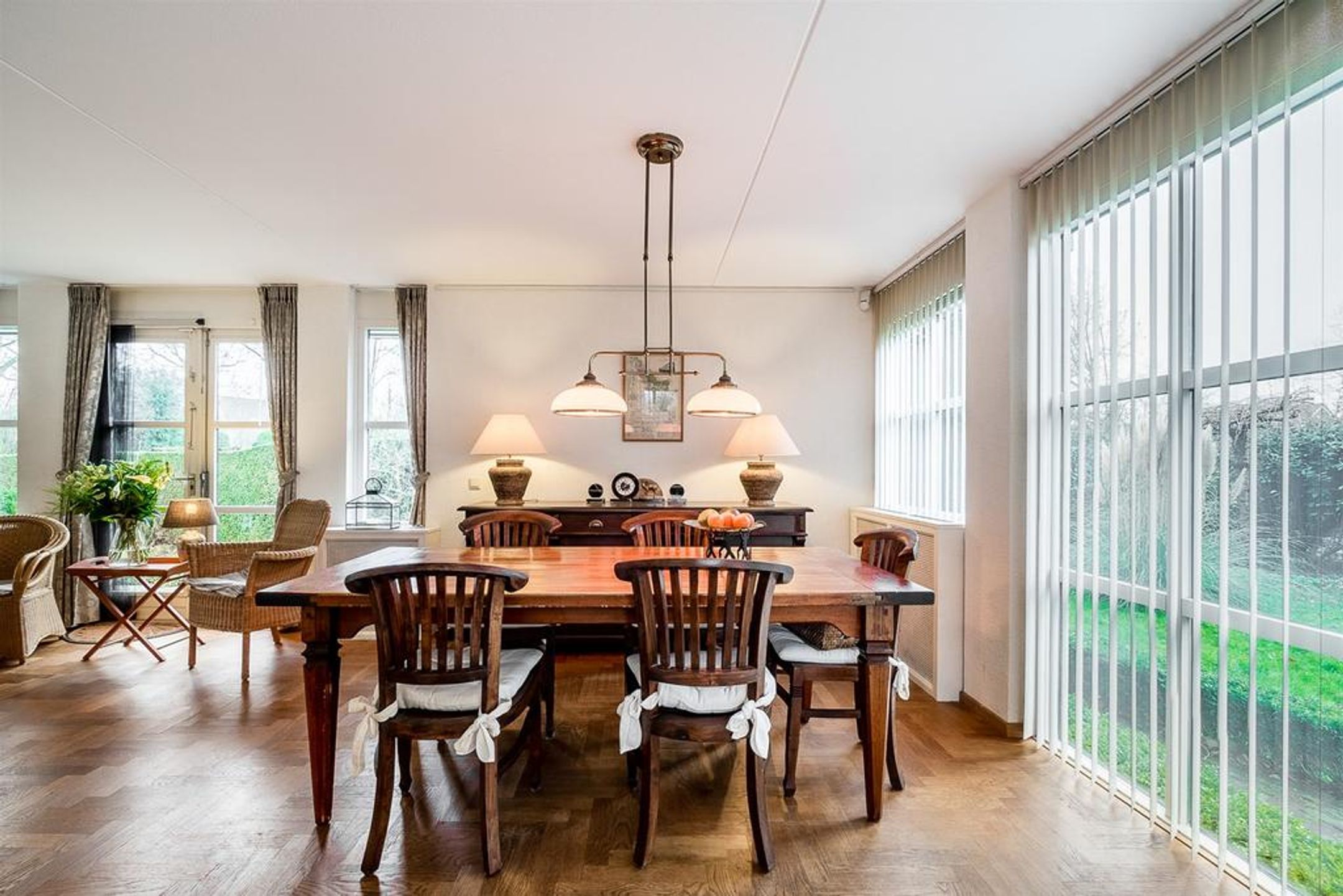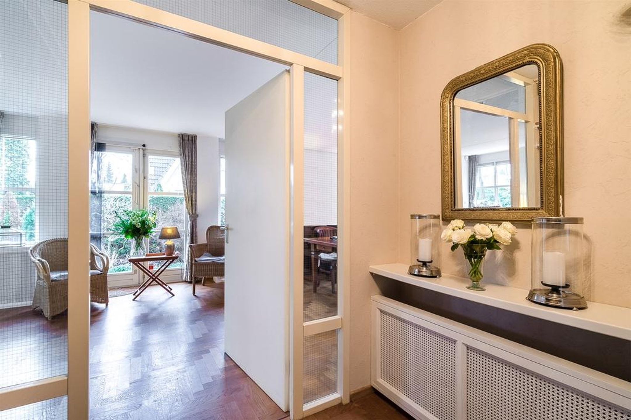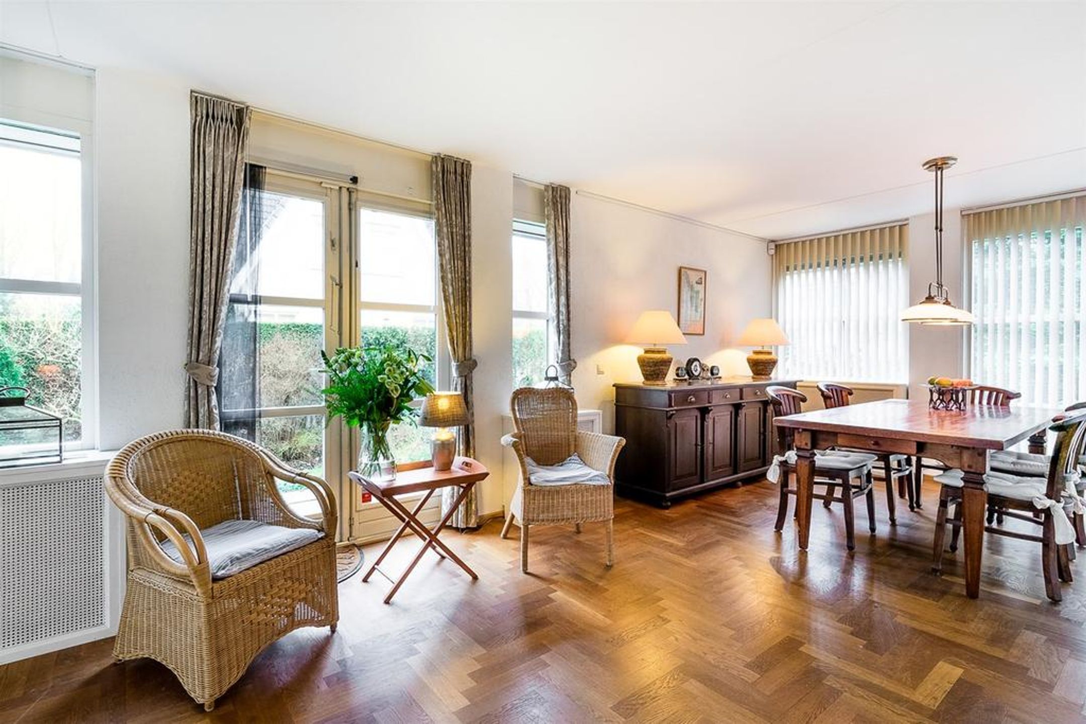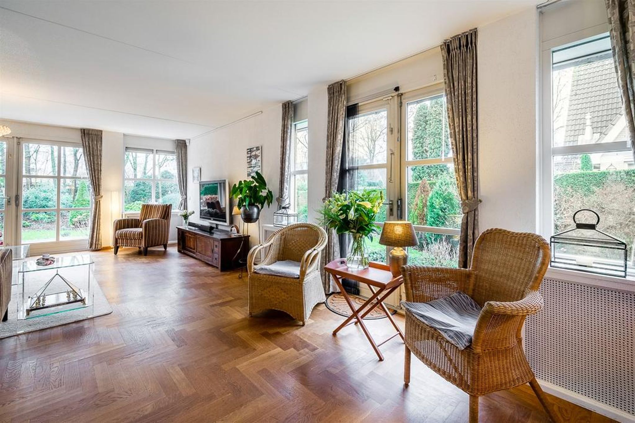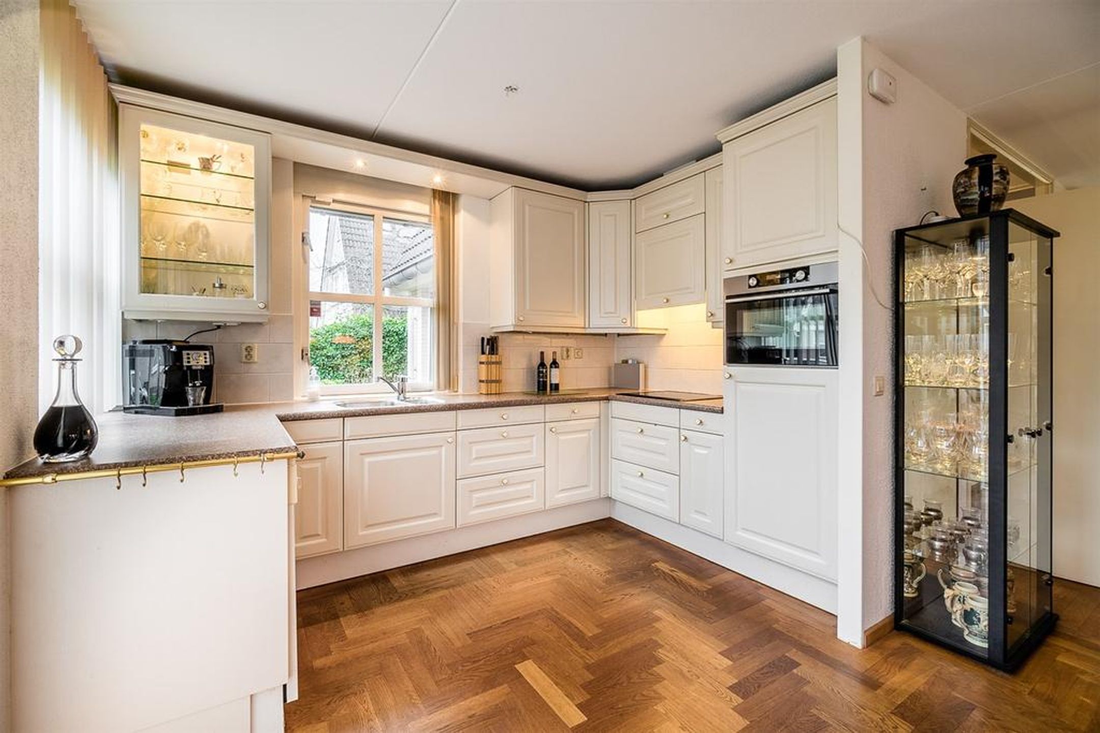 De living is heerlijk ruim, licht en verdeeld in een royale zithoek aan de achterzijde en een riante eetzone aan de voorzijde met aangrenzend de open keuken. Centraal treft u veel wenselijke verkeersruimte met dubbele openslaande deuren naar de tuin. De grote raampartij in de achtergevel is uitgevoerd met dubbele openslaande deuren waardoor u uw zonneterras en tuin kunt betreden. Zodra u deze deuren opent zult u de heerlijke rust, privacy en natuur ervaren. Rondom geniet u van prachtig zicht op uw tuin, boswal en de groene woonomgeving. De vloer is voorzien van een Eiken houten parket in stijlvol visgraat motief. De radiatoren zijn netjes omtimmerd. Er is ruimte voor het plaatsen van een grote zithoek.