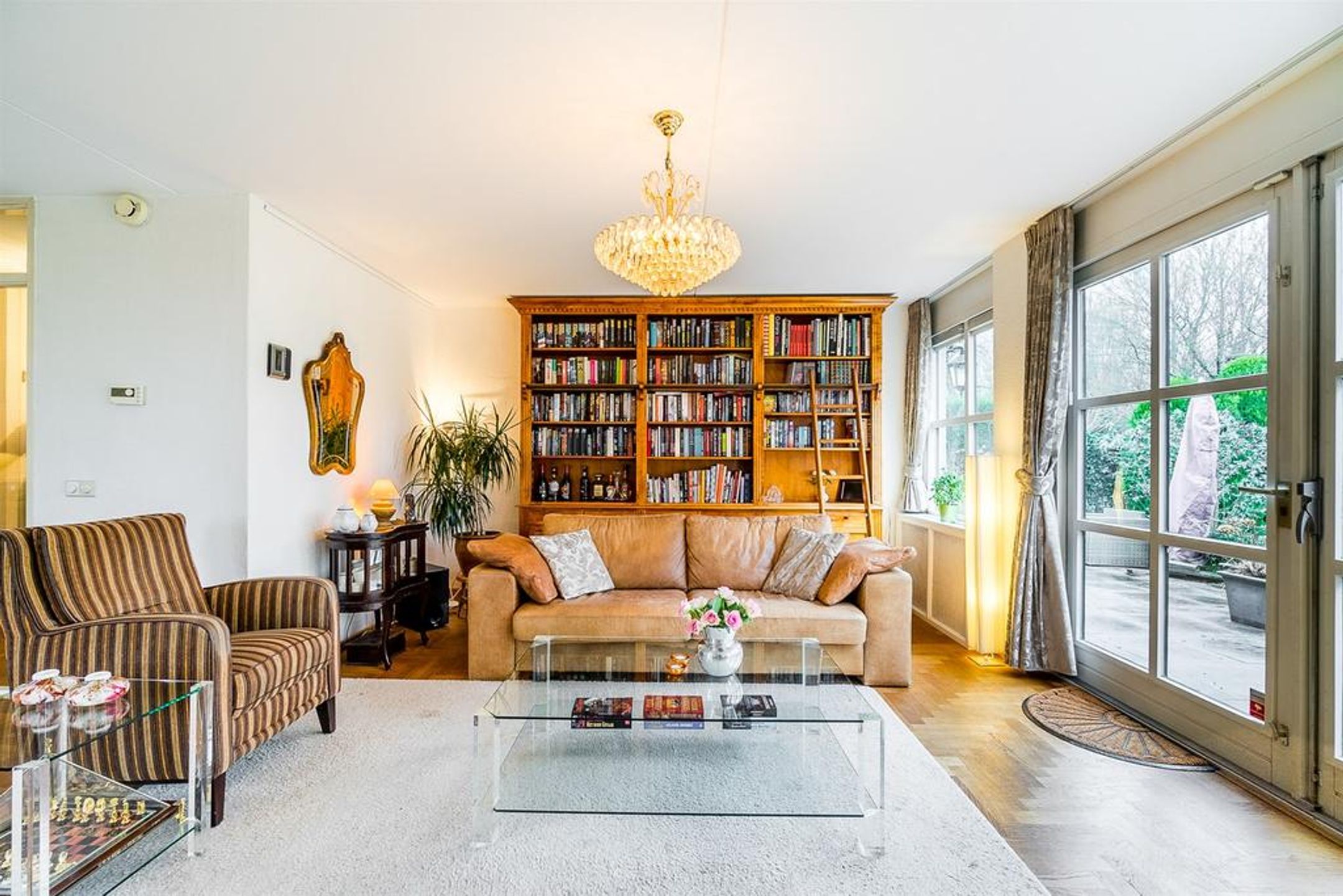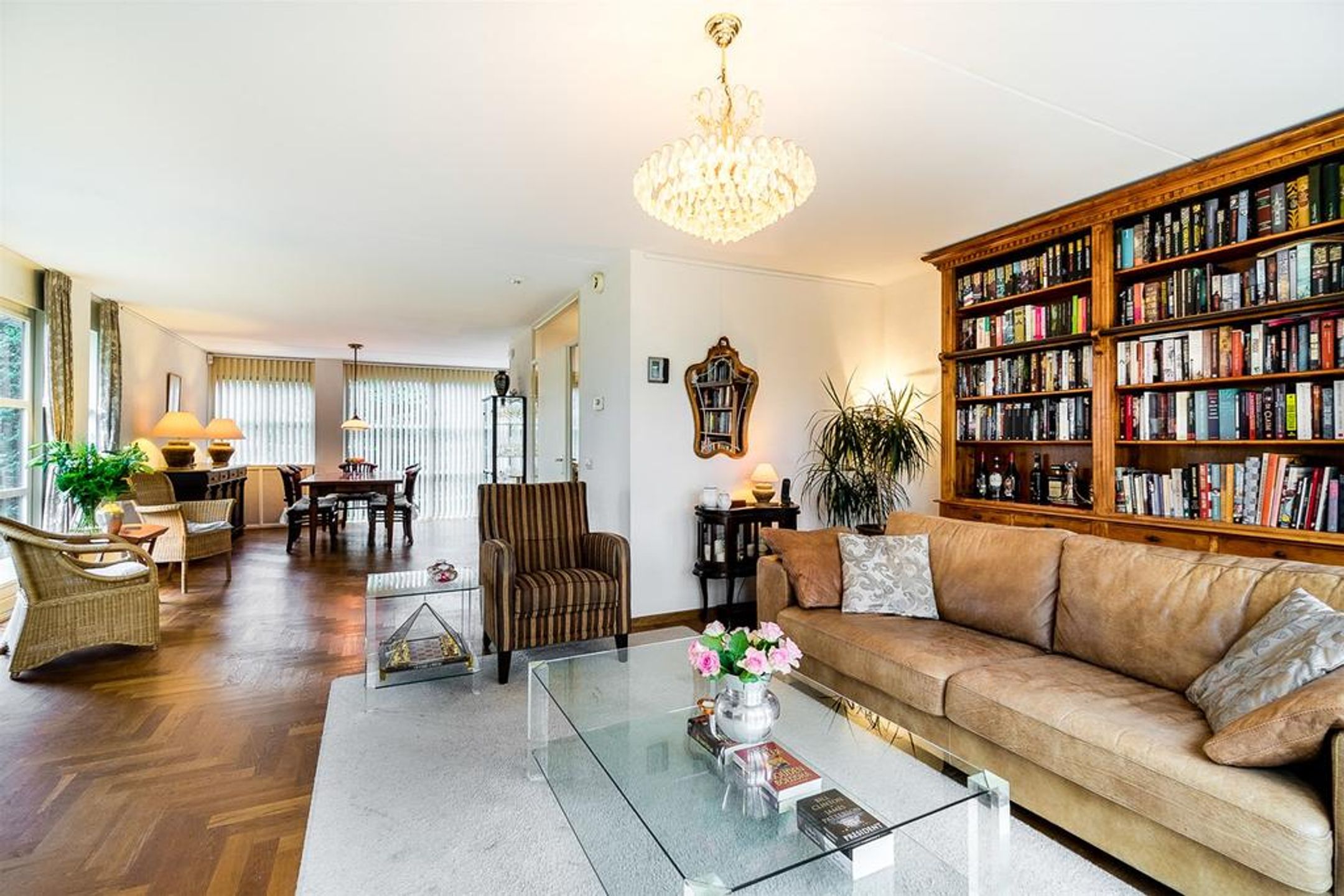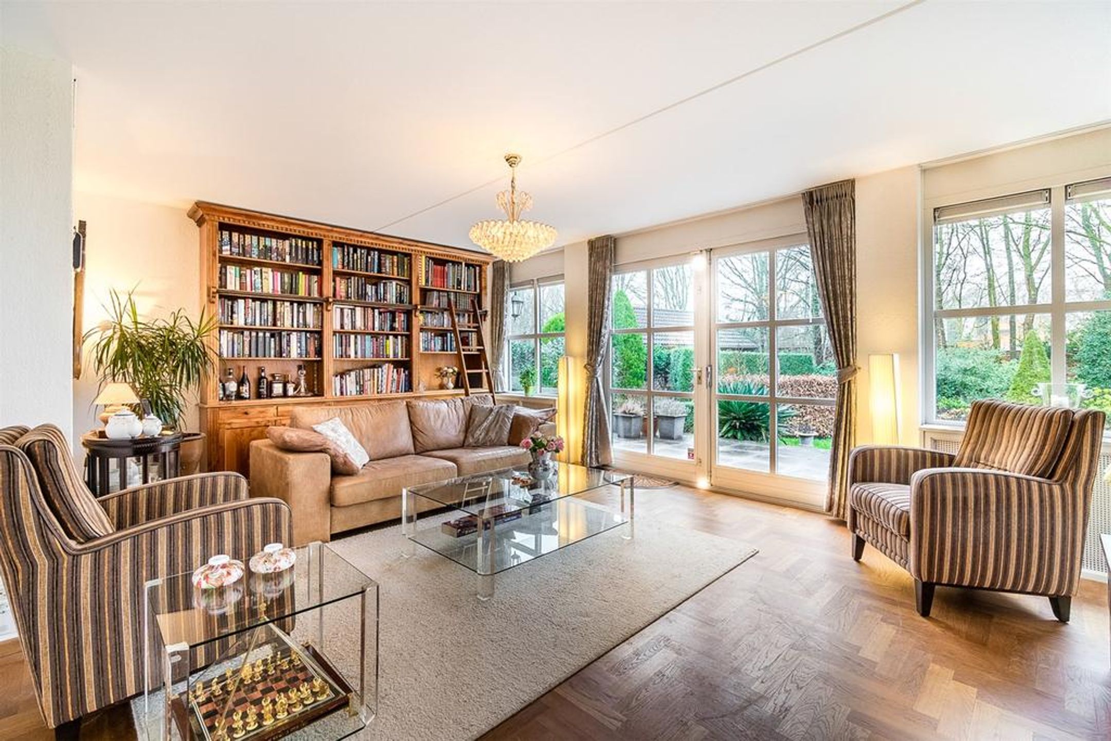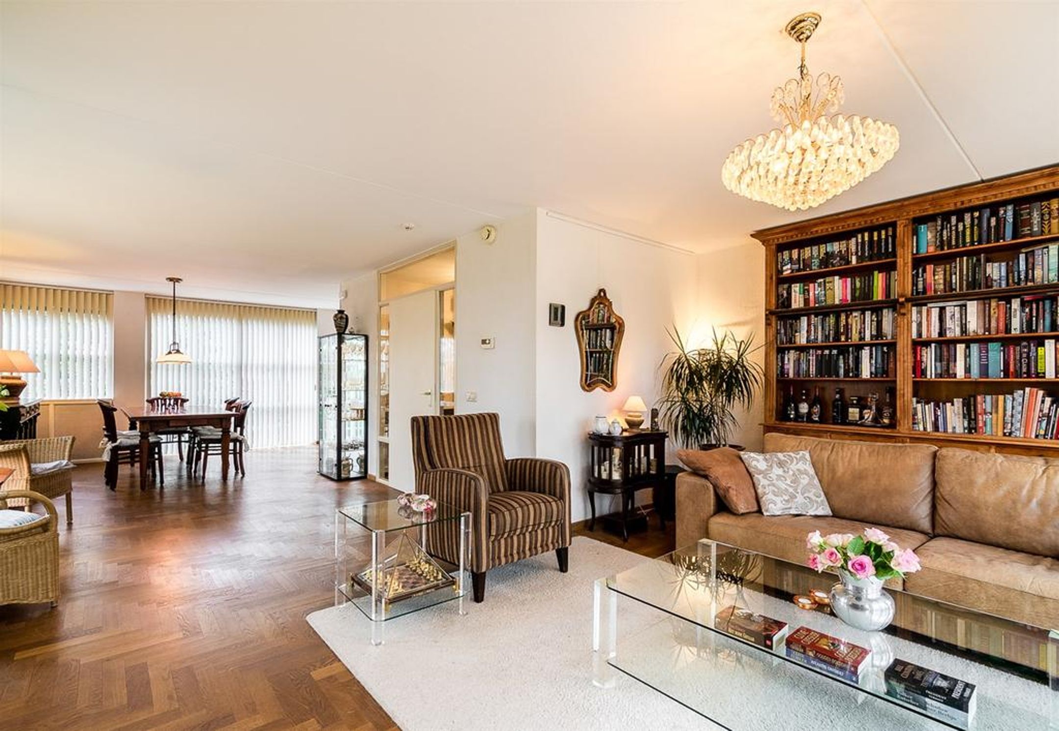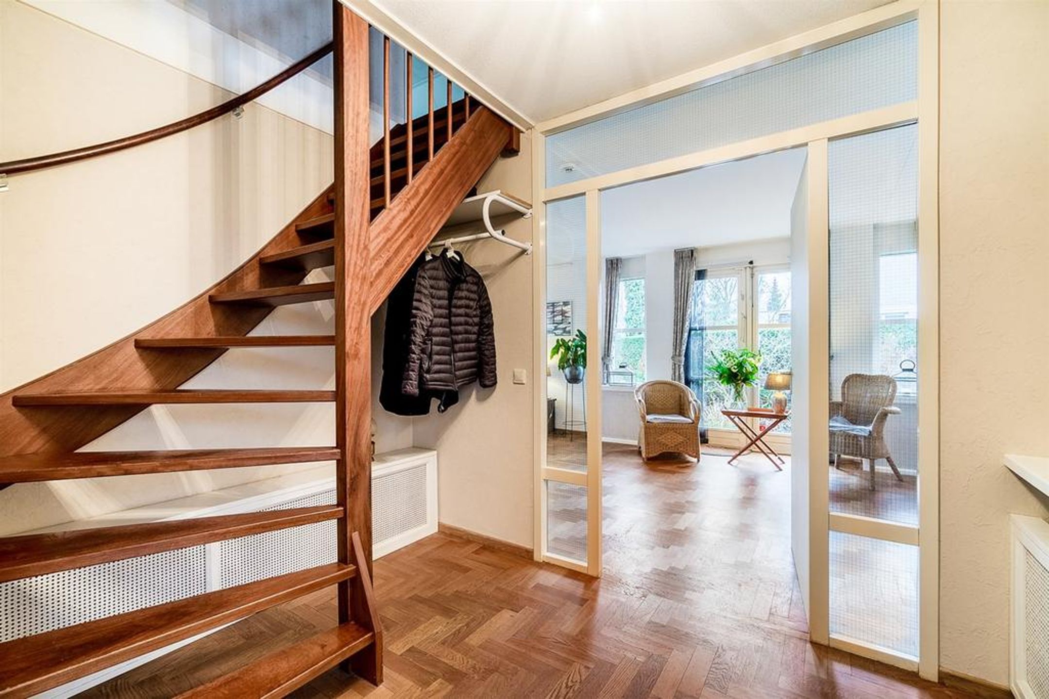 De living is heerlijk ruim, licht en verdeeld in een royale zithoek aan de achterzijde en een riante eetzone aan de voorzijde met aangrenzend de open keuken. Centraal treft u veel wenselijke verkeersruimte met dubbele openslaande deuren naar de tuin. De grote raampartij in de achtergevel is uitgevoerd met dubbele openslaande deuren waardoor u uw zonneterras en tuin kunt betreden. Zodra u deze deuren opent zult u de heerlijke rust, privacy en natuur ervaren. Rondom geniet u van prachtig zicht op uw tuin, boswal en de groene woonomgeving. De vloer is voorzien van een Eiken houten parket in stijlvol visgraat motief. De radiatoren zijn netjes omtimmerd. Er is ruimte voor het plaatsen van een grote zithoek.
