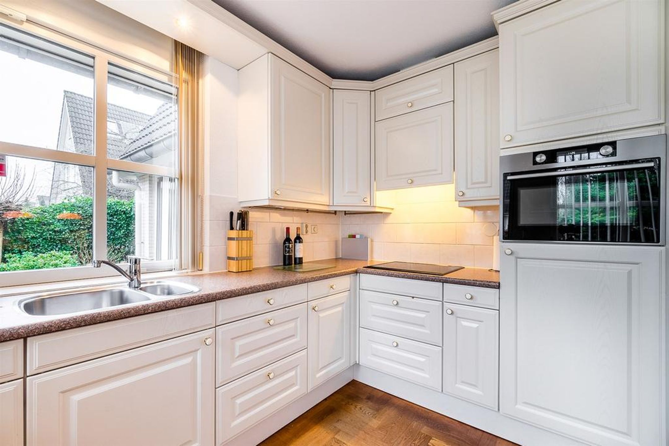 U beschikt in deze woning over een fantastische lichte eetkeuken doordat ook aan de voorkant de woning is voorzien van een mooi breed gevel vullend raamkozijn. De grote ruimte is geschikt voor het plaatsen van een royale eethoek. De keuken staat opgesteld in een hoekopstelling en is uitgevoerd in room tint kaderfronten gecombineerd met een kunststof werkblad voorzien van waterkering. U beschikt over een 4-pits inductie kookplaat, een combi-ovenmagnetron (2017), een BOSCH vaatwasautomaat, een inbouw koelkast en een RVS spoelbak.