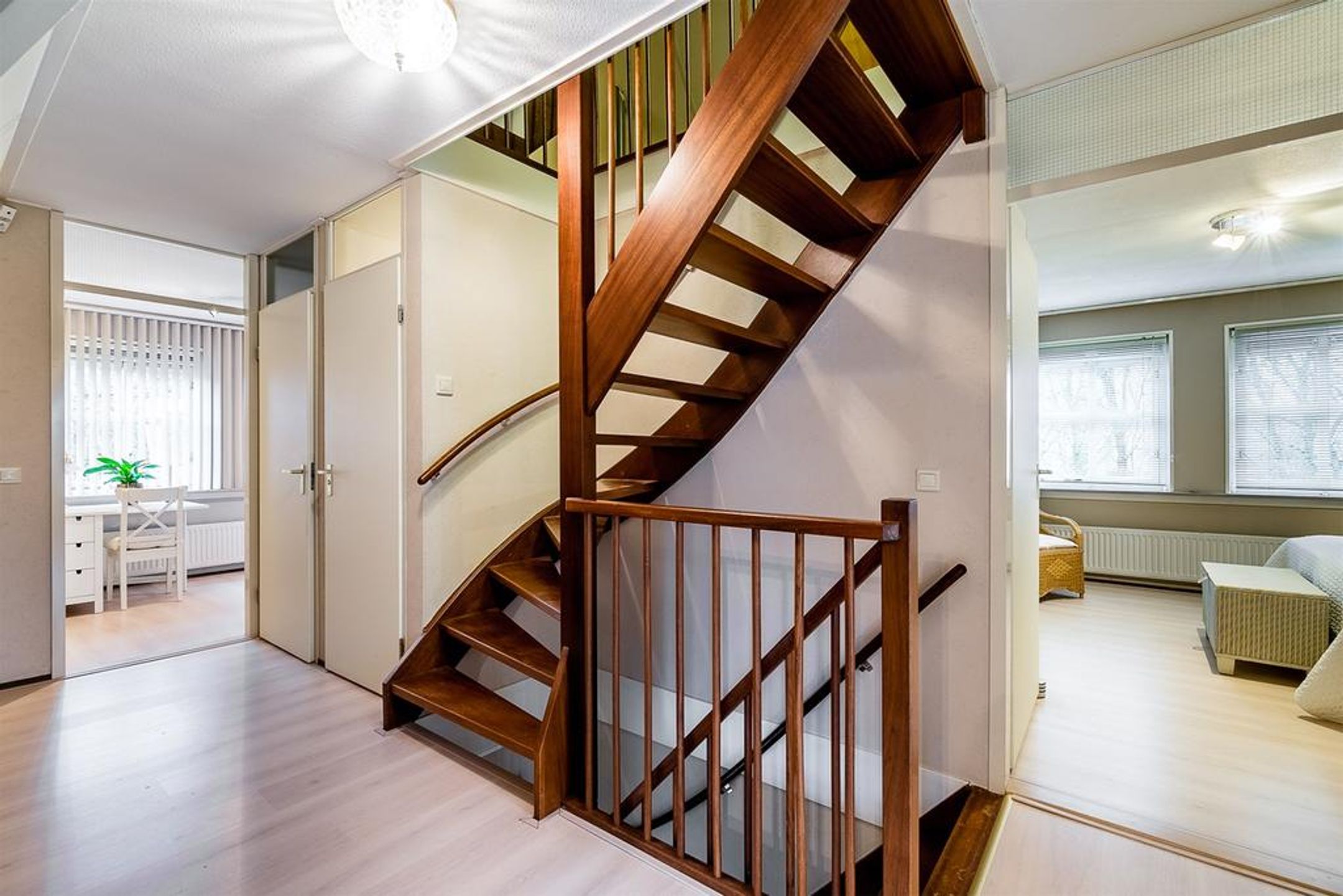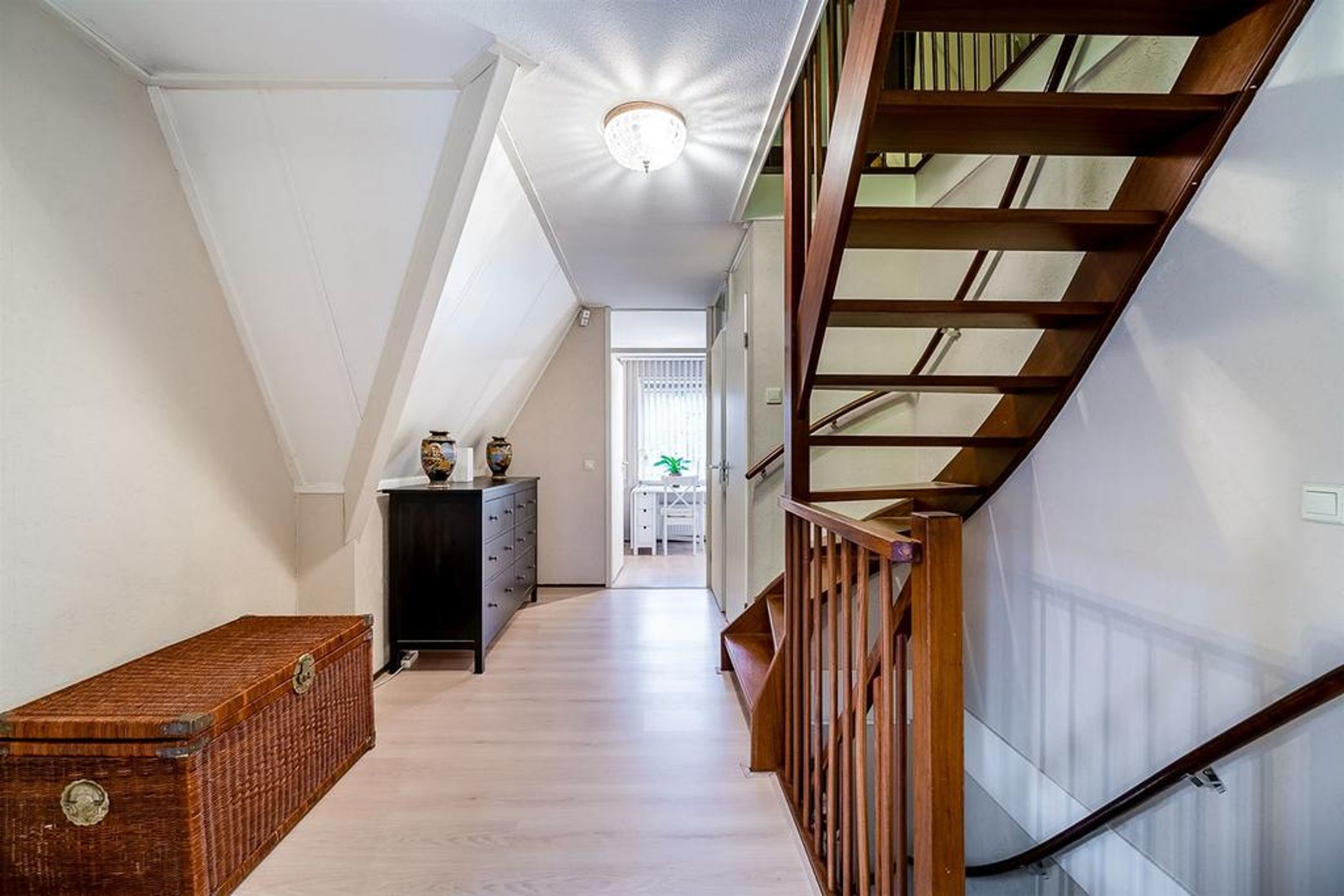 1e verdieping Over open hardhouten trap bereikt u de ruime overloop op de 1e verdieping welke u toegang biedt tot de ruime master-bedroom, 2 in grootte variërende slaapkamers, de badkamer, de separate toiletruimte en de praktische wasruimte. Op de vloer ligt een fraai laminaat.