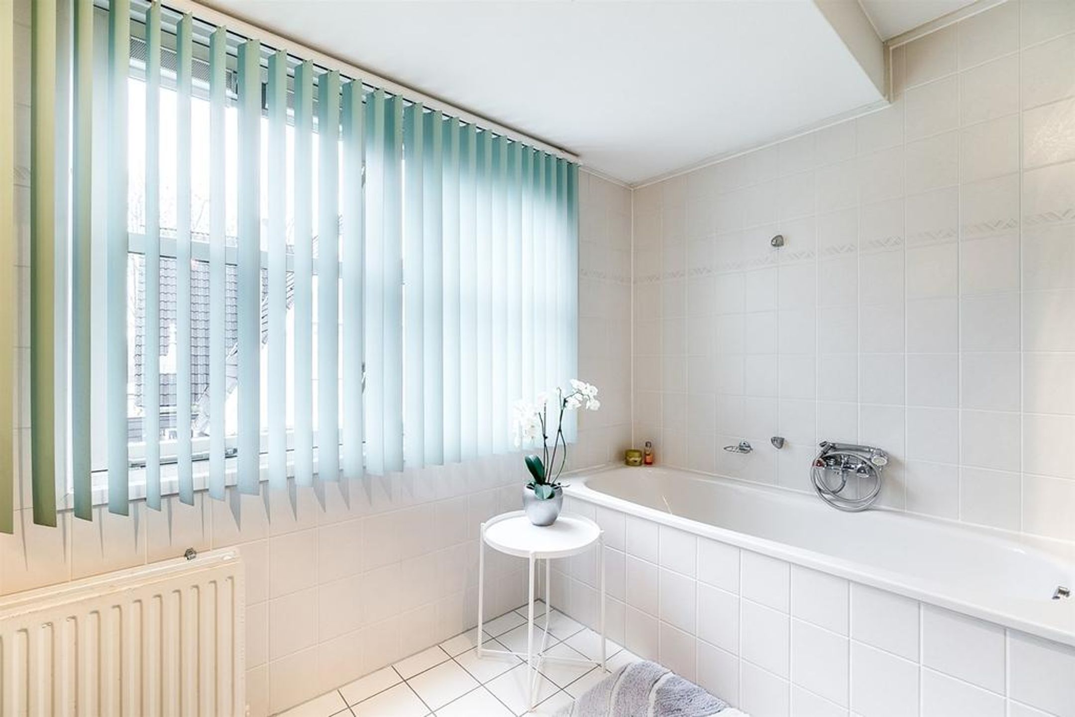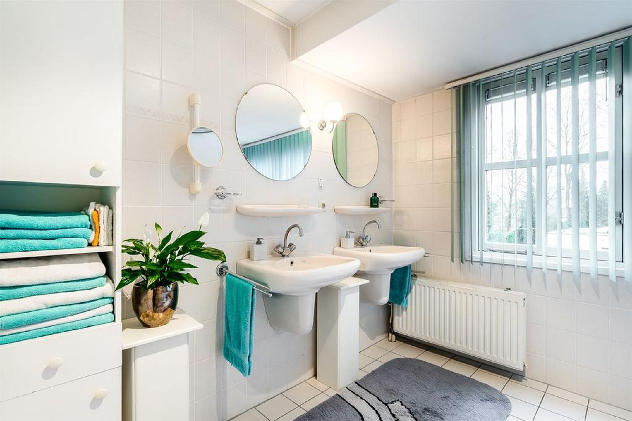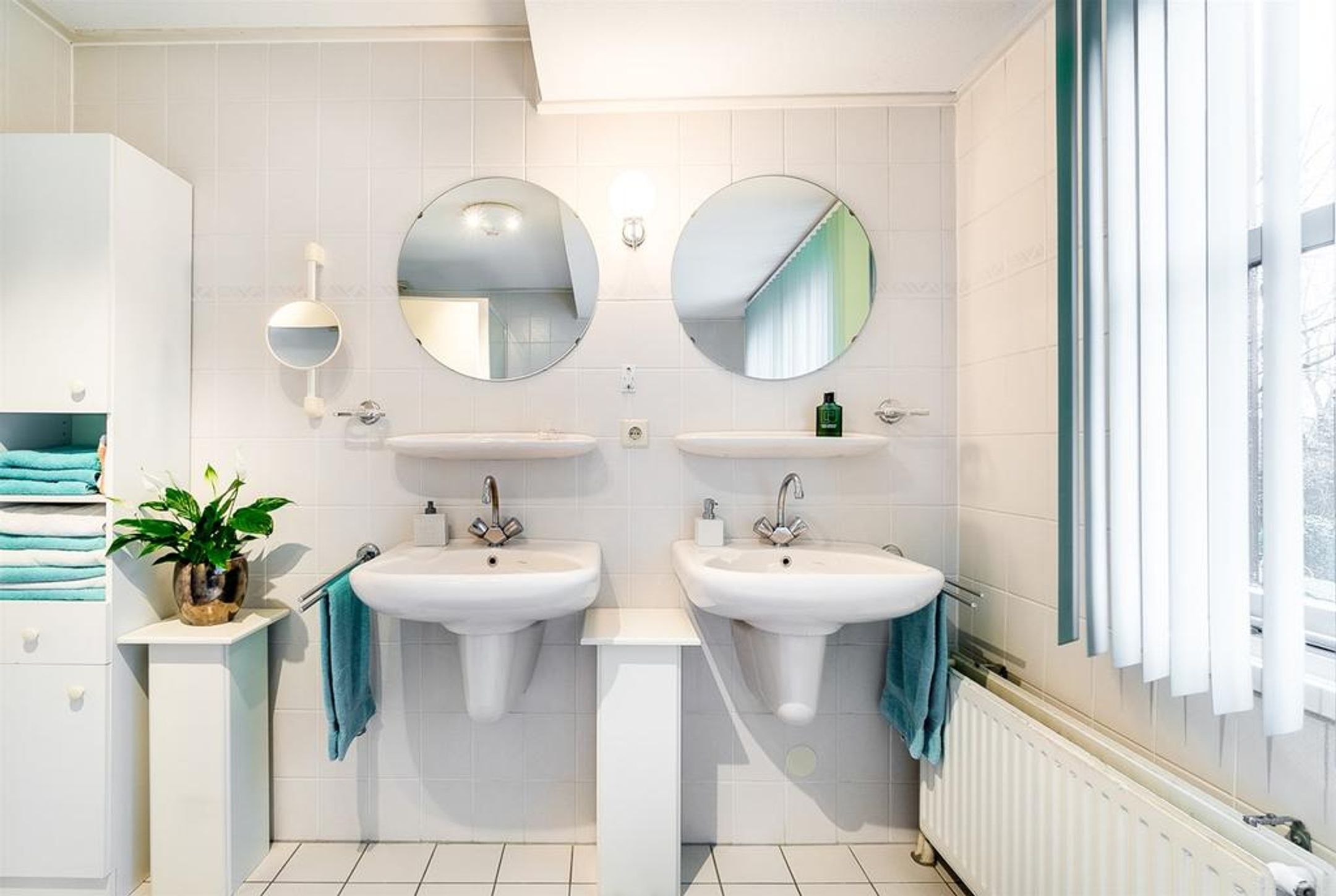 De ruime badkamer is betegeld met lichte wand- en vloertegels en beschikt over een ligbad voorzien van separate handdouche, een douchecabine voorzien van glazen draaideur en thermostaatkraan, en dubbele wastafels voorzien van planchet, spiegels en verlichting. De ramen in de dakkapel dragen zorg voor wenselijk daglicht en ventilatie. Het toilet bevindt zich in de separate toiletruimte op de overloop.