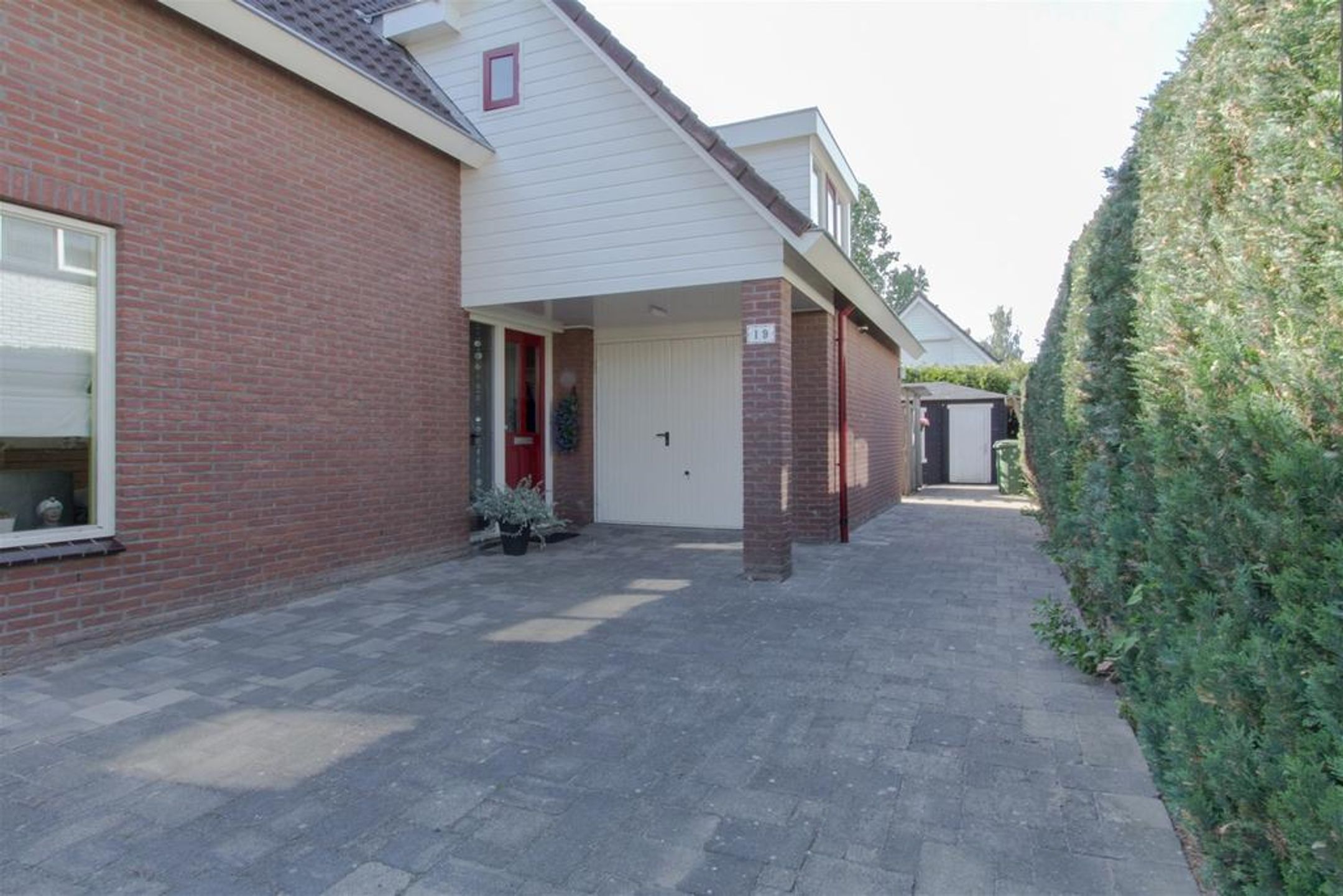 De voortuin en oprit is geheel bestraat en onderhoudsarm. In de voortuin treft u verhoogde plantenbakken en aan weerszijden van de woning groene hagen. De oprit voor de garage biedt ruimte aan 3 auto's en in de hoek treft u de overdekte entree.
