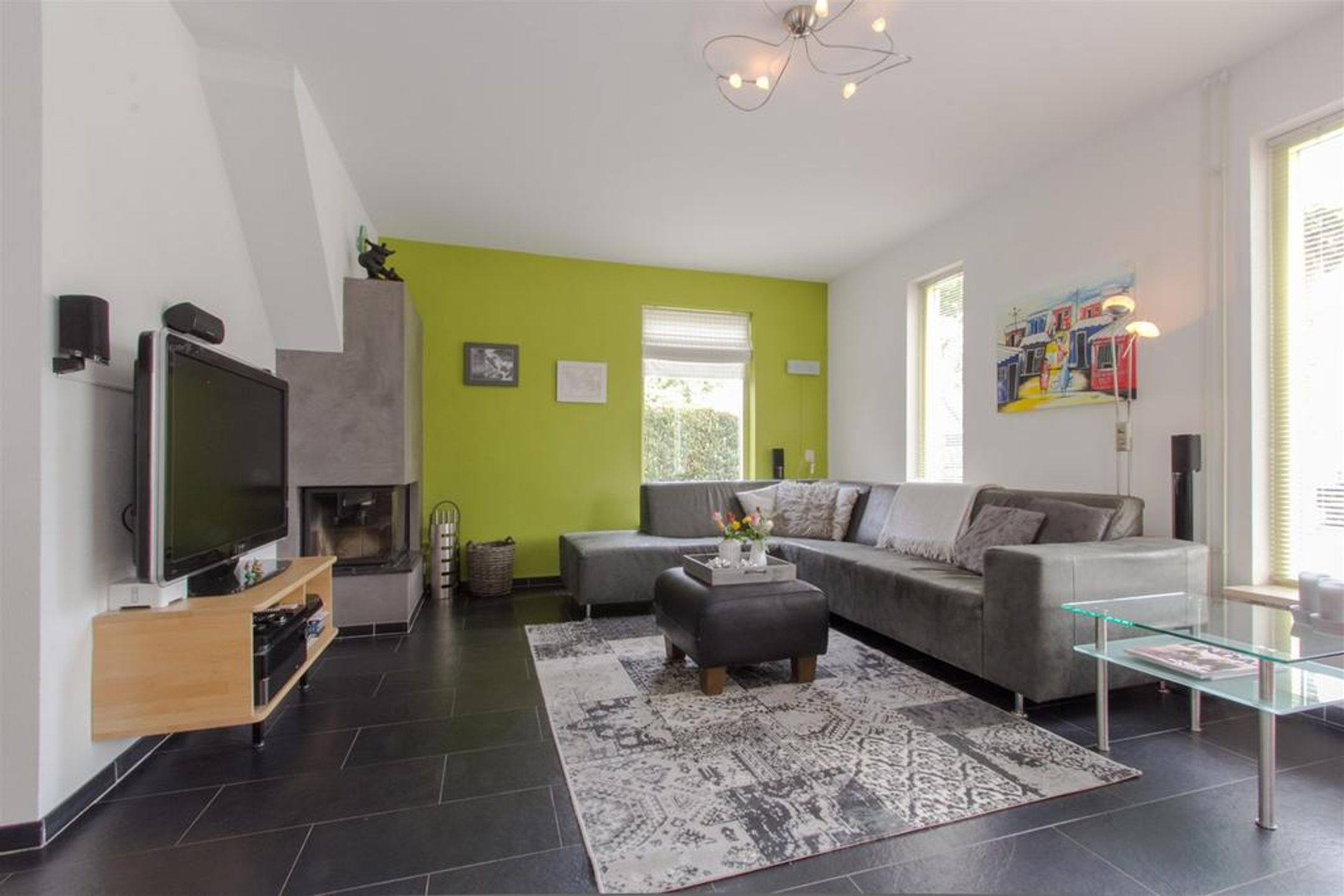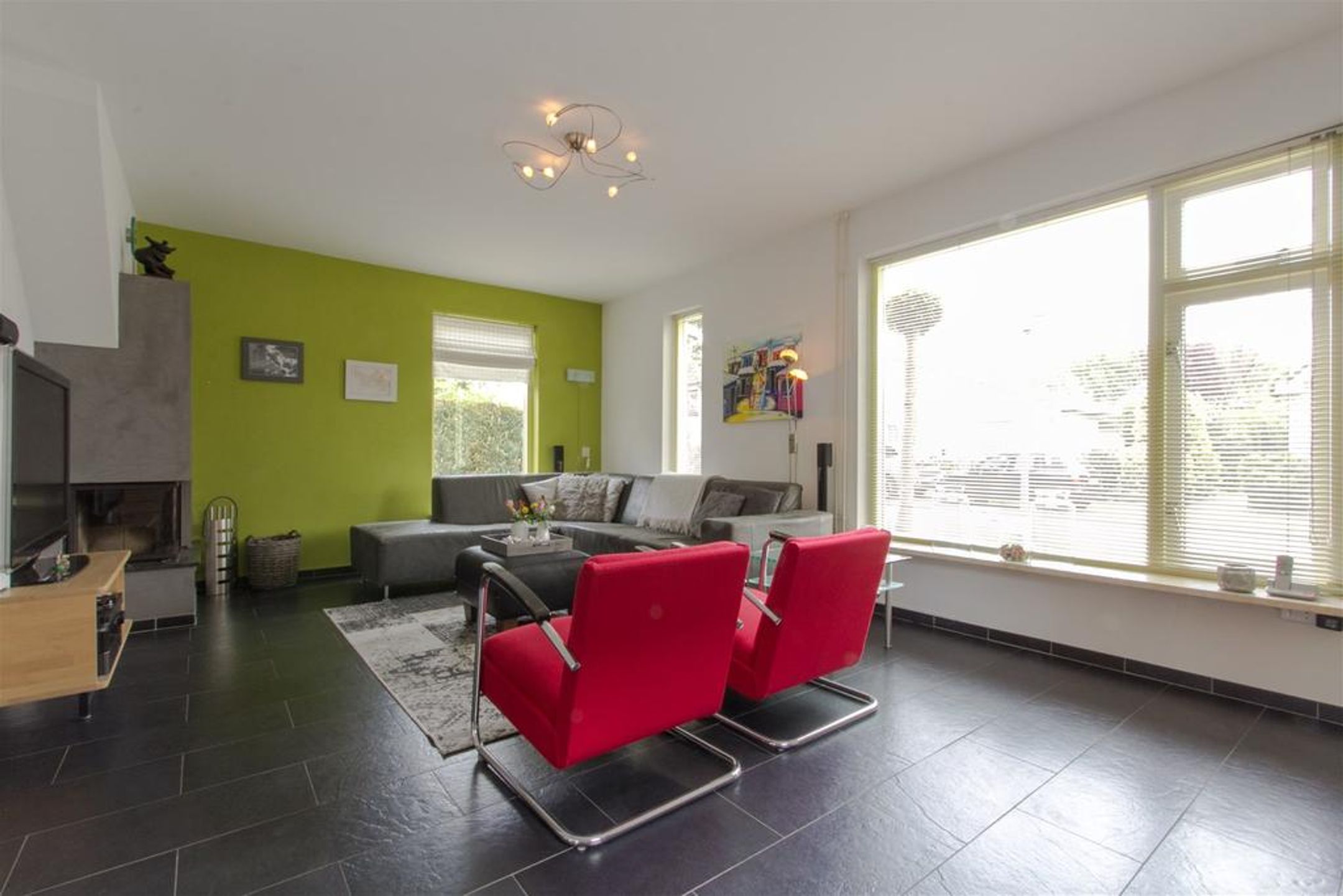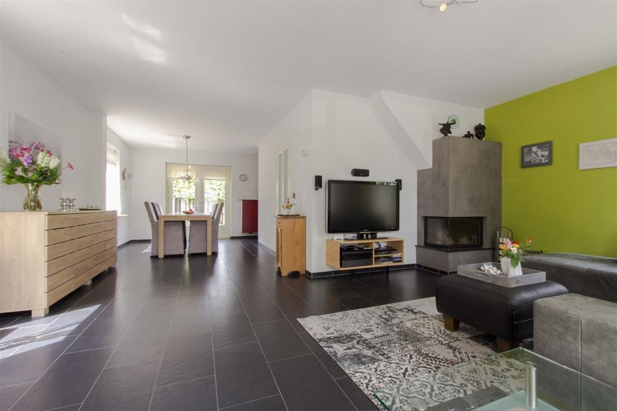 De ruime lichte living is in 2015 voorzien van een glad gestuct plafond. De wanden zijn afgewerkt met een fijnkorrelige spachtelputz. Op de vloer liggen keramische leisteen-look vloertegels. De comfortabele vloerverwarming is tevens hoofdverwarming waardoor deze ruimte radiatorloos is. De grote raampartijen bieden zicht op de groene woonomgeving. Centraal staat de sfeervolle hout gestookte open haard met liftdeur. (In de gevel bevind zich nog een kleine kluis.)