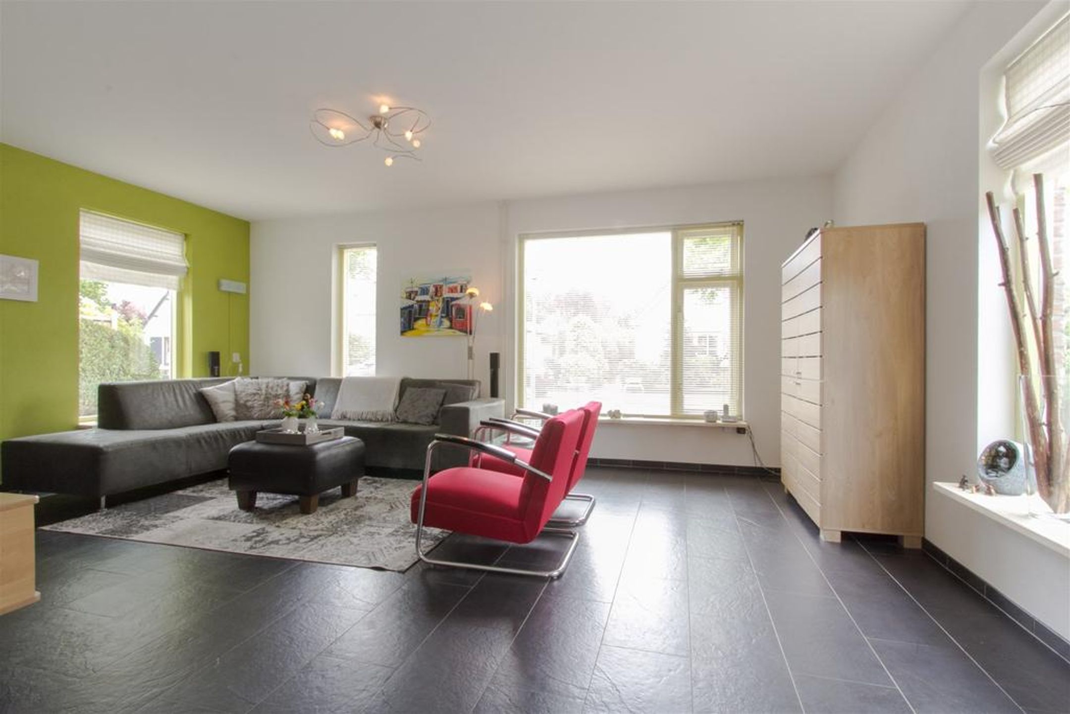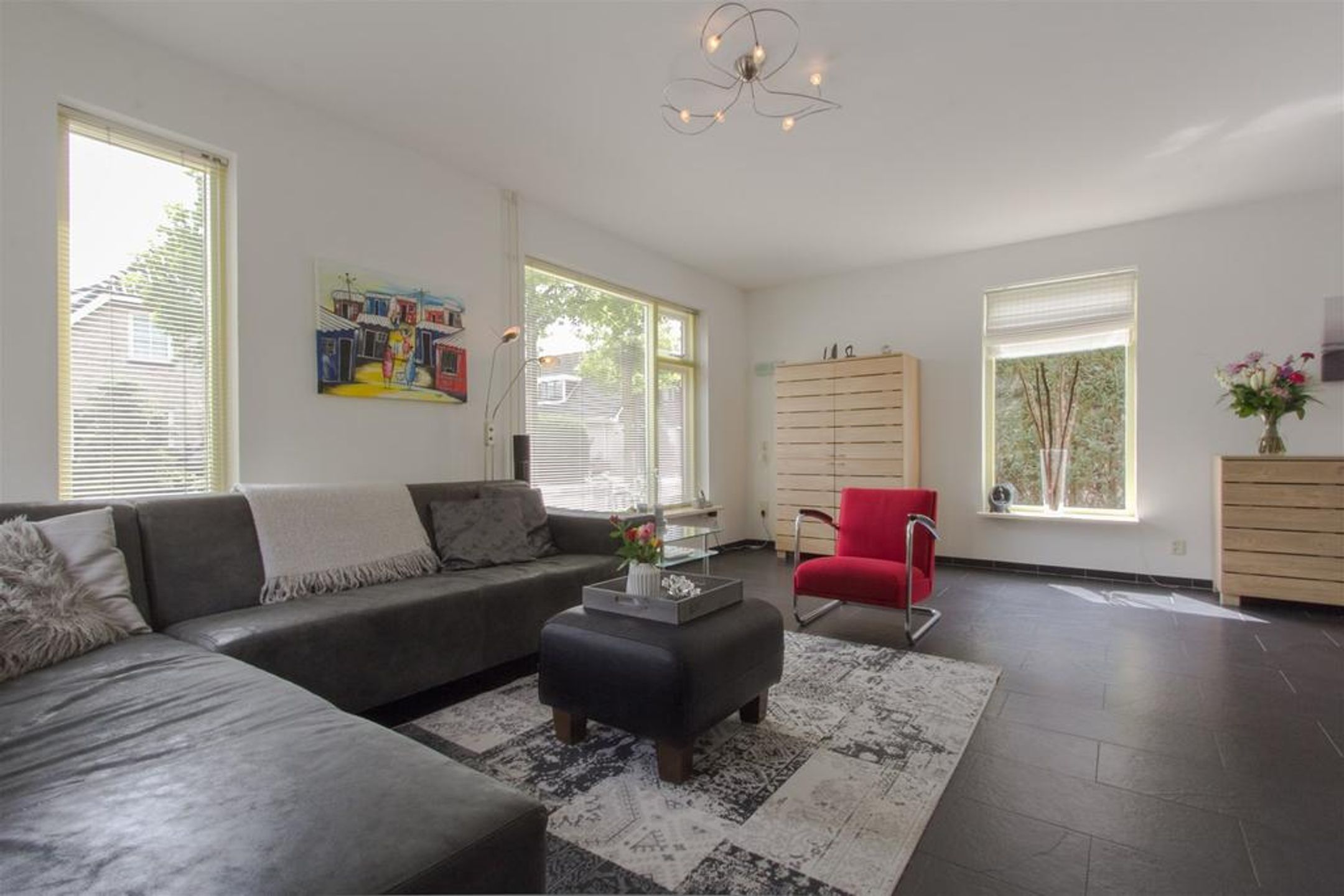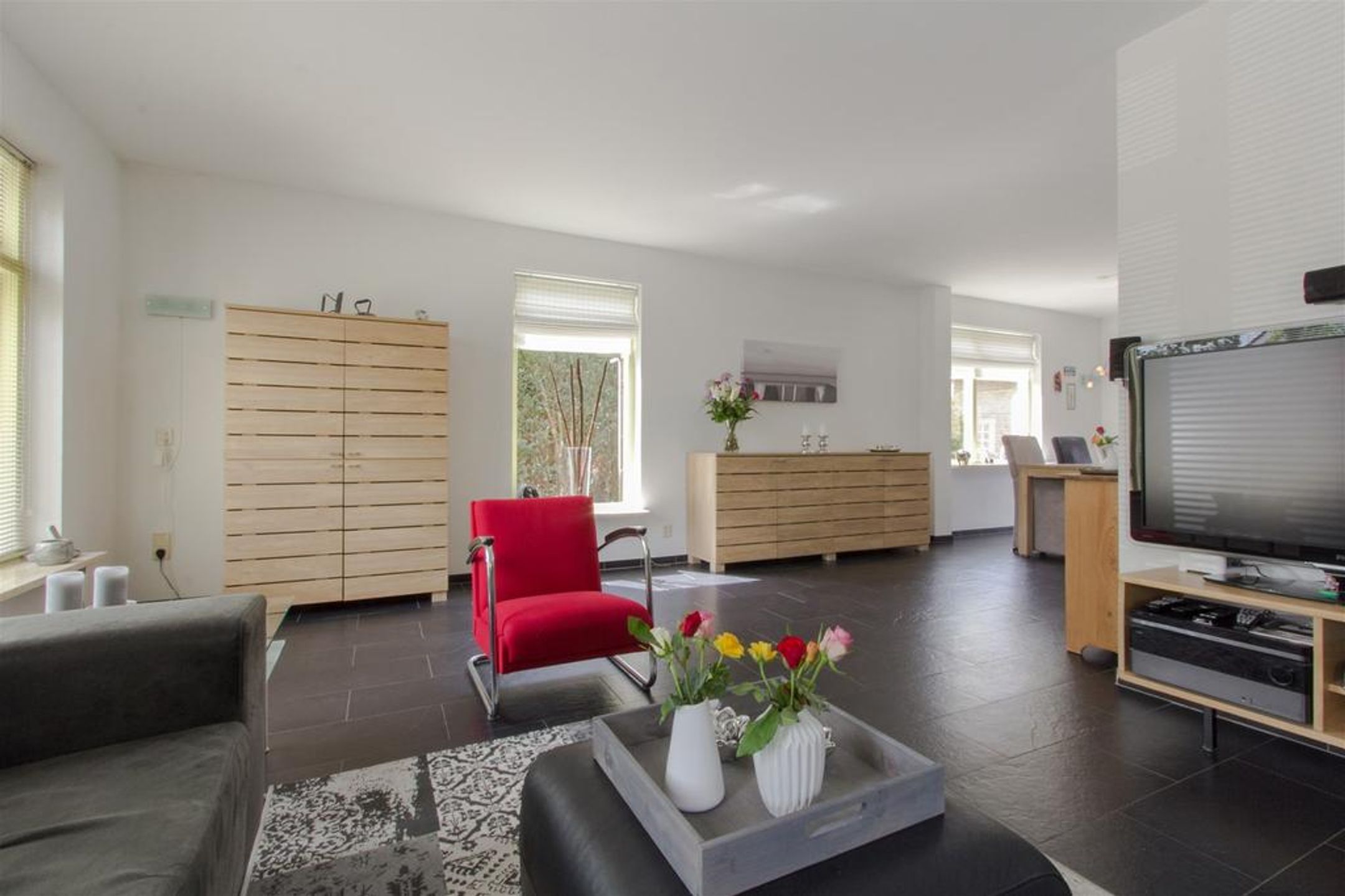 De ruime lichte living is in 2015 voorzien van een glad gestuct plafond. De wanden zijn afgewerkt met een fijnkorrelige spachtelputz. Op de vloer liggen keramische leisteen-look vloertegels. De comfortabele vloerverwarming is tevens hoofdverwarming waardoor deze ruimte radiatorloos is. De grote raampartijen bieden zicht op de groene woonomgeving. Centraal staat de sfeervolle hout gestookte open haard met liftdeur. (In de gevel bevind zich nog een kleine kluis.)
