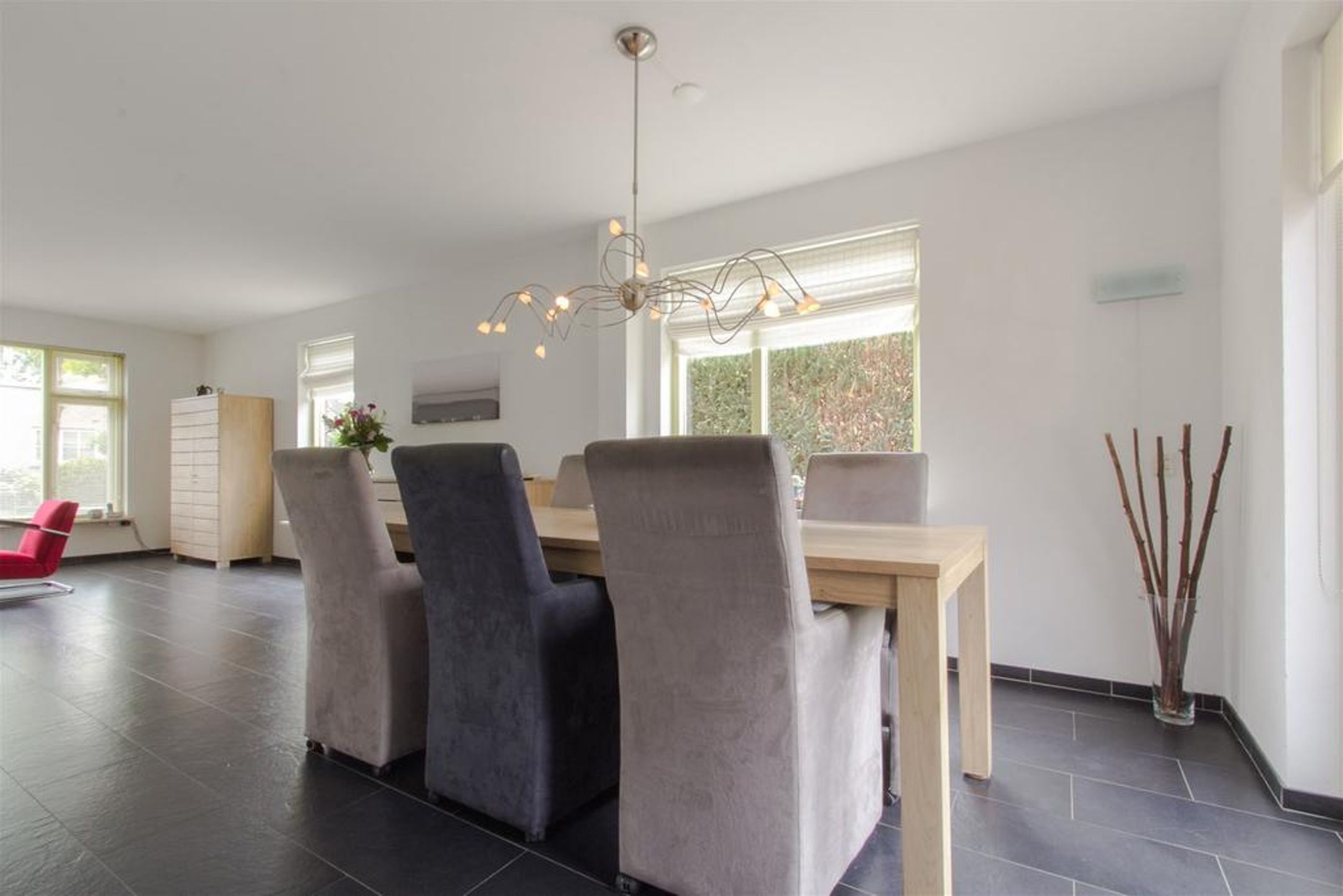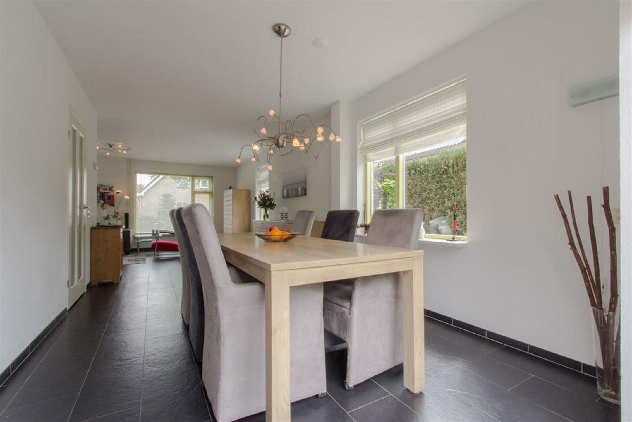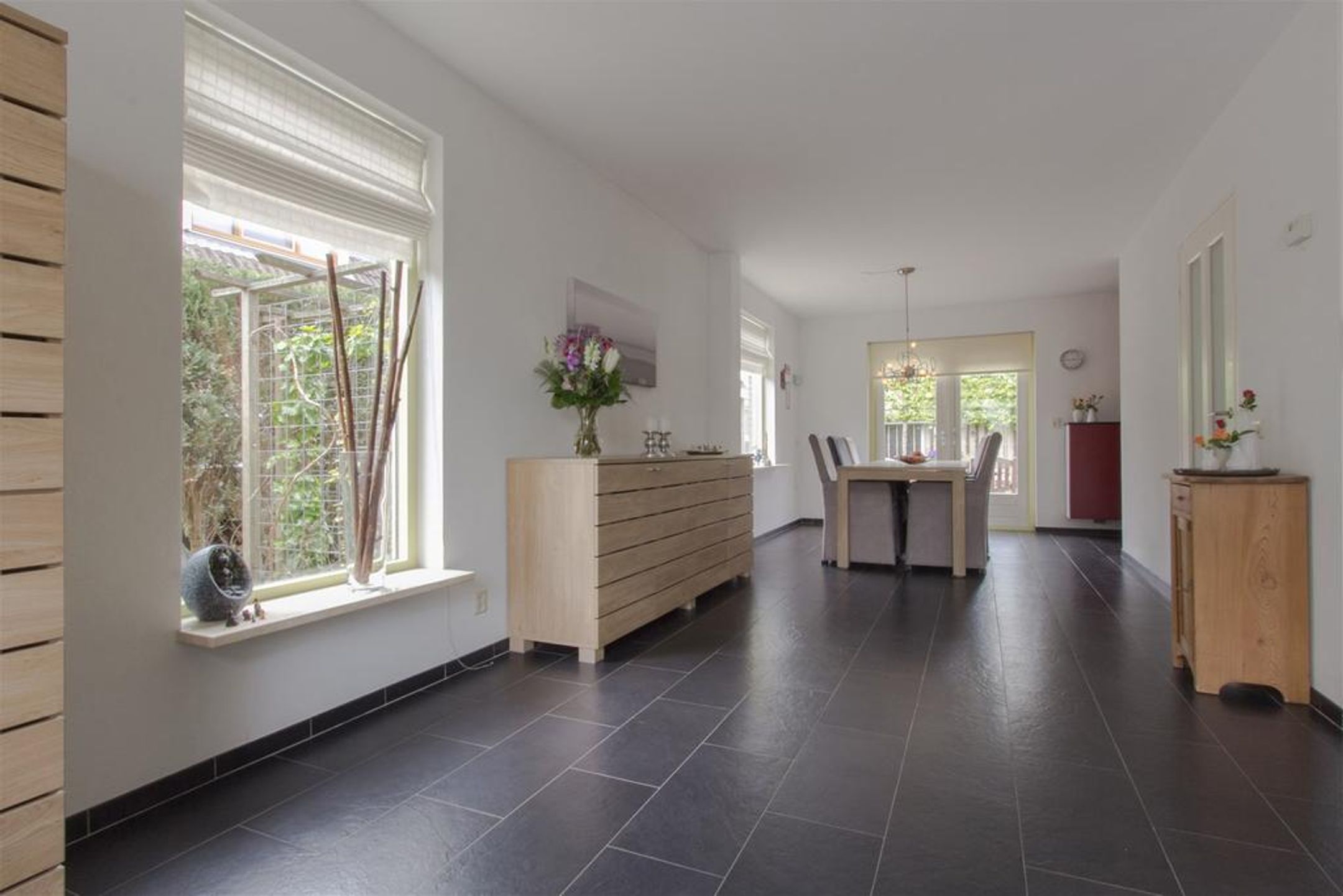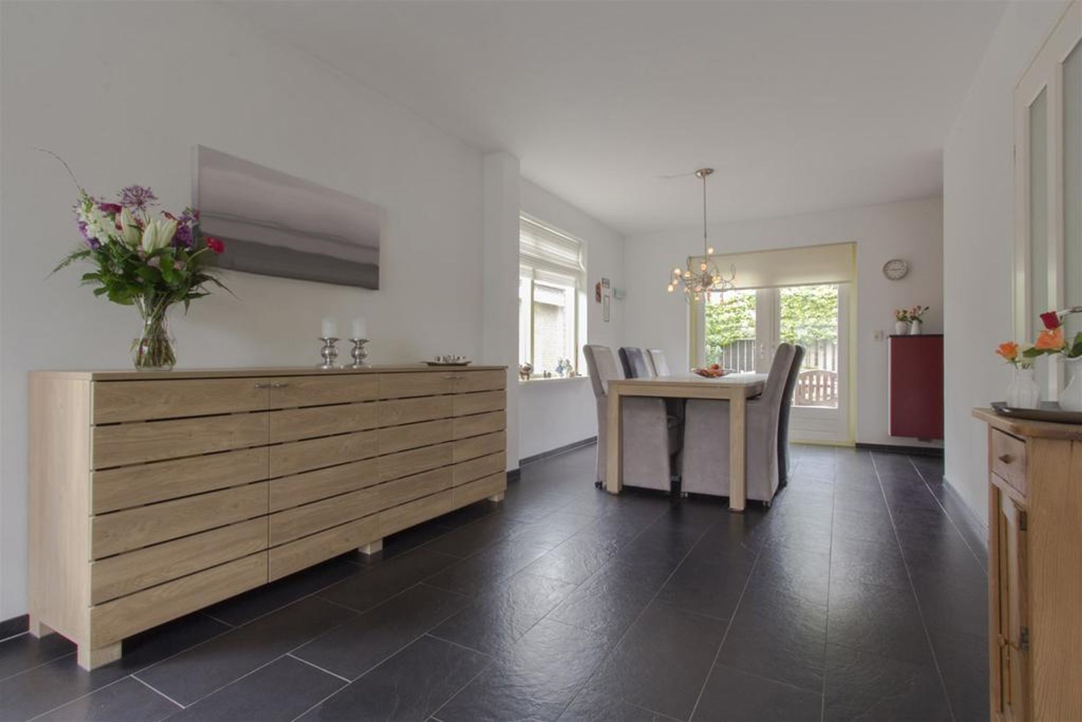 T.p.v. de eethoek bevinden zich dubbele openslaande deuren die toegang en zicht bieden tot de zij- en achtertuin. Aangrenzend bevindt zich de open keuken.
