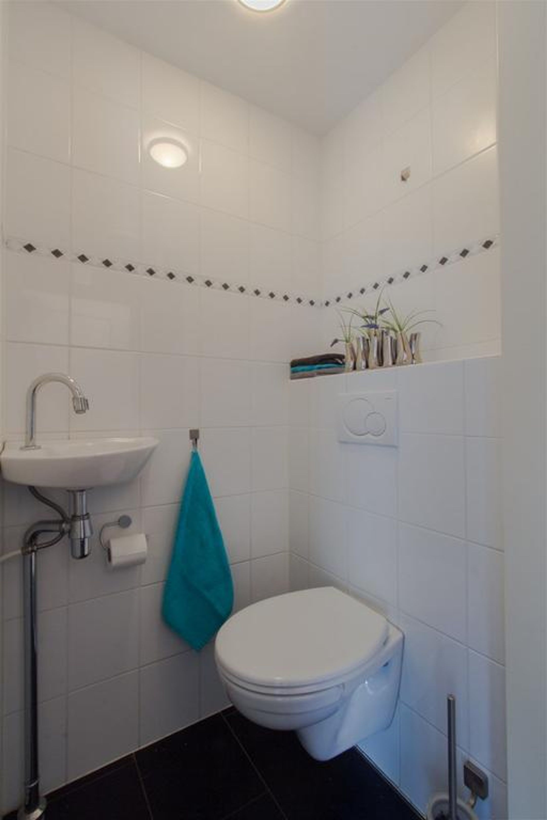 De toiletruimte is betegeld met witte tegels en voorzien van vrijhangend closet met inbouwreservoir en een fonteintje.