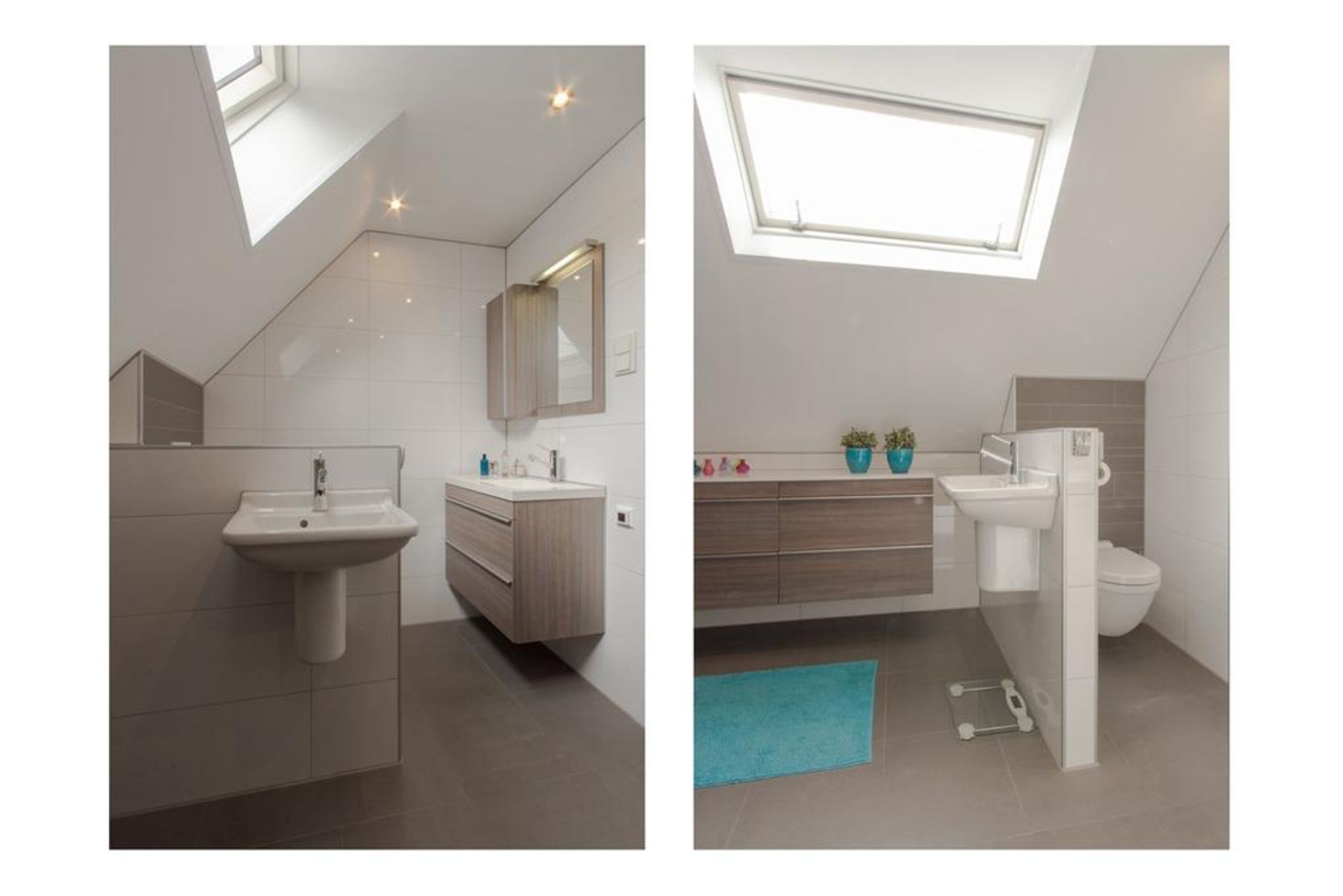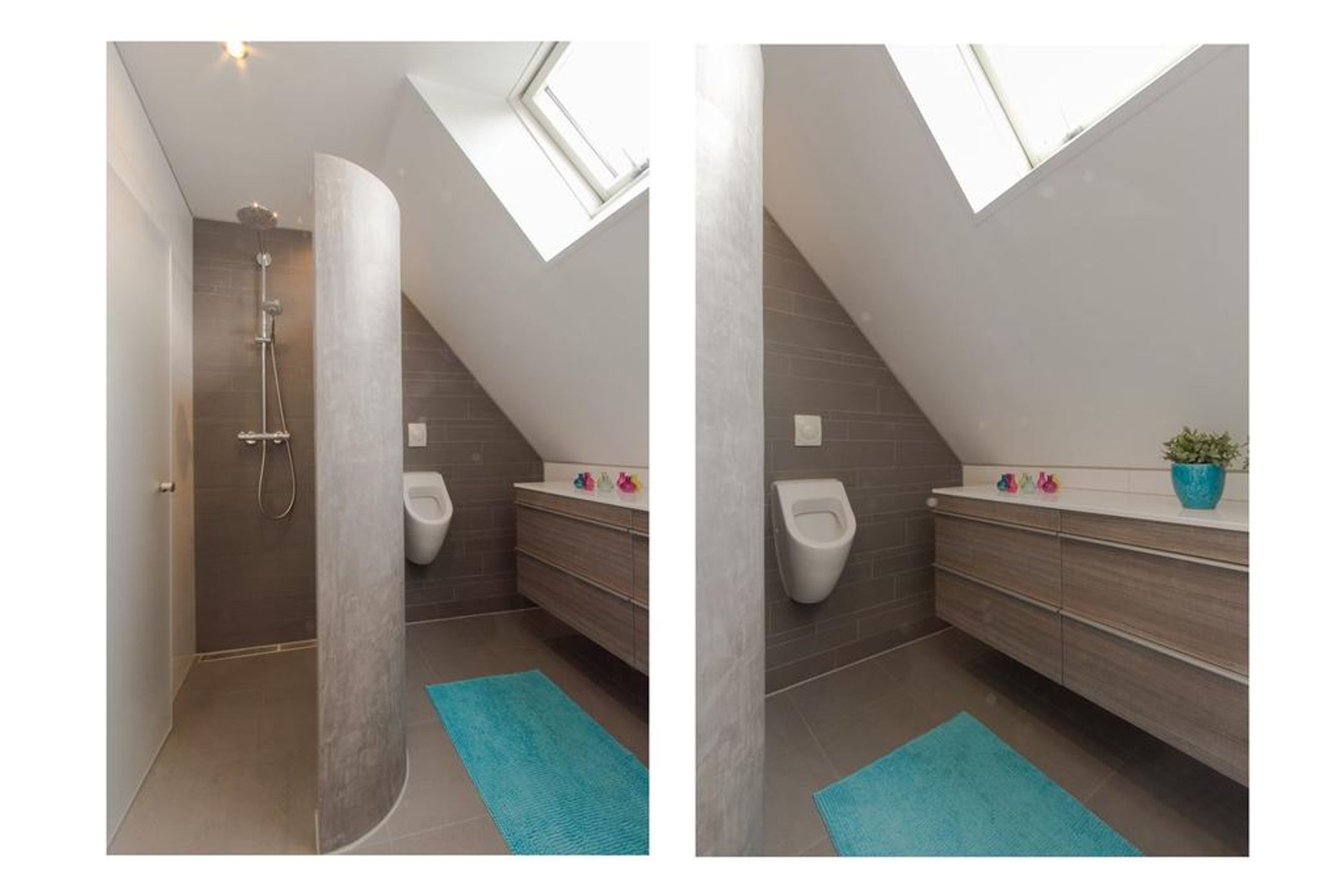 De in 2015 volledig vernieuwde moderne badkamer is voorzien van een glad gestuct plafond waar led-spots in zijn verwerkt. De wanden zijn betegeld met grote witte hoogglans gerectificeerde wandtegels en op de vloer liggen grijze vloertegels met daaronder comfortabele elektrische vloerverwarming. Voorts treft u een inloopdouche voorzien van hardglazen draaideur, regendouche, handdouche en thermostaatkraan. De douchewand loopt wat gebogen en is met betonlook stucwerk afgewerkt. Ook treft u een wasmeubel met geïntegreerde waskom en 2 lades, bovenkast, spiegel met verlichting, een extra brede wandkast met 4 lades, een tweede wastafel, een vrijhangend closet met inbouwreservoir en een extra urinoir.