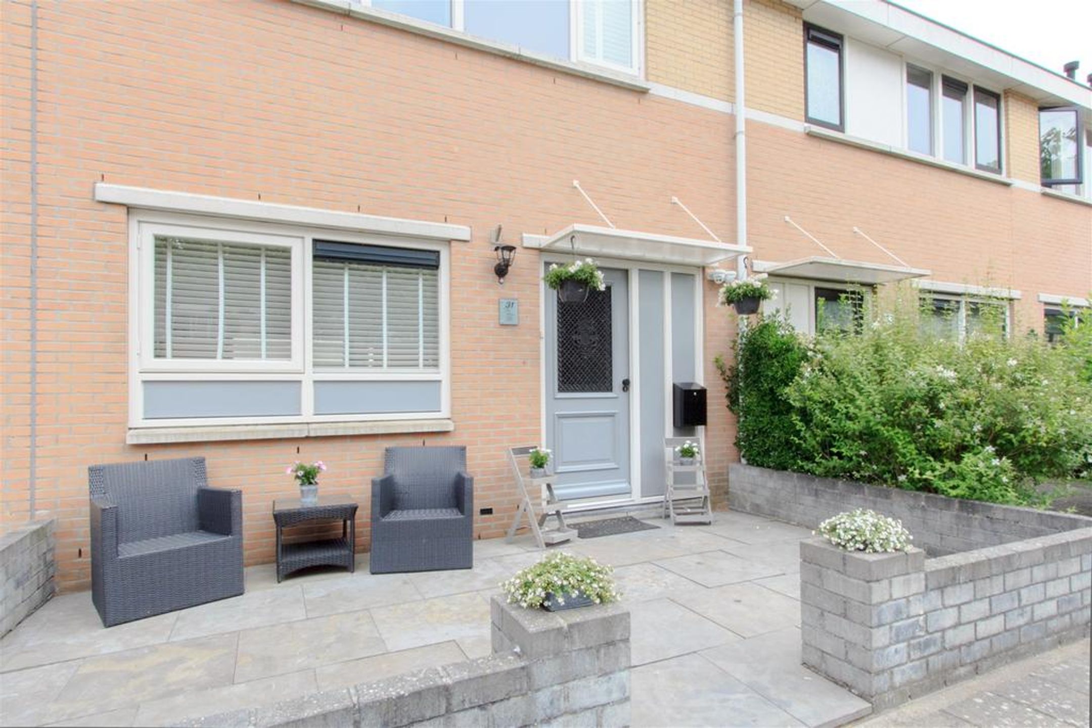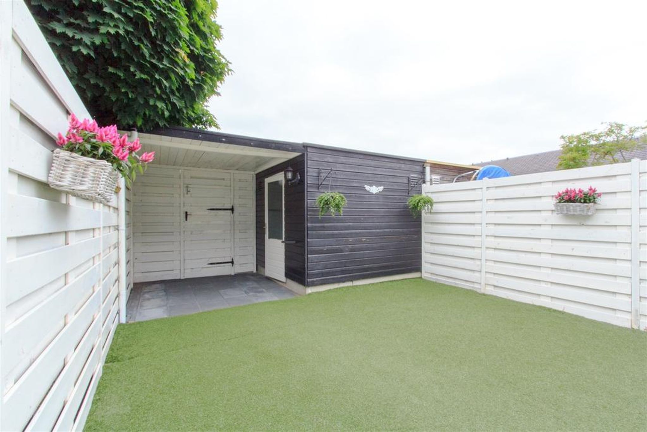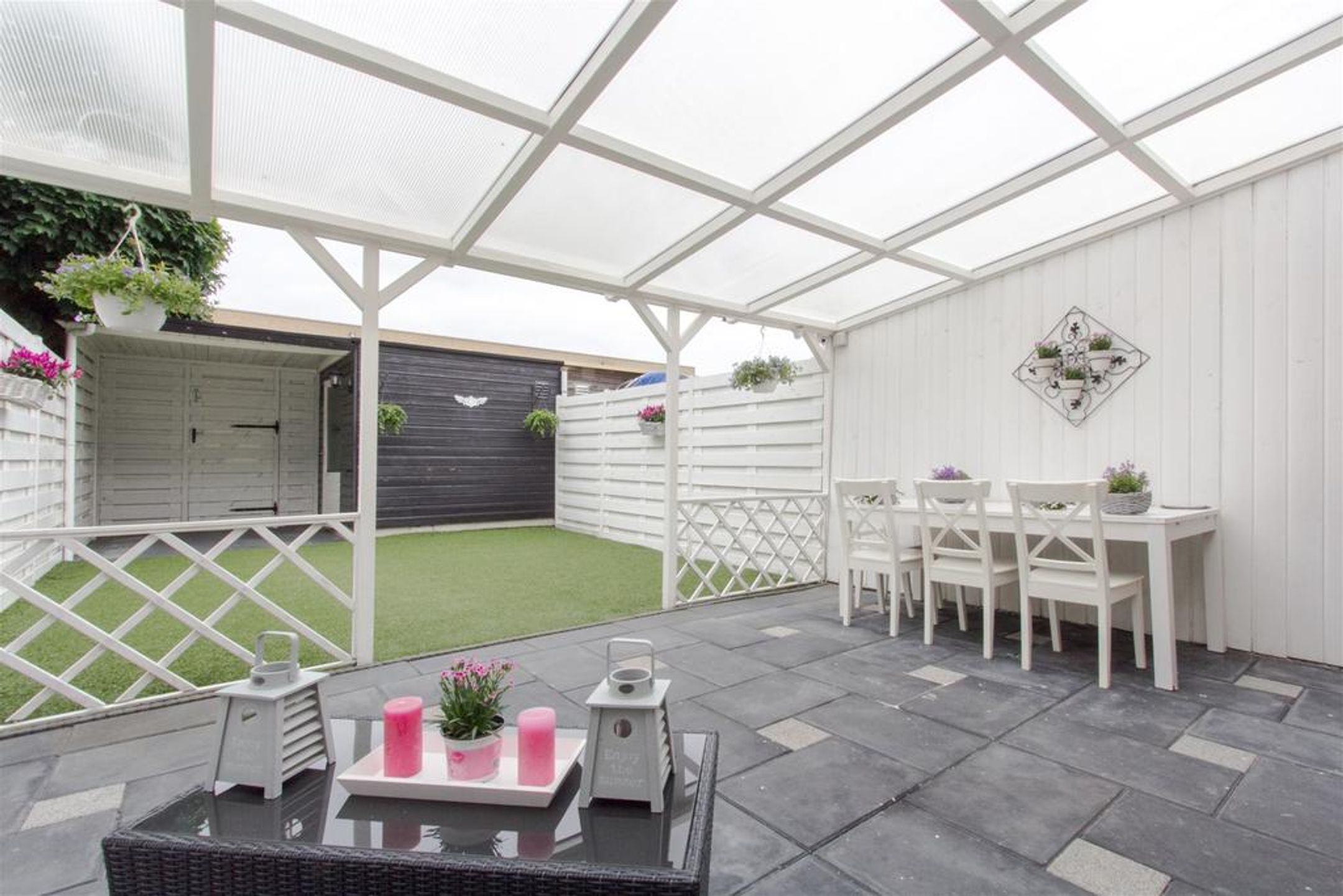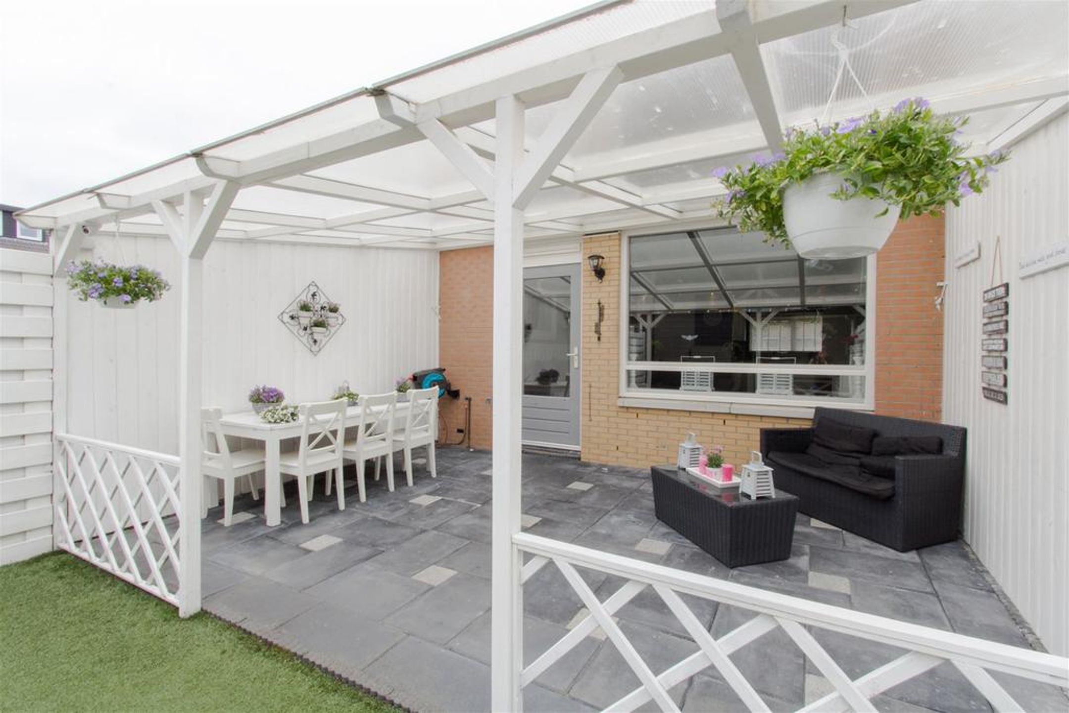 Extern De voortuin is aangelegd met grote tegels en rondom voorzien van een gemetseld muurtje met bij de entree 2 gemetselde poeren. De achtertuin is rondom voorzien van een wit geschilderde schutting. Aan de gevel is een gevel brede overkapping geplaatst met helder plexiglas dak. Het terras t.p,v. de overkapping is voorzien van sierbestrating. Voorts treft u een gazon (kunstgras), een praktische vrijstaande berging, een achterom en aan de gevel een buitenkraan.
