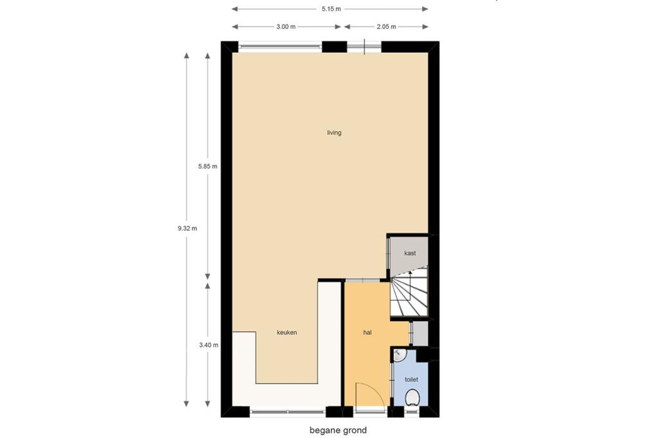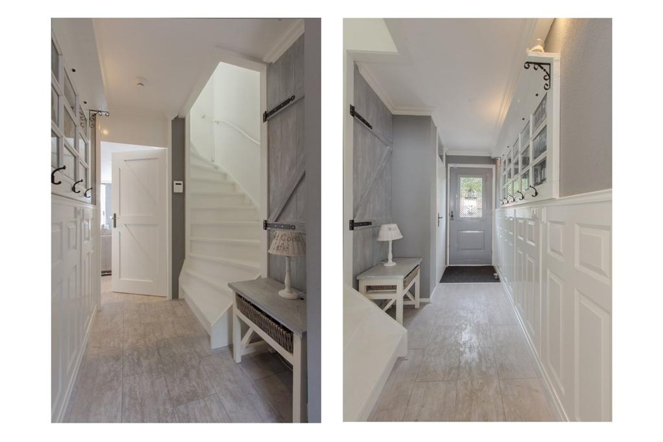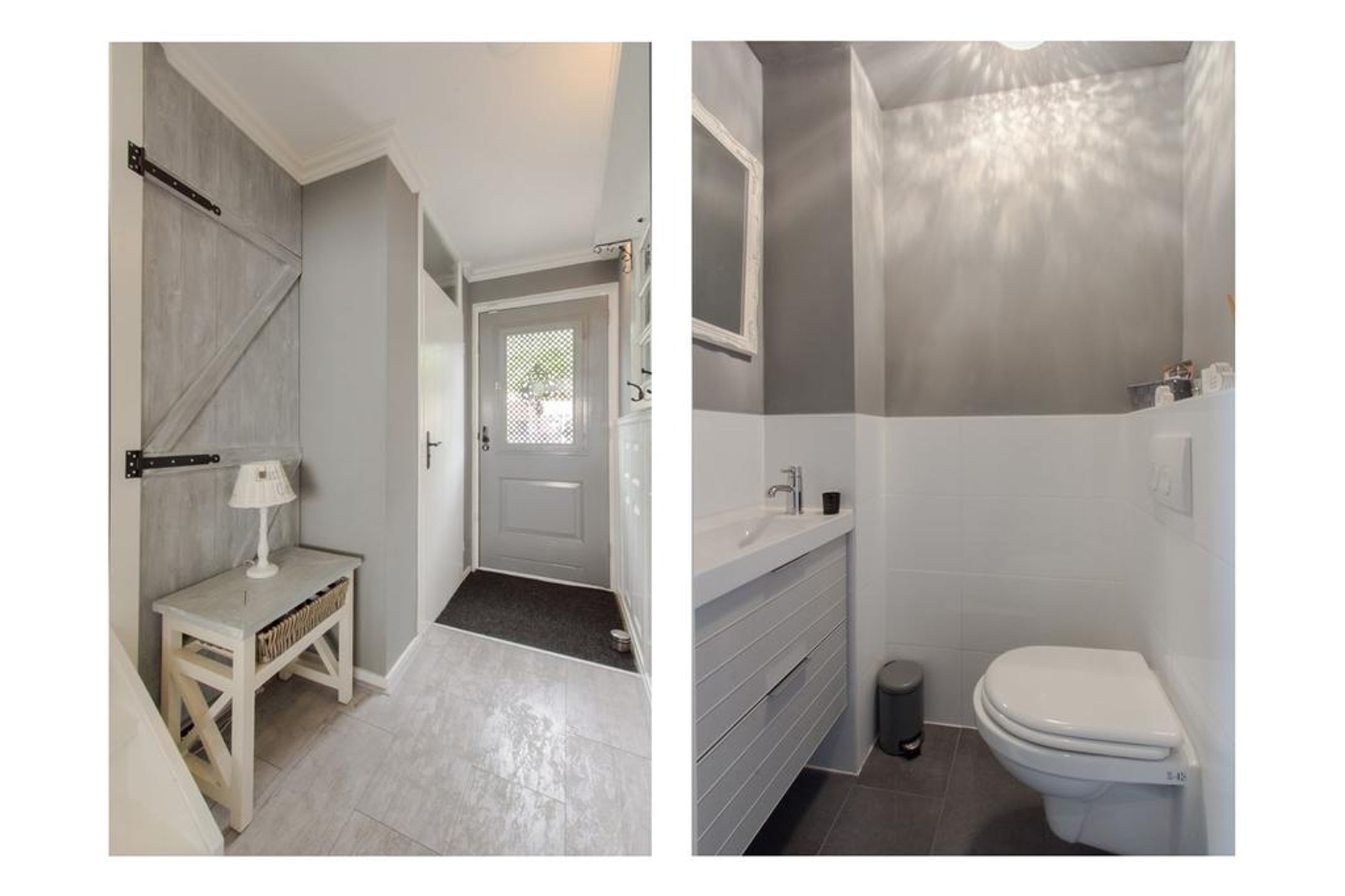 Begane grond Stijlvolle afgewerkte hal welke toegang biedt tot de garderobe, de meterkast, de toiletruimte, de living en de trapopgang naar de 1e verdieping. Het plafond is rondom voorzien van een sierlijst en de wanden van een fraaie lambrisering. De standaard deuren zijn vervangen door nieuwe stijlvolle deuren en houten deurkozijnen. Op de vloer ligt laminaat met daaronder comfortabele vloerverwarming. De wanden in de toiletruimte is deels betegeld met witte wandtegels en deels glad afgewerkt. Op de vloer liggen grijze vloertegels. Voorts treft u een vrijhangend closet en een meubel met geïntegreerde waskom.