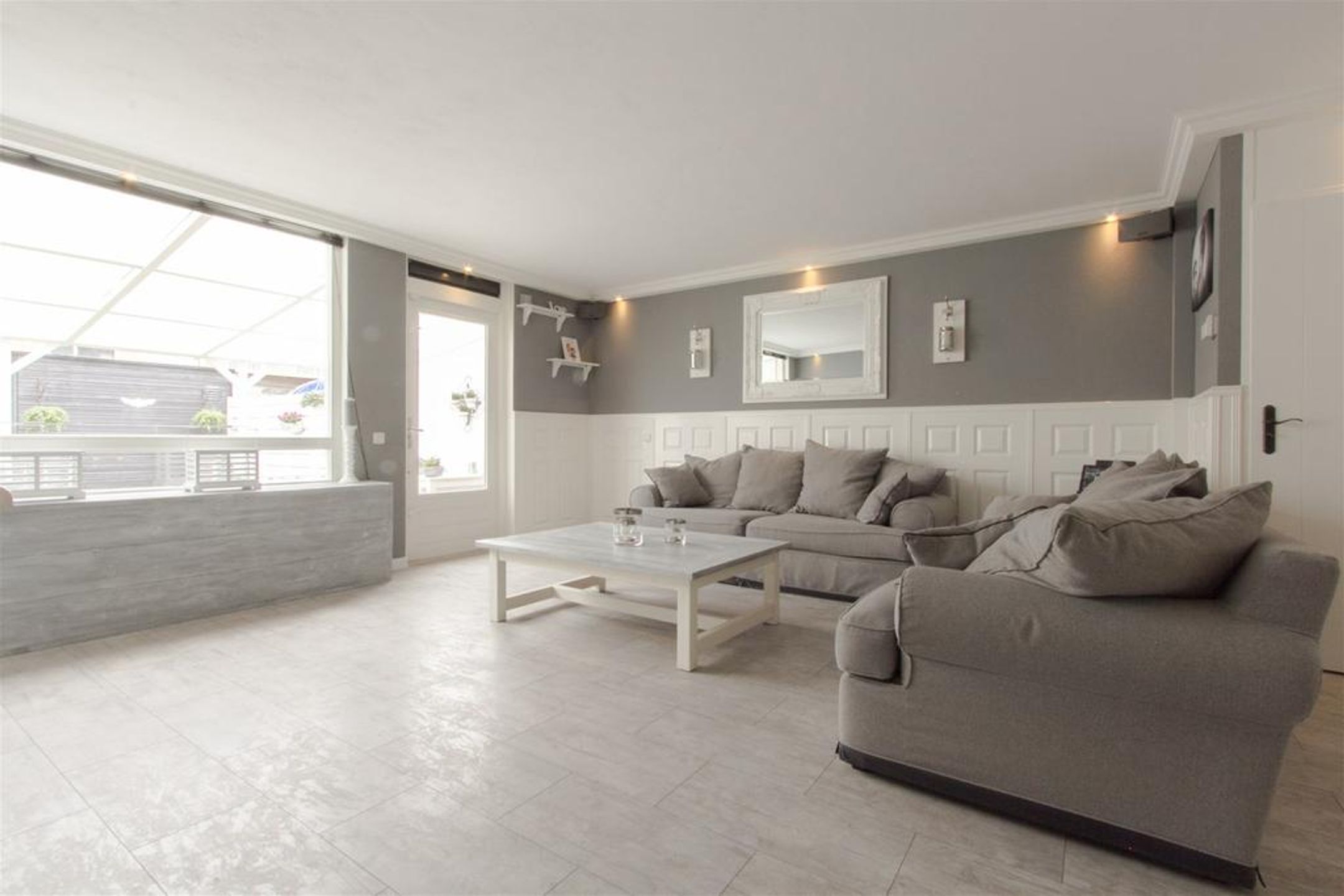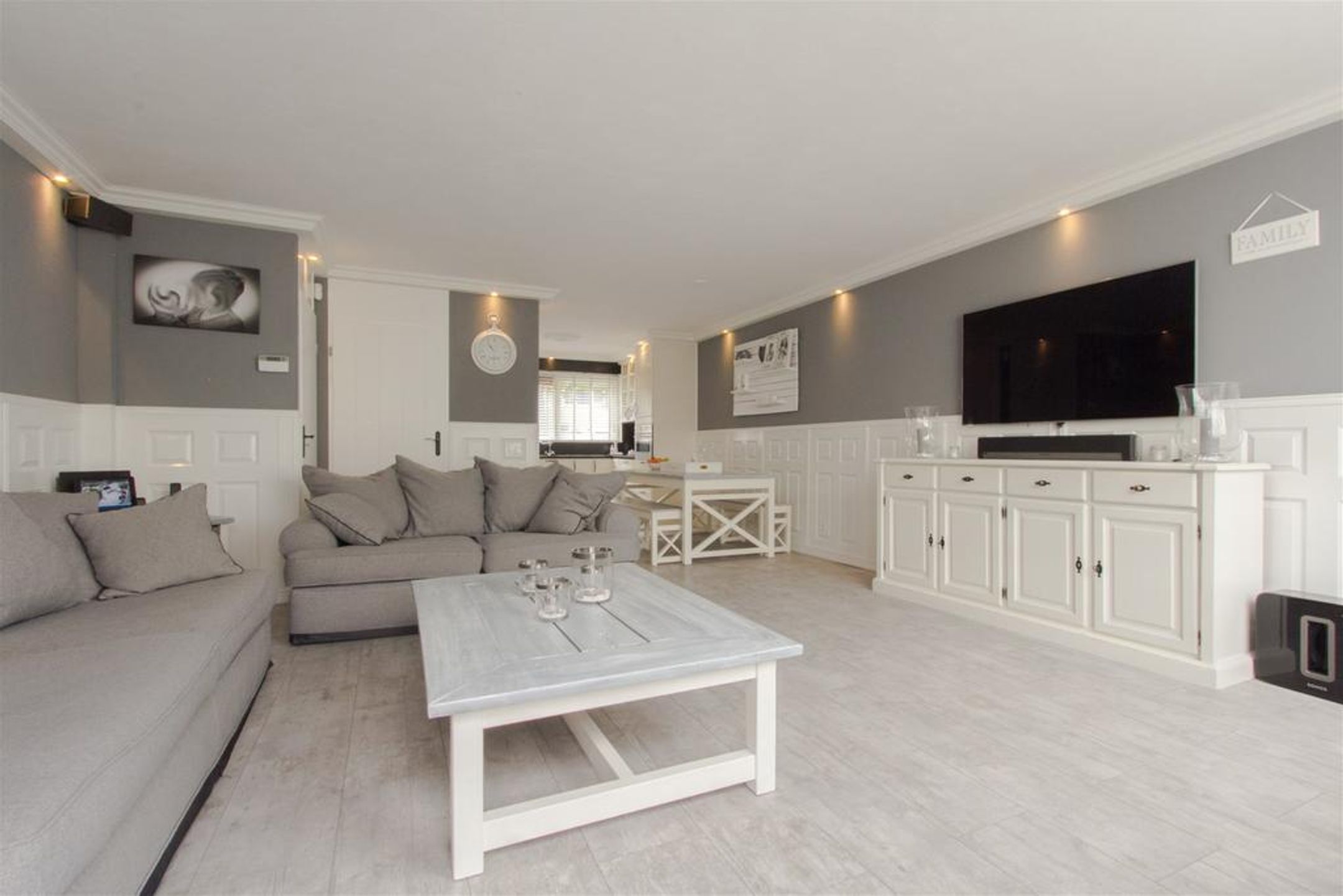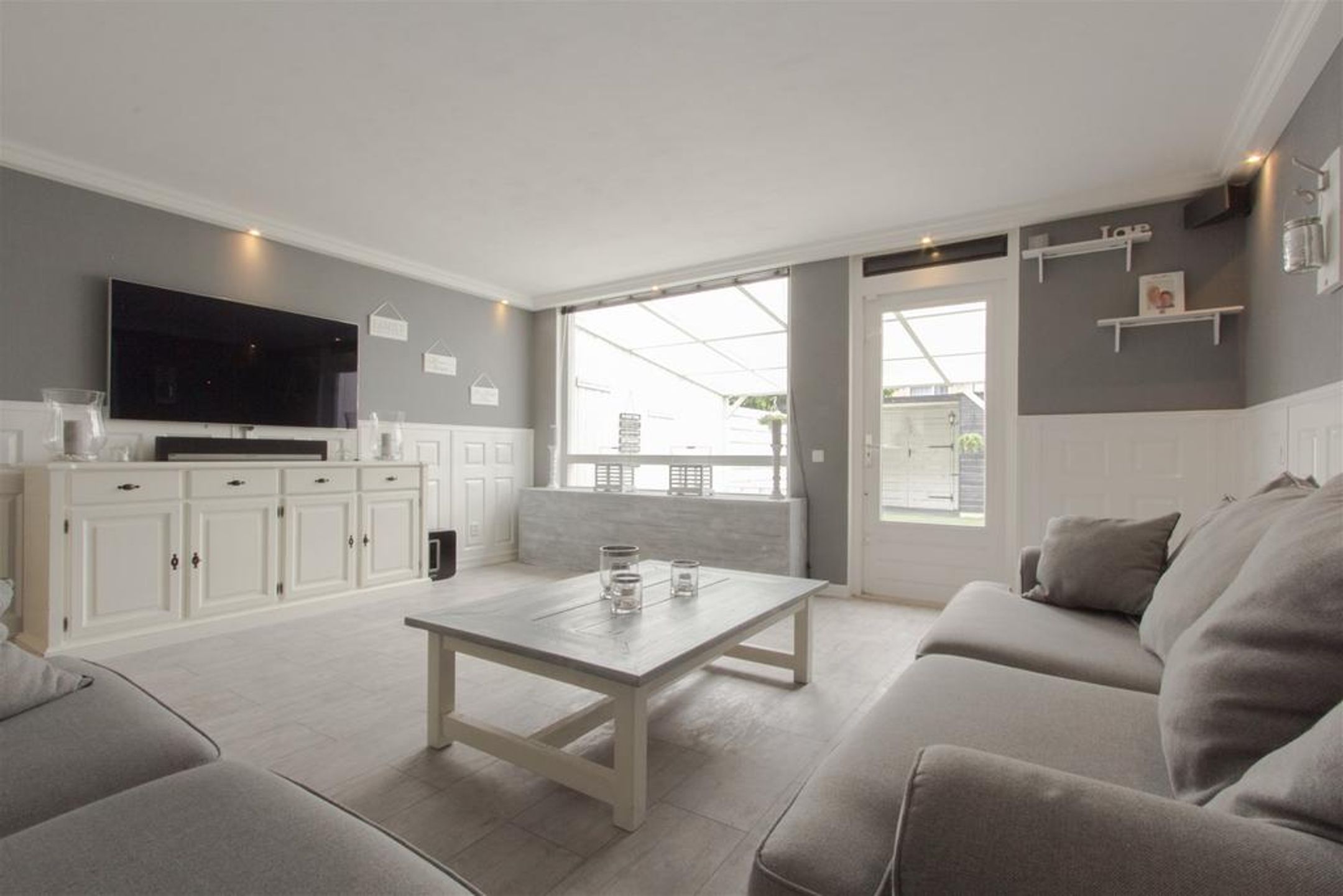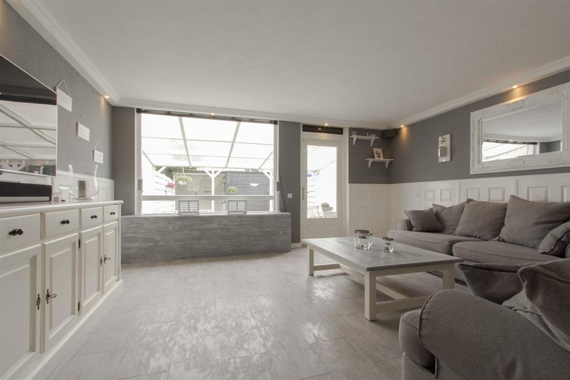 De ruime en lichte tuingerichte living is aan de achterzijde gesitueerd. Het plafond is vlak afgewerkt met schuurwerk en rondom voorzien van een kader met fraaie sierlijst waar spots in zijn verwerkt. De wanden zijn rondom voorzien van een stijlvolle lambrisering. Er is ruimte voor het plaatsen van een royale zithoek. De praktische trapkast voorziet in extra bergruimte.