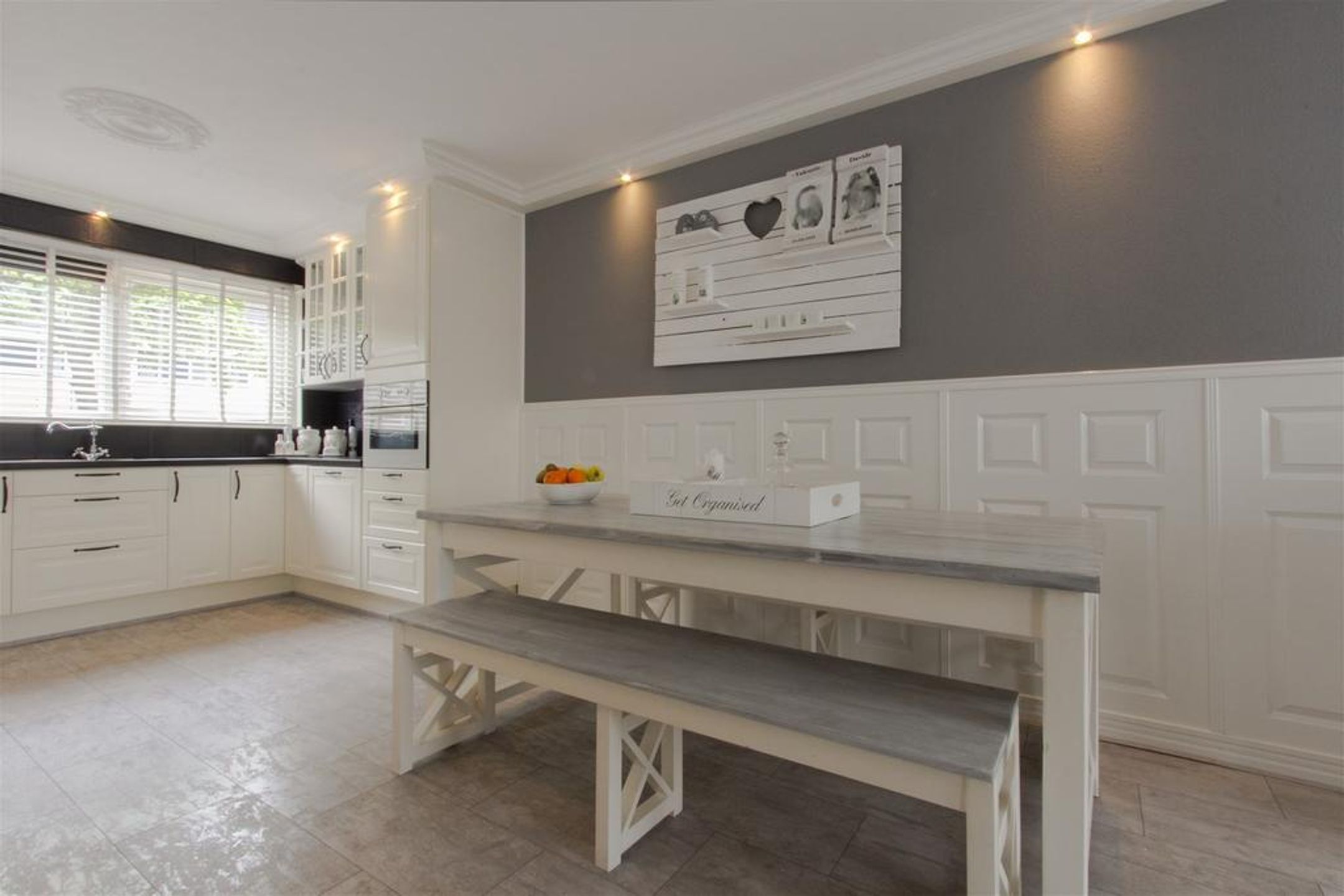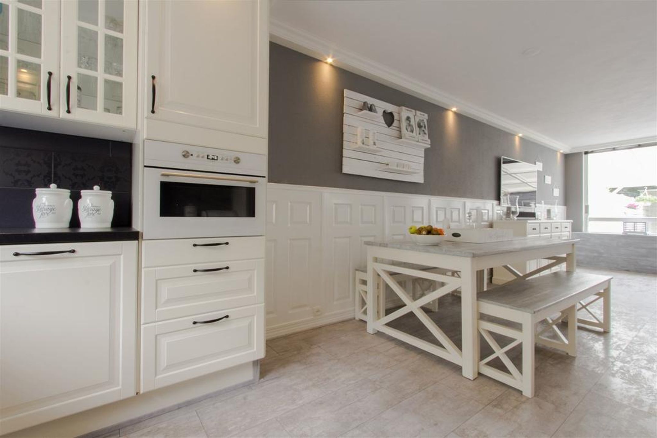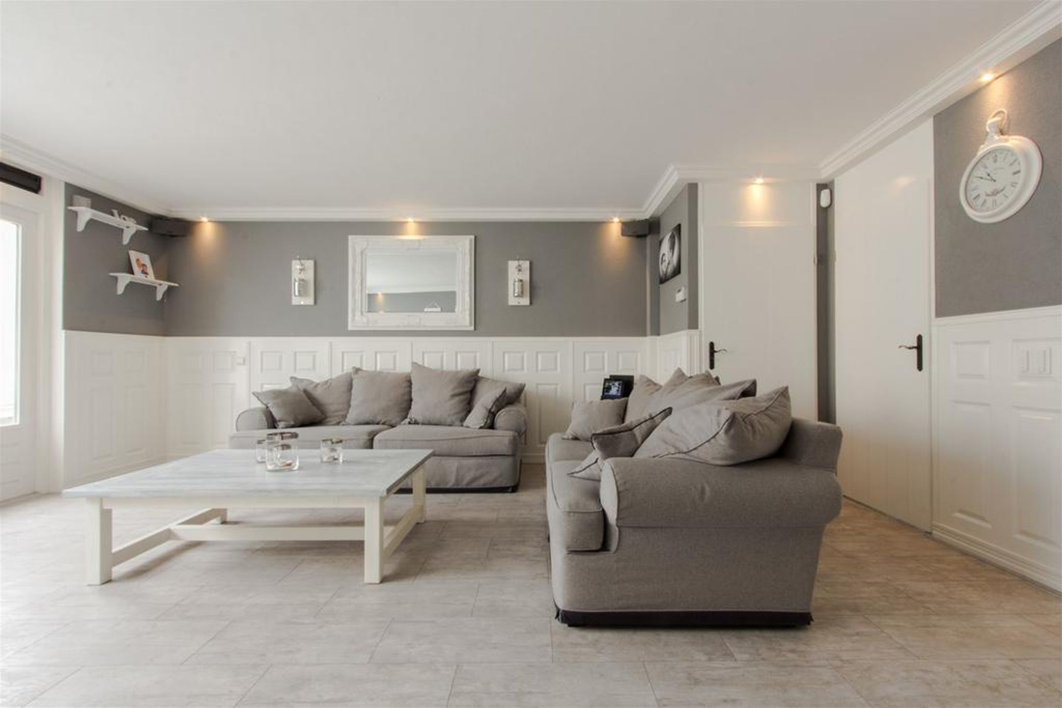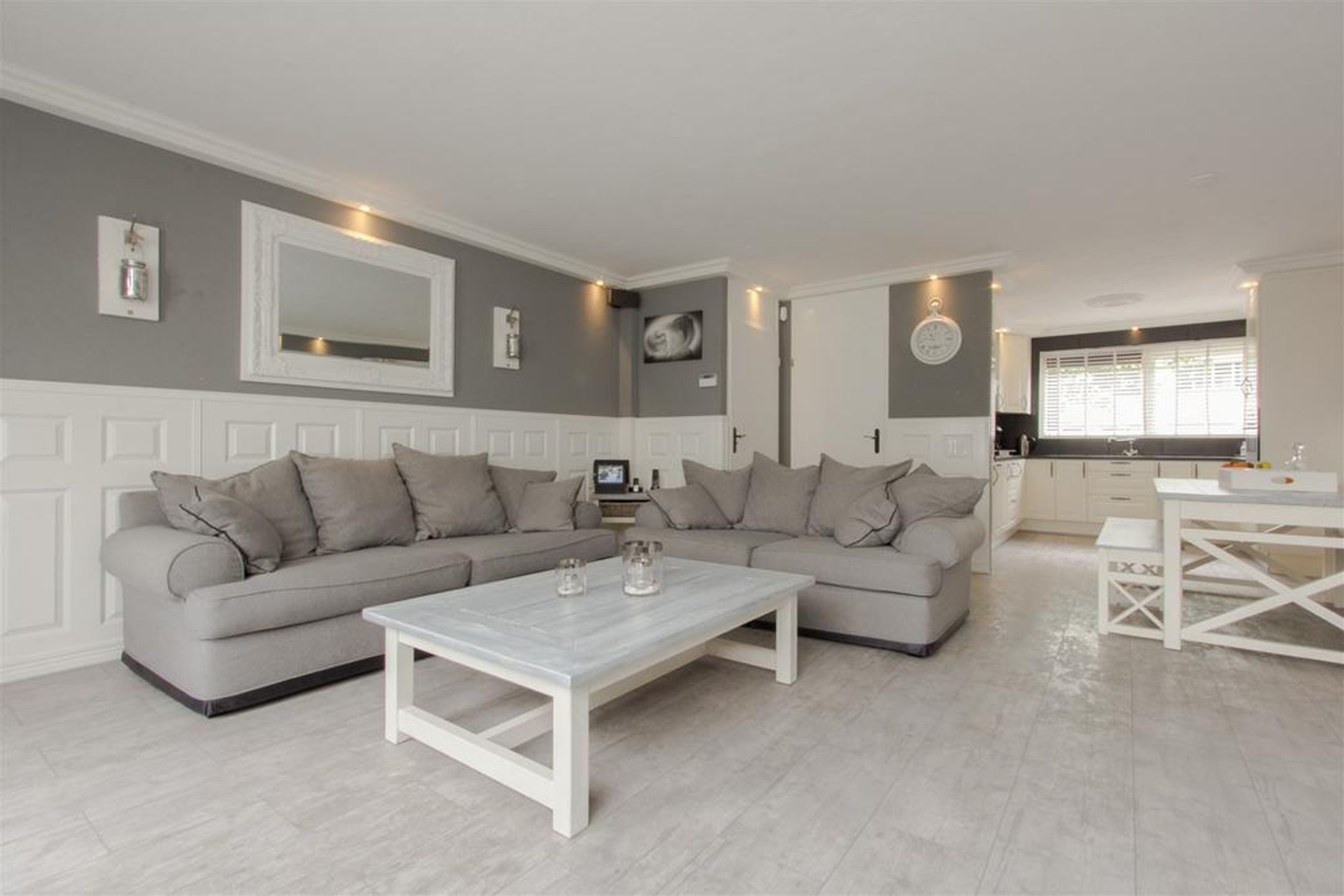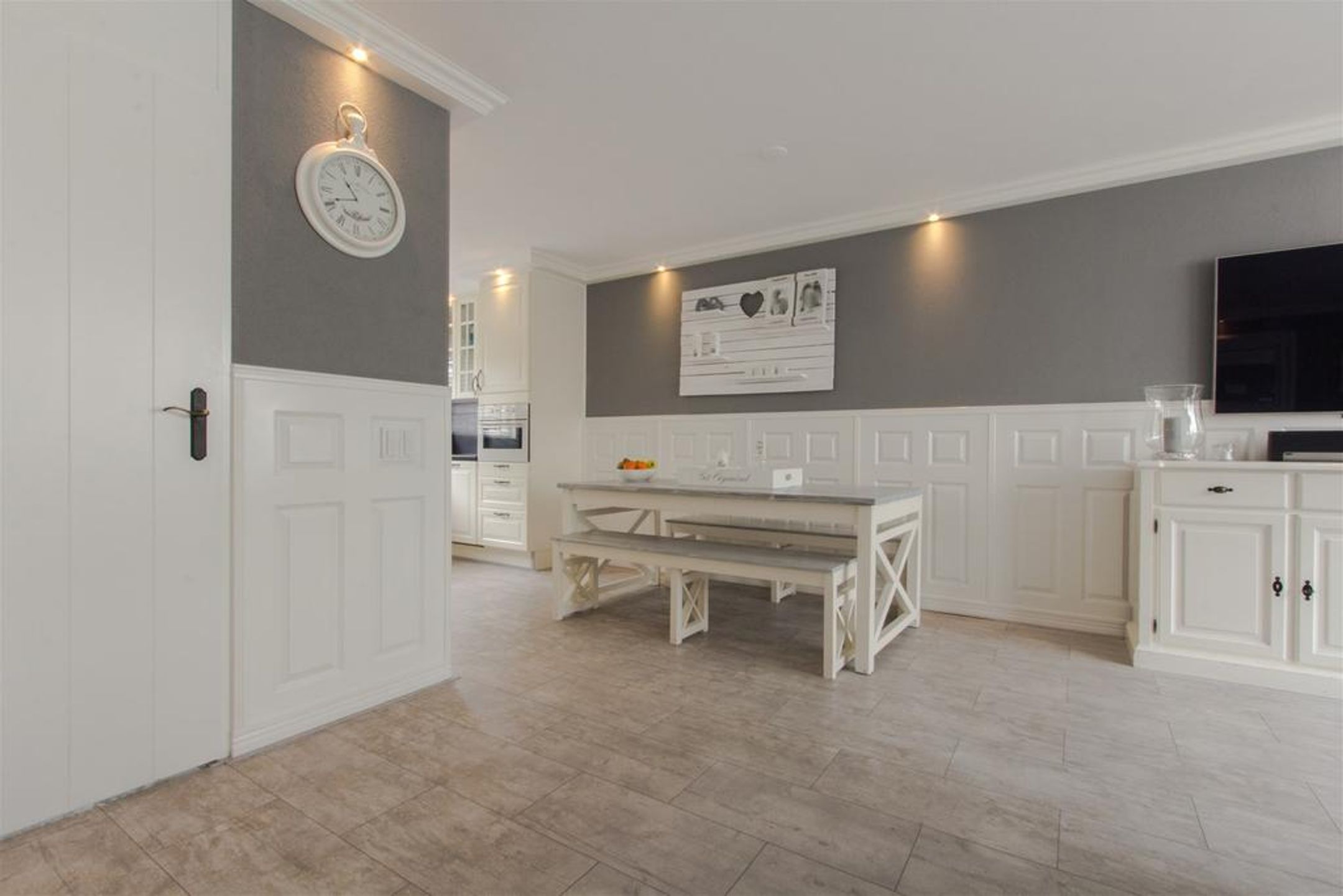 De ruime en lichte tuingerichte living is aan de achterzijde gesitueerd. Het plafond is vlak afgewerkt met schuurwerk en rondom voorzien van een kader met fraaie sierlijst waar spots in zijn verwerkt. De wanden zijn rondom voorzien van een stijlvolle lambrisering. Er is ruimte voor het plaatsen van een royale zithoek. De praktische trapkast voorziet in extra bergruimte.