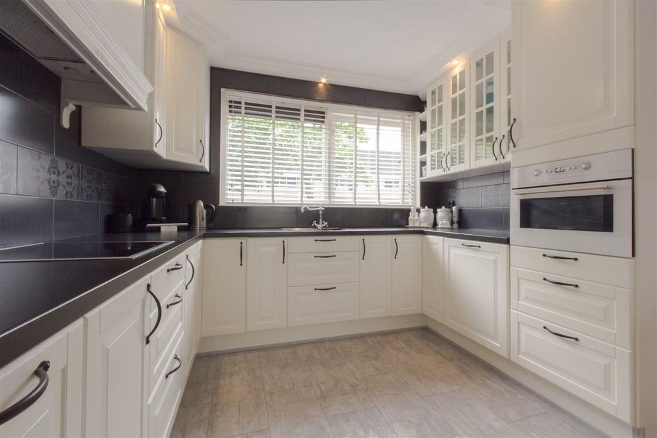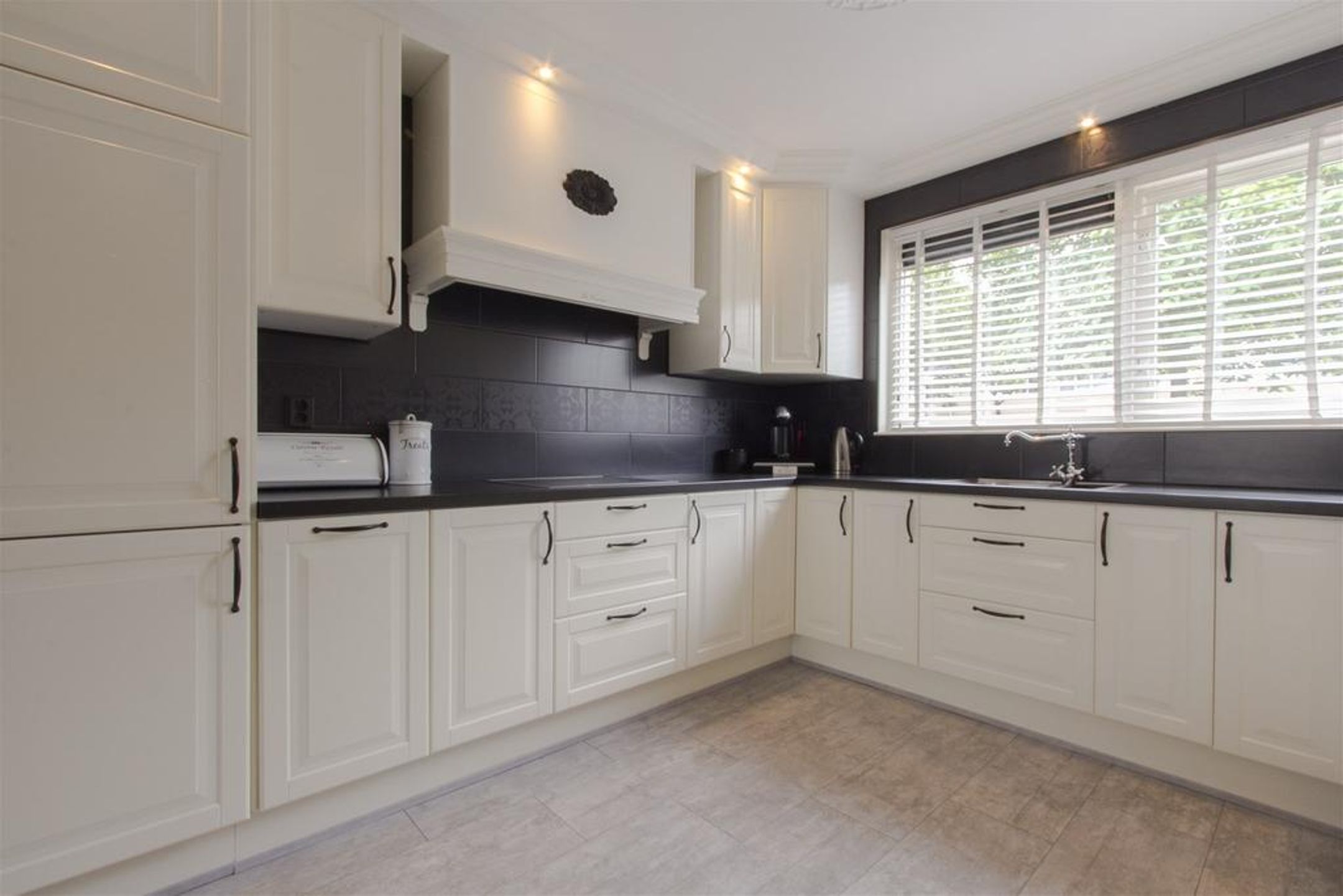 De keuken is aan de voorzijde van de woning gesitueerd, opgesteld in een U-opstelling en uitgevoerd in vanilletint kaderfronten gecombineerd met een zwart werkblad. U beschikt over een SIEMENS keramische kookplaat, een oven- magnetron combinatie, een afzuigunit weggewerkt in een stijlvolle schouw, een inbouwkoelkast, een inbouw vrieskast voorzien van 3 lades, een SIEMENS vaatwasautomaat en 1,5 spoelbak voorzien van stijlvolle kraan. Er is voldoende bergruimte in de diverse onder en bovenkasten, vitrinekasten en lades.