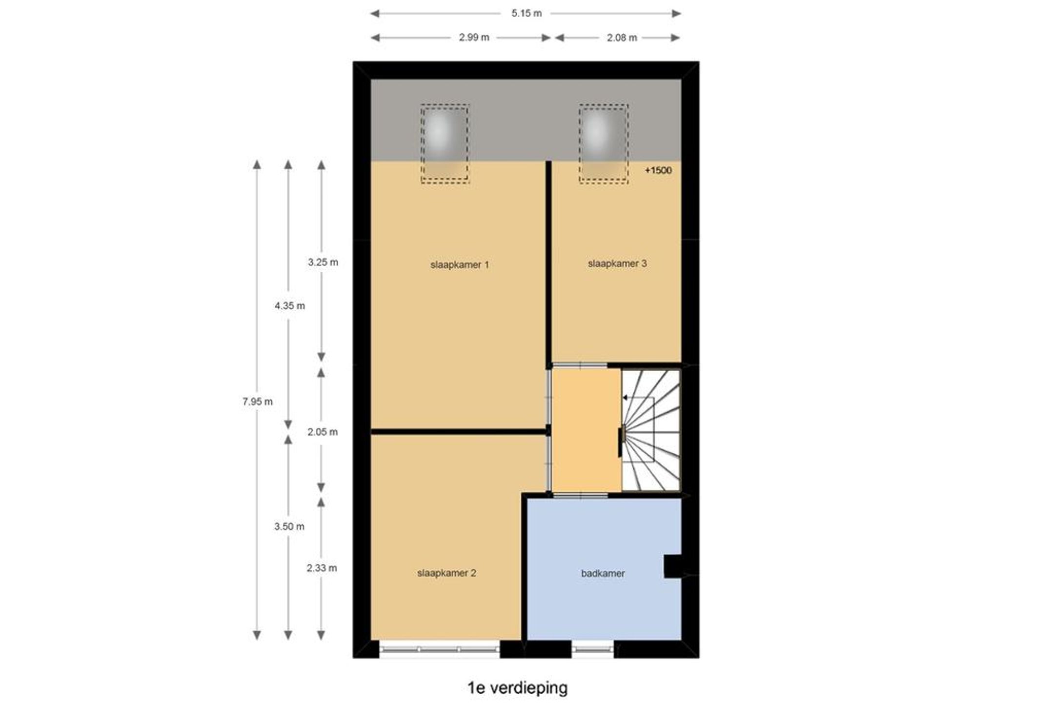 1e verdieping Over de dichte trap bereikt u de overloop op de 1e verdieping welke toegang biedt tot 3 in grote variërende slaapkamers (waarvan 1 thans garderobekamer) en de badkamer.