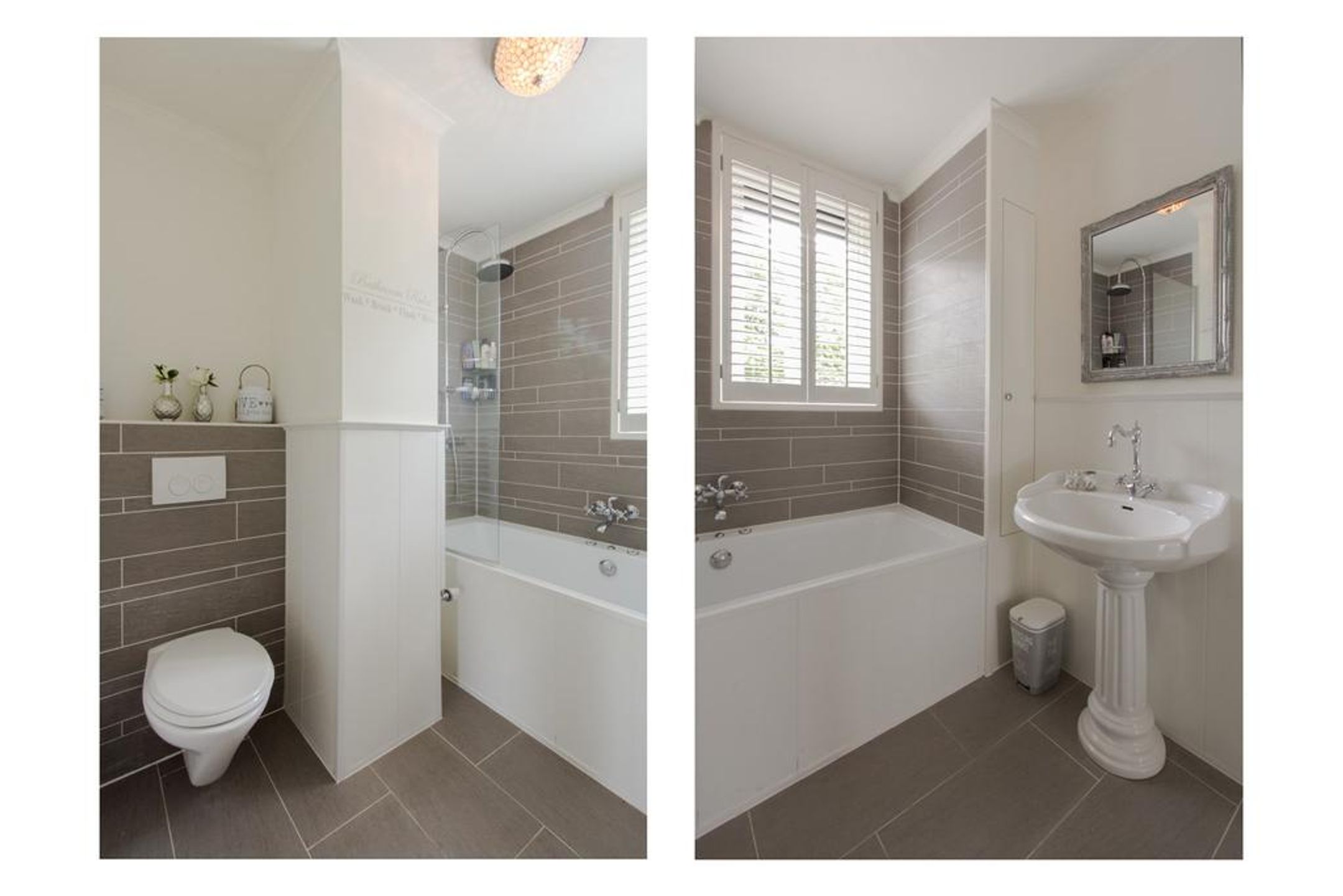 De badkamer is deels betegeld met grijze wandtegels en deels voorzien van een moderne PVC lambrisering. Op de vloer liggen grijze vloertegels. Het raam met shutters voorziet in wenselijk daglicht en ventilatie. Voorts treft u een ligbad met hardglazen wand, whirlpool (jets niet aangesloten), regendouche, thermostaatkraan t.b.v. de regendouche en stijlvolle badkraan, een wastafel, een vrijhangend closet met inbouwreservoir en een design radiator.