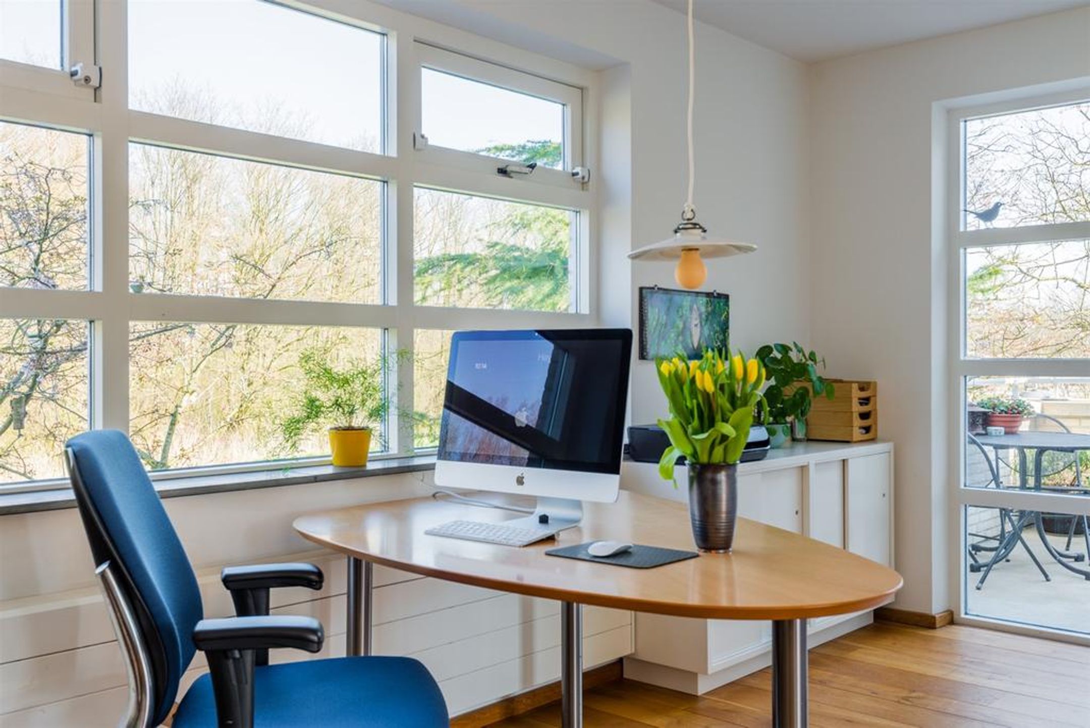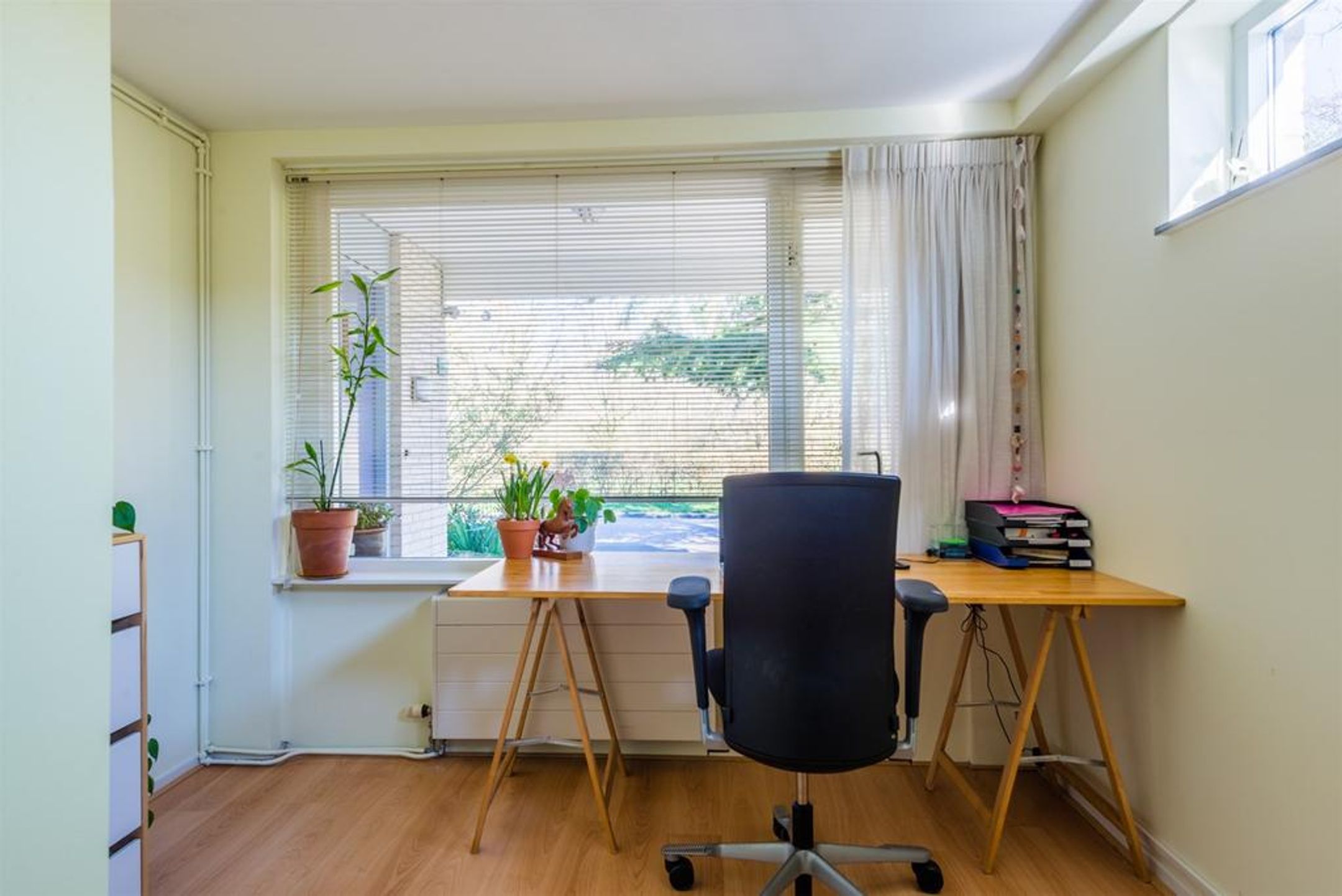De voormalige inpandige garage is geheel bij de woonruimte betrokken en opnieuw ingedeeld. Door deze nieuwe indeling is er een kantoor aan de voorzijde en een inpandige berging aan de achterzijde ontstaan. De garagedeur is vervangen door een nieuw gevelvullend kozijn met groot raam. Ook hier heeft u weer fraai zicht op de groene bosrand aan de overzijde. Door dit grote raamkozijn en de speels geplaatste ramen in de zijgevel geniet u van een prettige lichte werkruimte. De wanden zijn afgewerkt met glasvezelbehang en het plafond is glad afgewerkt.