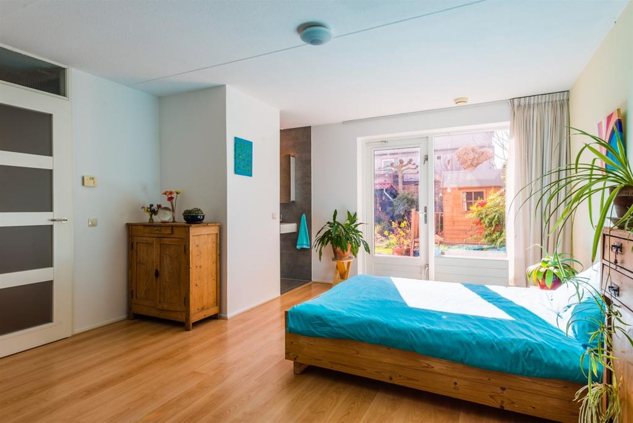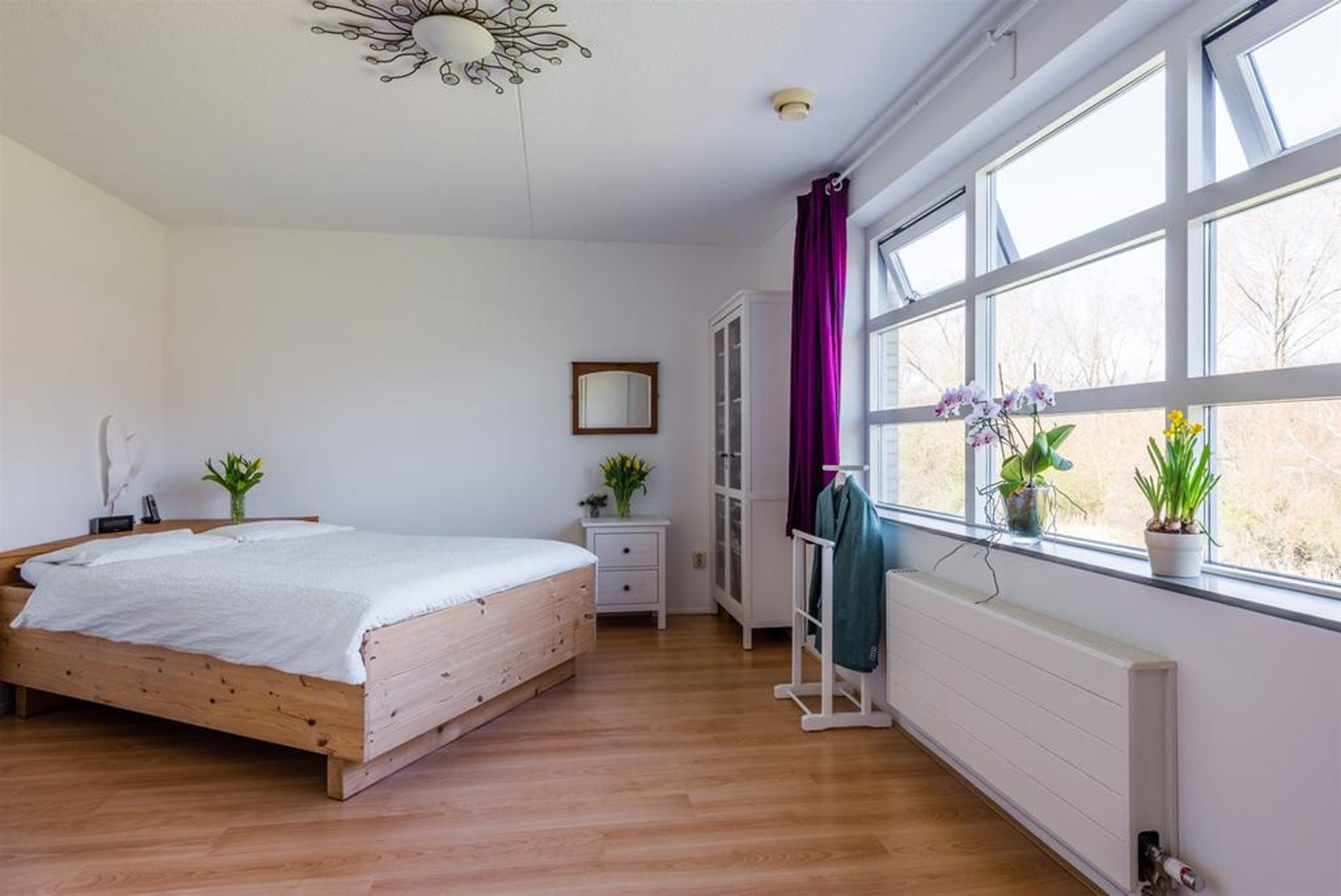 De slaapkamer aan de voorzijde wordt thans gebruikt als master-bedroom. De kamer is zeer royaal en vooral licht, wederom door de grote raampartij in de voorgevel. U zult begrijpen dat hoe hoger u komt, hoe meer u de groene woonomgeving kunt waarnemen.