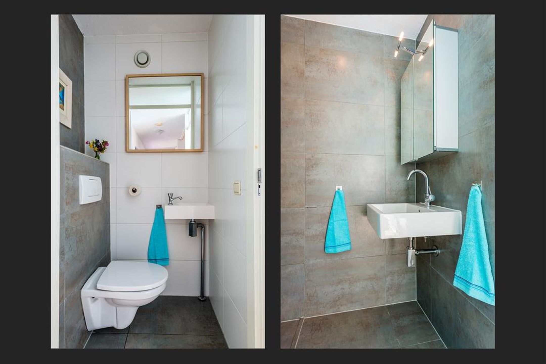 In dezelfde stijl als de badkamers is ook het toilet geheel vernieuwd waardoor deze weer aan de huidige wensen zal voldoen. Hier zijn de grote grijs/brons tint tegels gecombineerd met mat witte tegels. Voorts is hier een vrij hangend closet met inbouw reservoir en een modern hoekfonteintje geplaatst.