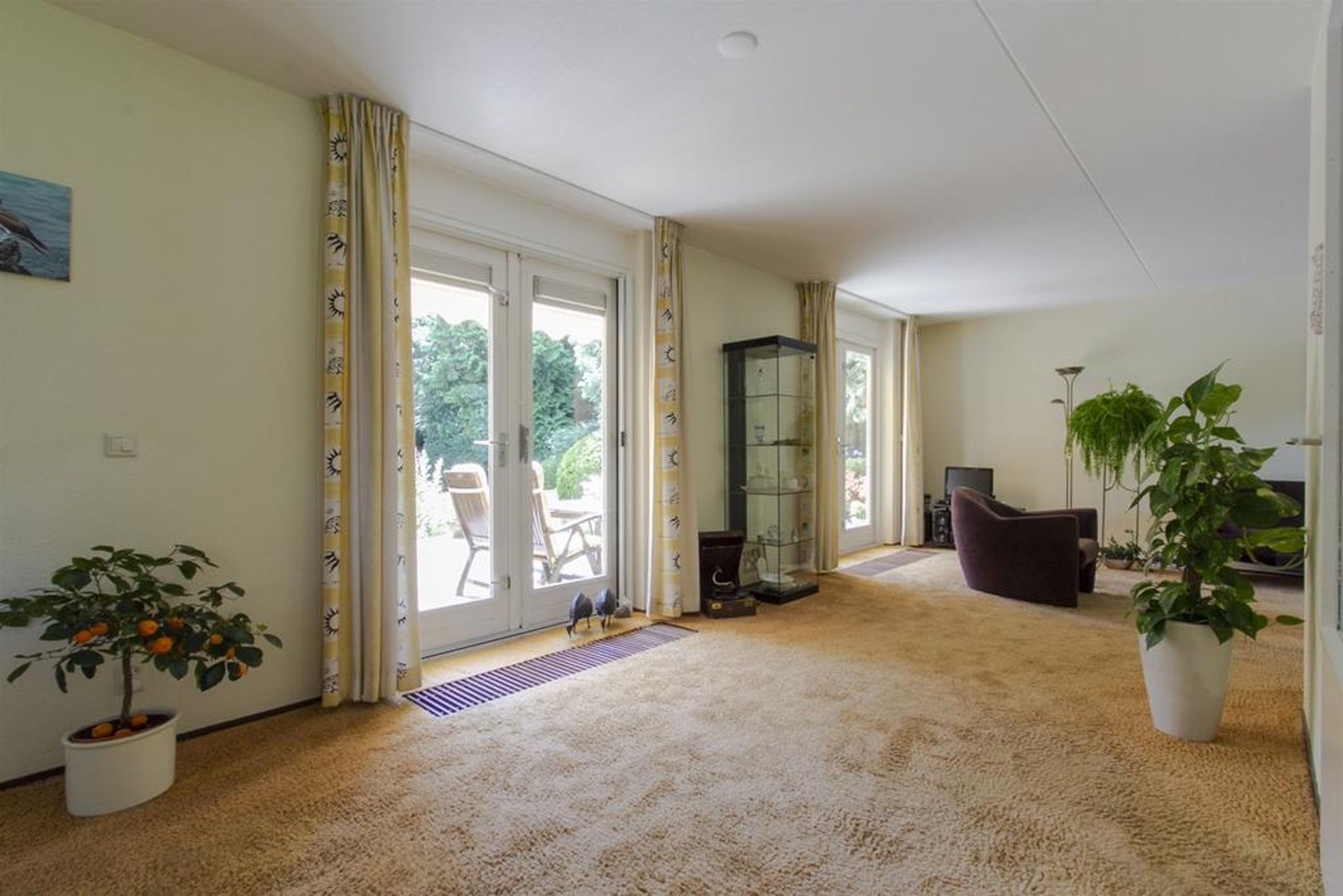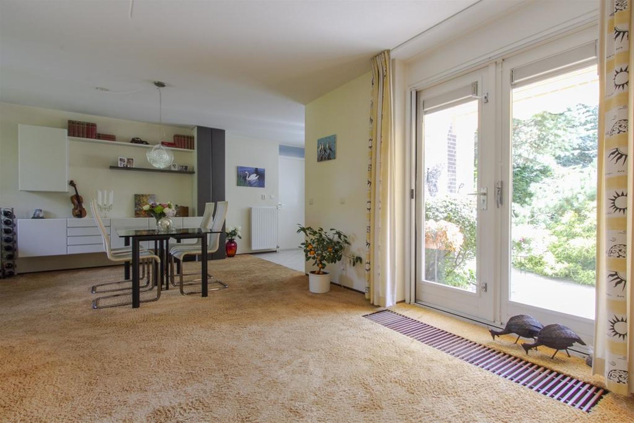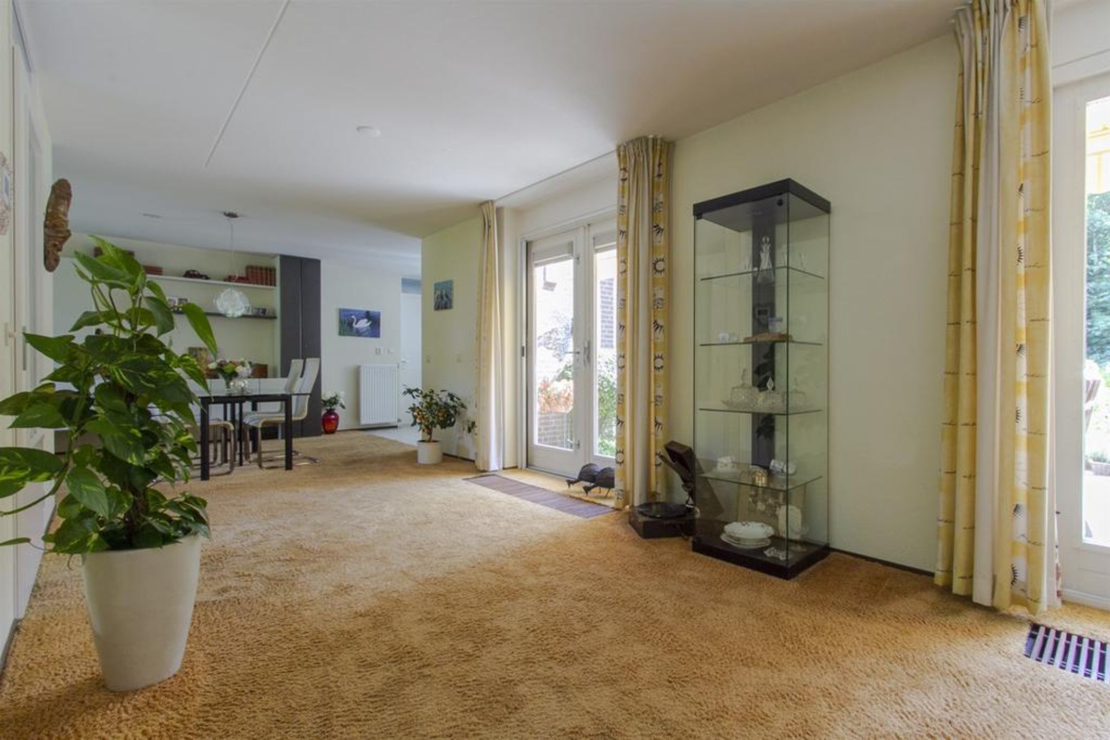 In de gehele living ligt zachte vloerbedekking en rondom zijn de wanden afgewerkt met spachtelputz. De ruime living is over de gehele breedte en diepte van de woning gesitueerd met rechts een gezellige zithoek met houtgestookte openhaard, centraal veel verkeersruimte en links de eetkamer en de open keuken met bijkeuken. In de zithoek heeft u zicht op uw omgeving door het brede raam in de voorgevel en de dubbele openslaande deuren in de achtergevel waardoor u contact hebt met de prachtige groene woonomgeving. Deze dubbele openslaande deuren treffen we ook bij de centrale verkeersruimte. De zonnige tuin zal u ervaren als een verlengstuk van uw living. In de vloer zijn twee convectorputten aangebracht met daar overheen hardhouten roosters.