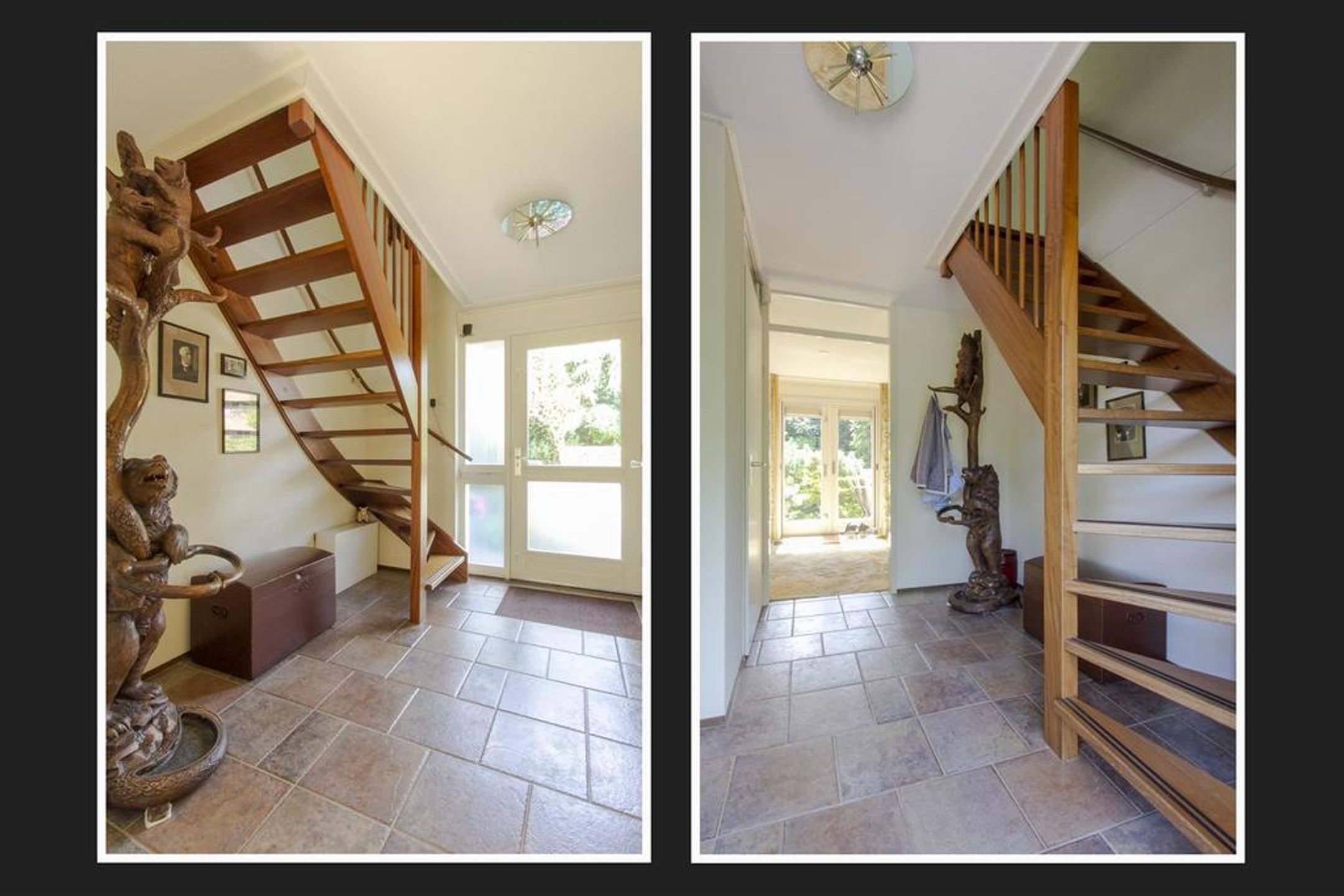 Bij de overdekte entree betreedt u de hal, rondom is deze afgewerkt met spachtelputz, op de vloer liggen vloertegels. De hal ontvangt veel licht door het raam in de voordeur, het zijlicht en de glasdeur naar de living. U heeft hier toegang tot de meterkast, toilet met hangend closet en fonteintje, garderobe, lichte brede living en de hardhouten trap naar de verdieping.
