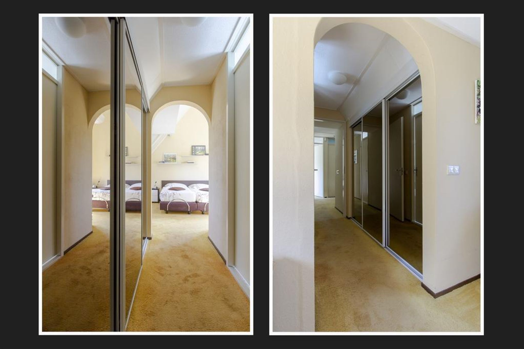 De corridor verbindt de master-bedroom, de 1e badkamer en de overloop met elkaar. Onder de schuine dakhelling is een kastenwand gecreëerd met 3 grote spiegelschuifdeuren. Ook hier is de zachte vloerbedekking doorgetrokken tot in de slaapkamer.