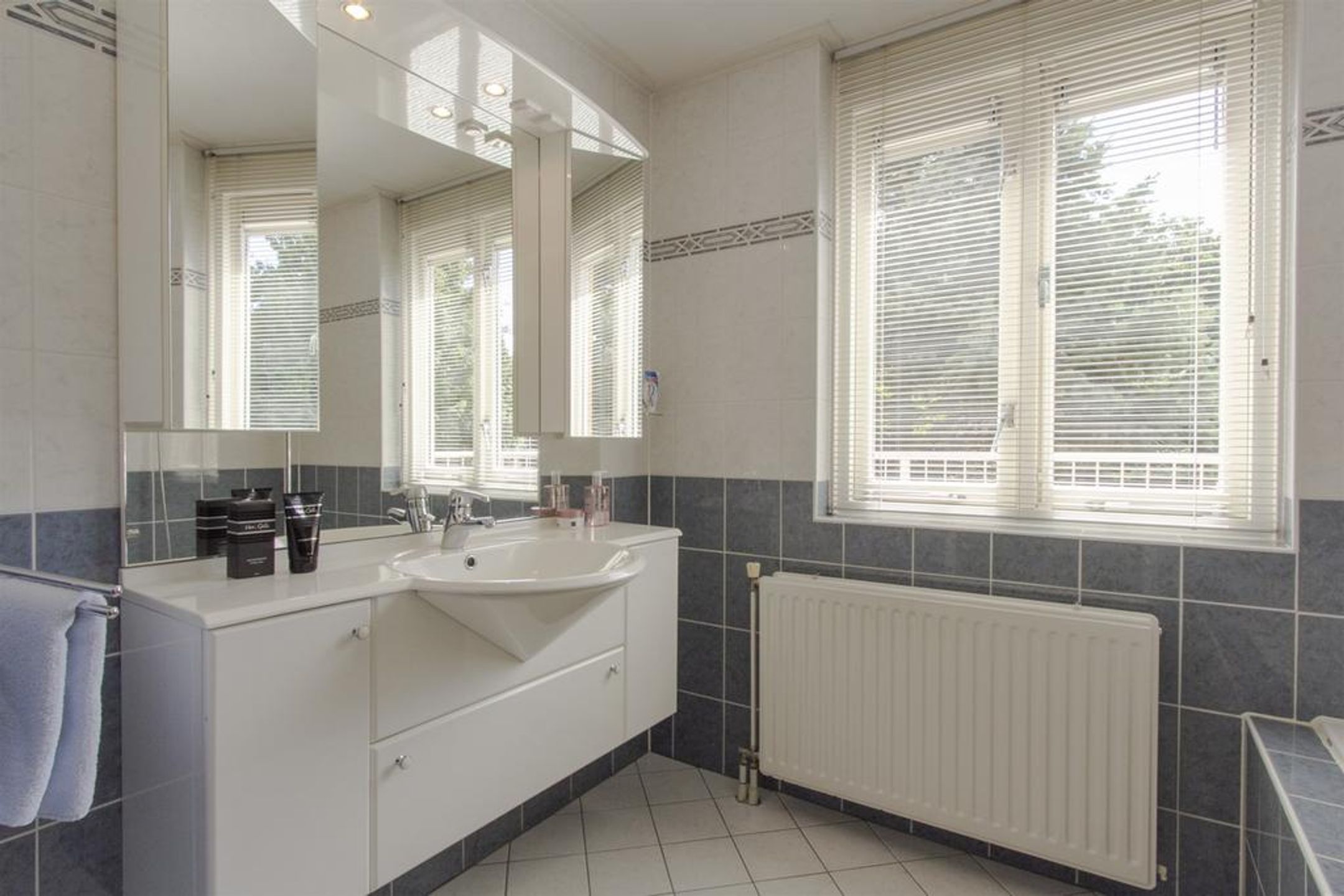 De wanden zijn geheel betegeld en gecombineerd met bijpassende vloertegels. De badkamer is ingericht met een groot ligbad met thermostaatkraan en handdouche, een wasmeubel met geïntegreerde waskom, onderkasten, hoge zijkasten, spiegel en baldakijn met verlichting.