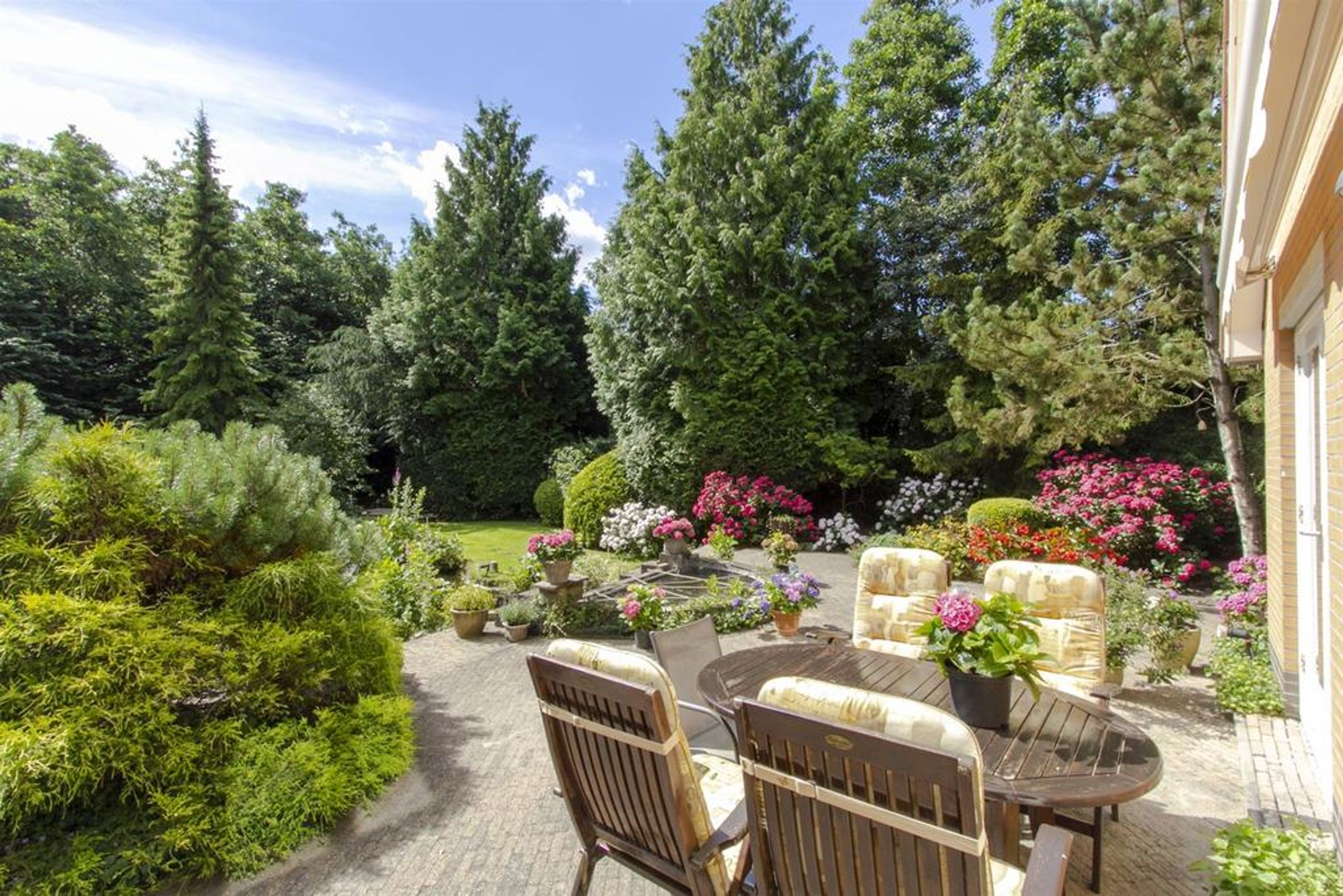Langs de achtergevel is een groot breed zonneterras aangelegd met daar omheen borders met vele hortensia's en andere beplanting. Indien nodig kunt u plaatsnemen onder het brede elektrische zonnescherm. Van het vroege voorjaar tot laat in het najaar geniet u hier van de prachtige groene leefomgeving.