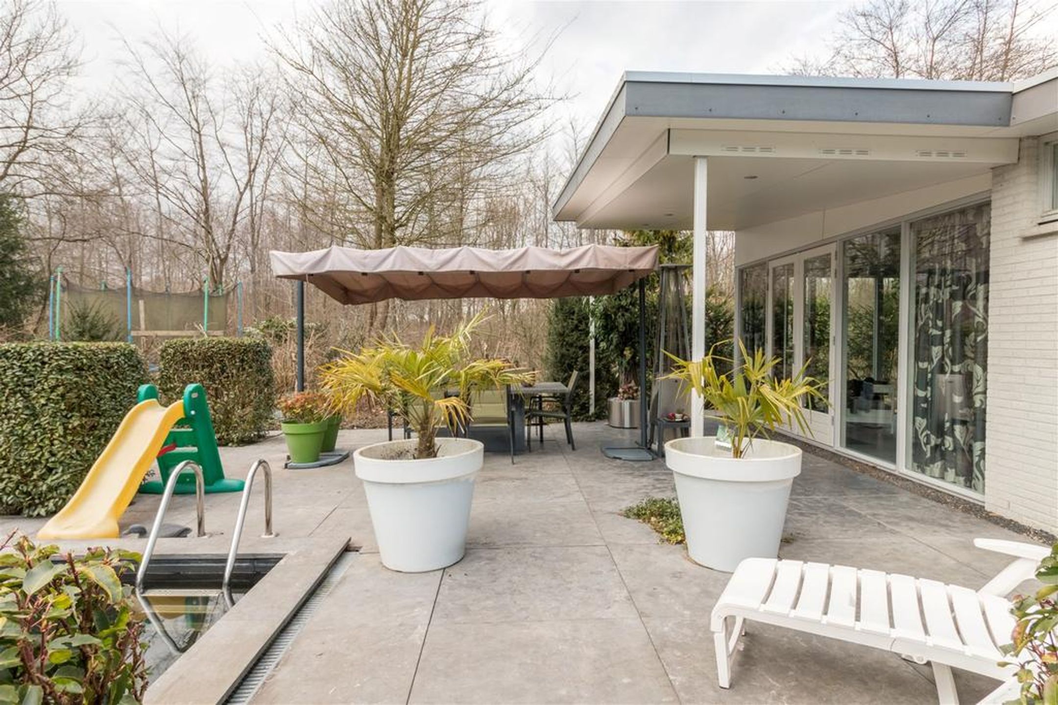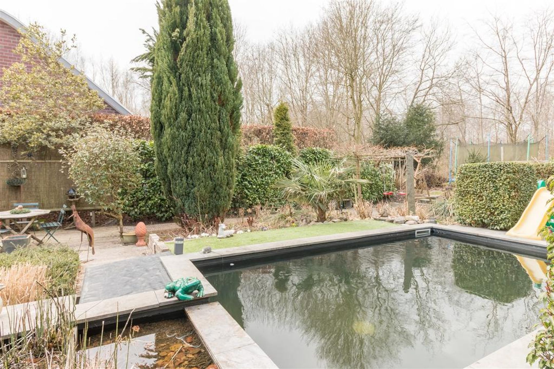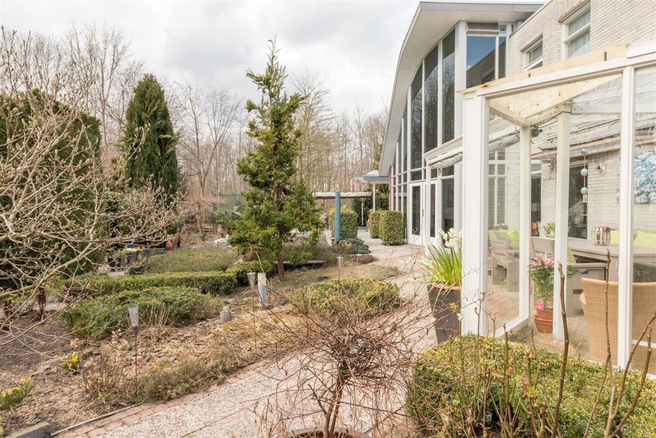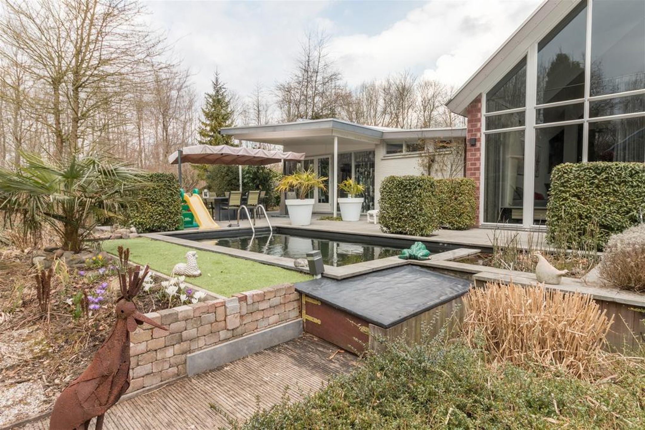 Onder architectuur aangelegde siertuin en natuurlijke zwemvijver met pomp. Aangrenzende boswal in eigendom grenzend aan het achtergelegen bos. De terrassen aan de zijkant zijn deels voorzien van overkappingen met verlichting.