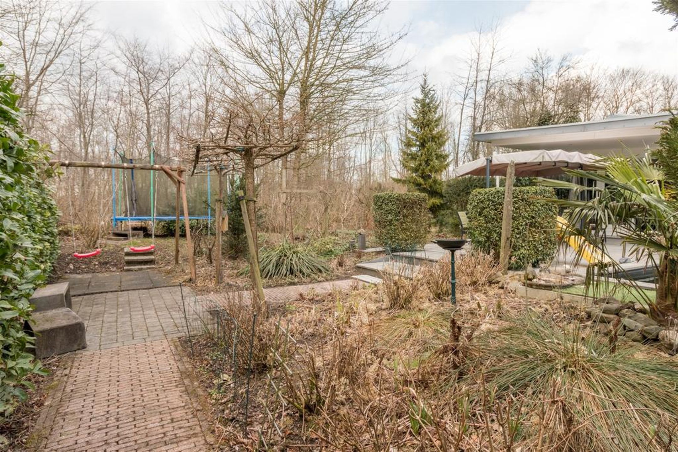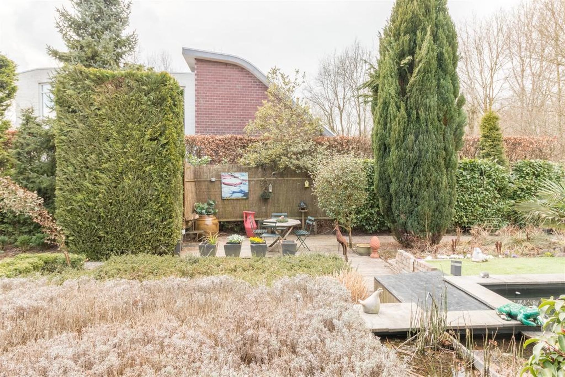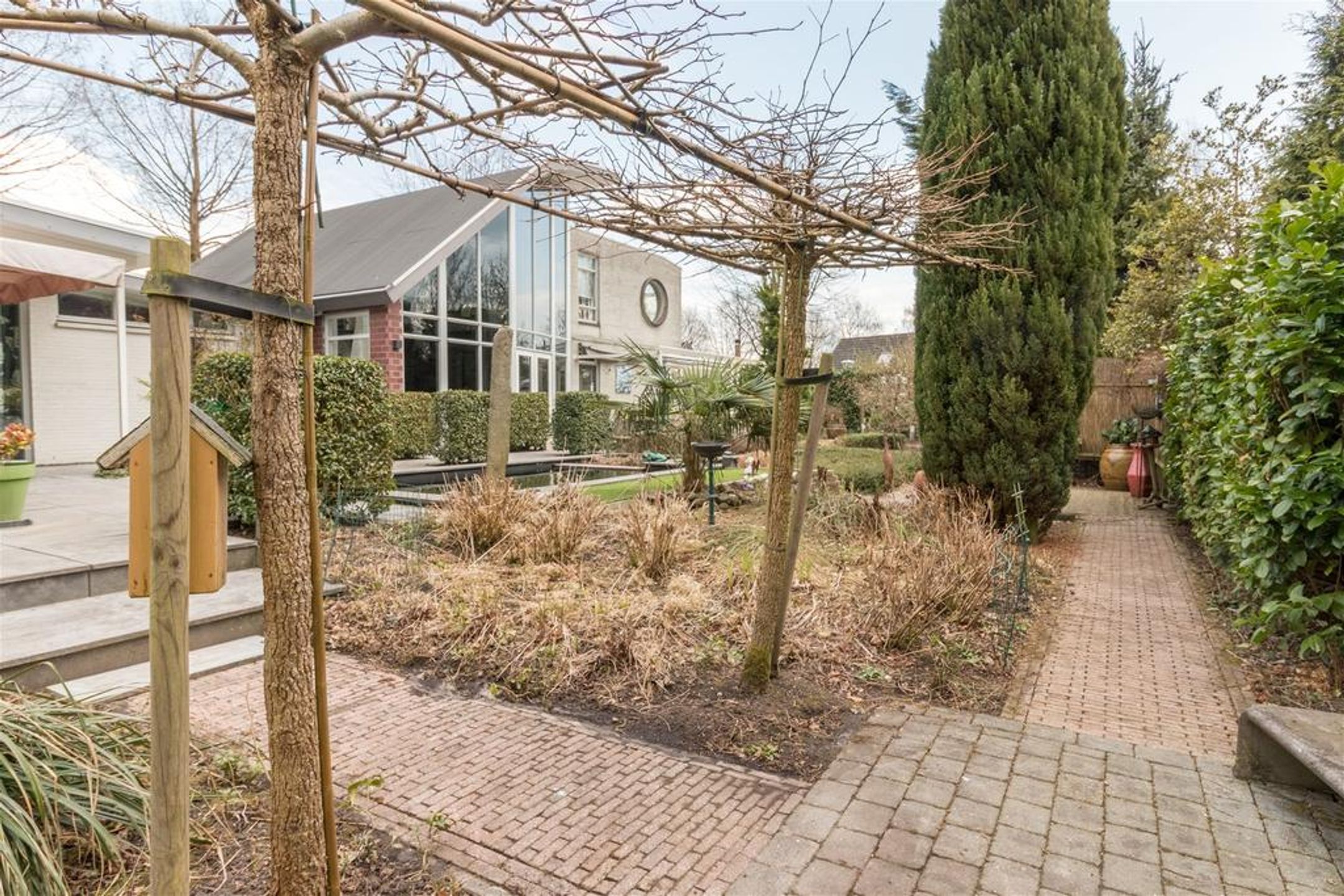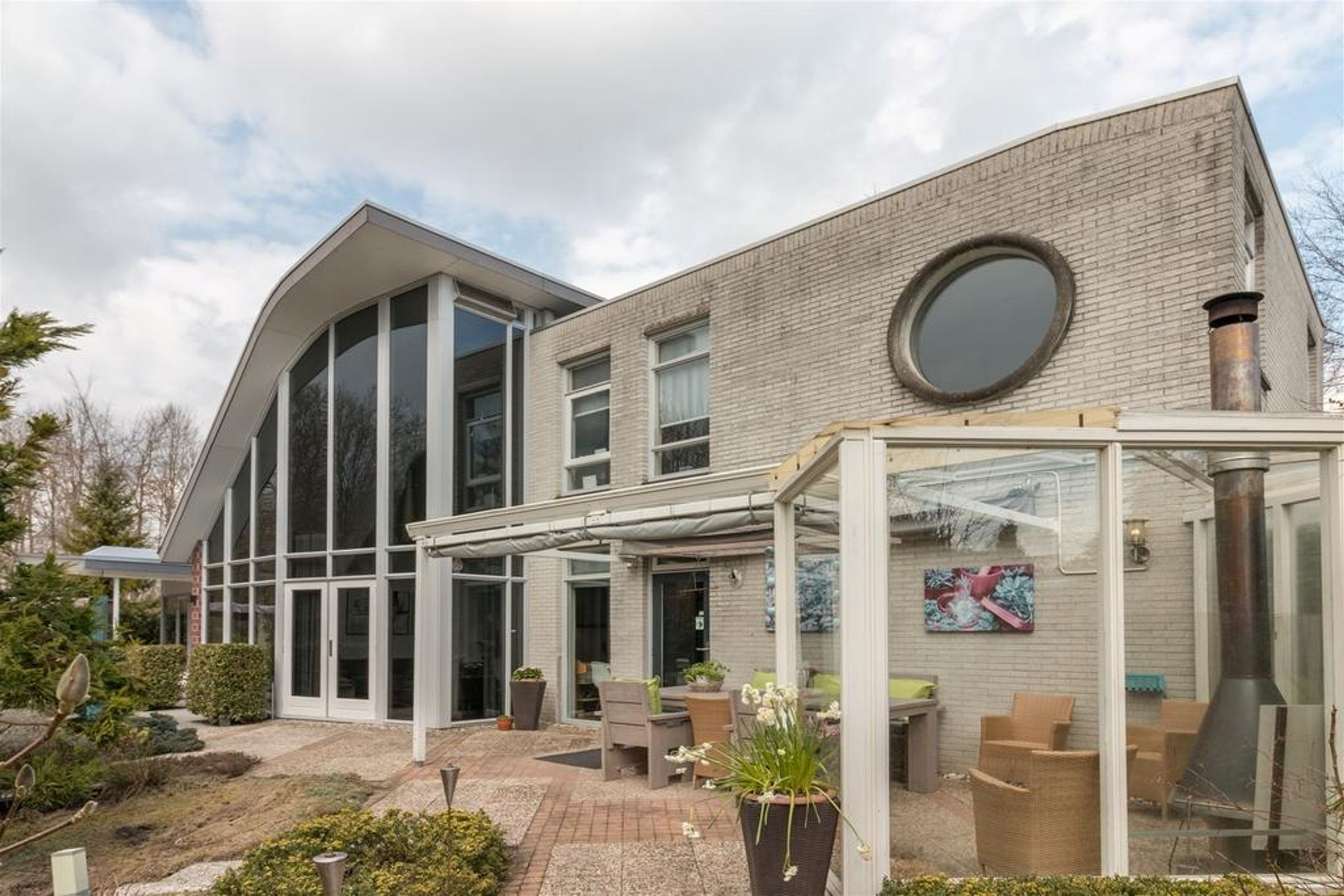 Onder architectuur aangelegde siertuin en natuurlijke zwemvijver met pomp. Aangrenzende boswal in eigendom grenzend aan het achtergelegen bos. De terrassen aan de zijkant zijn deels voorzien van overkappingen met verlichting.