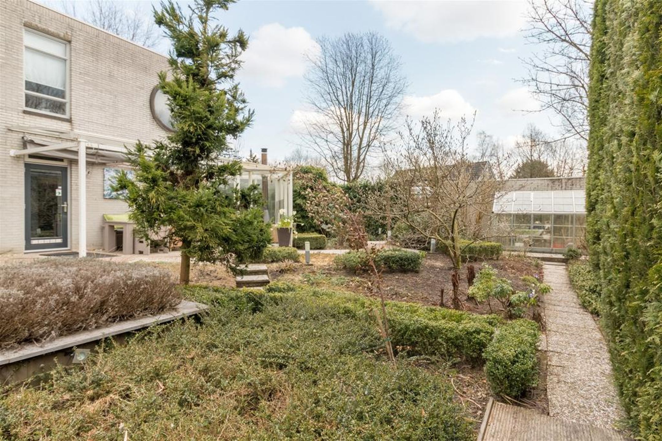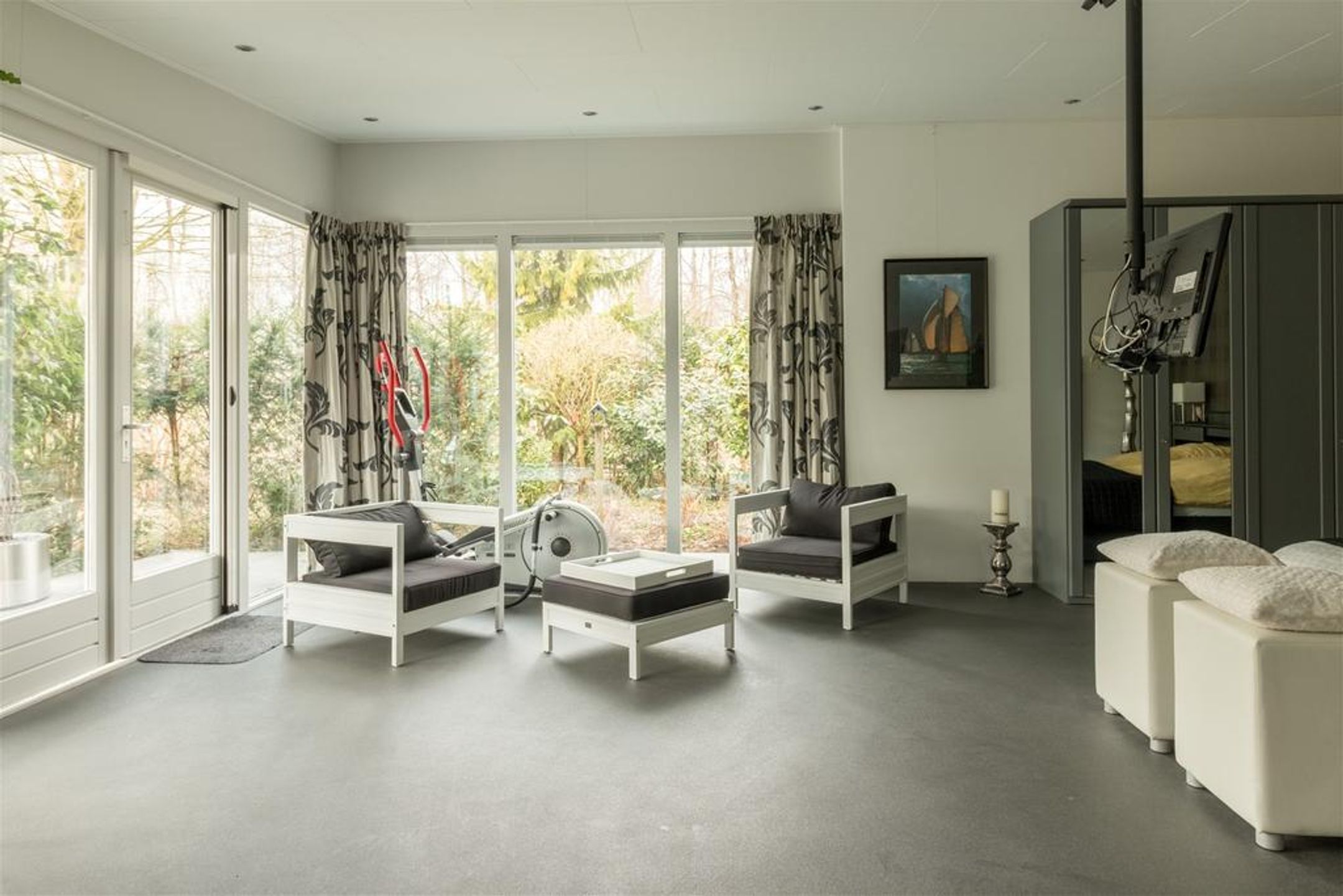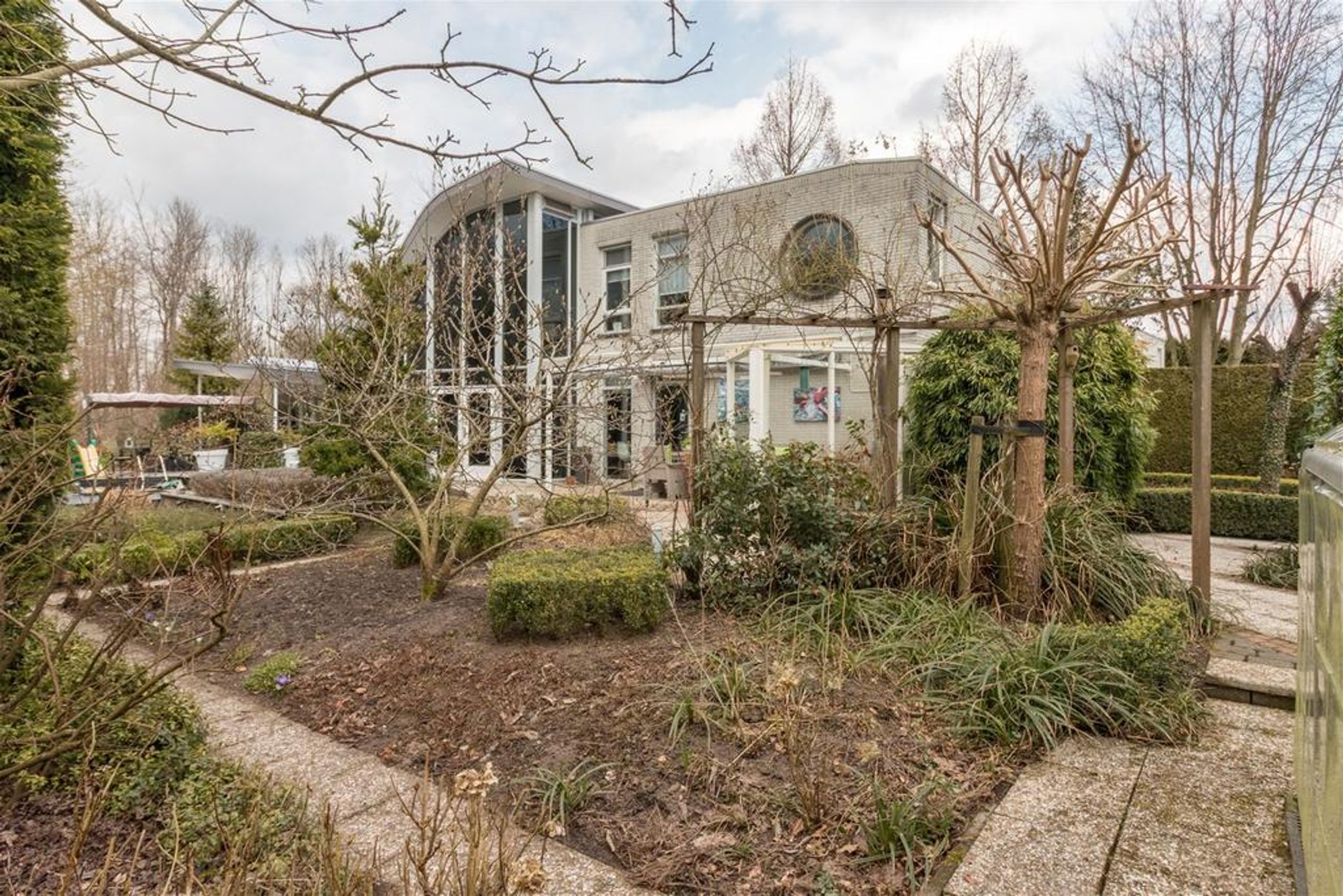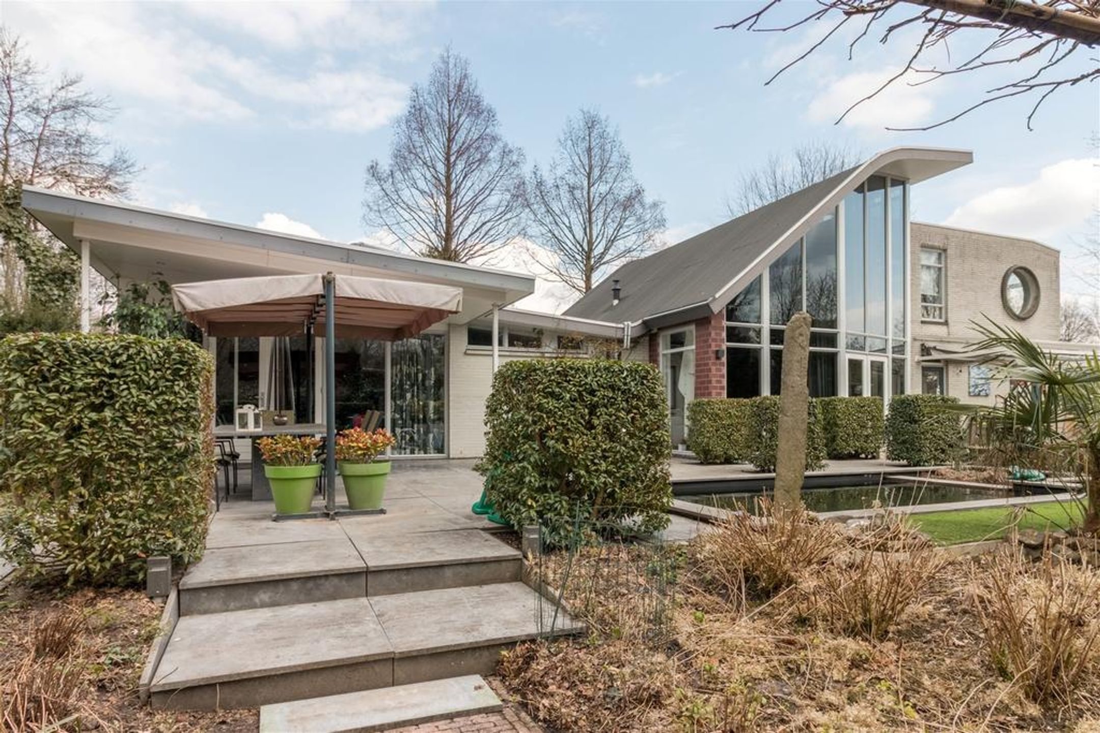 Onder architectuur aangelegde siertuin en natuurlijke zwemvijver met pomp. Aangrenzende boswal in eigendom grenzend aan het achtergelegen bos. De terrassen aan de zijkant zijn deels voorzien van overkappingen met verlichting.