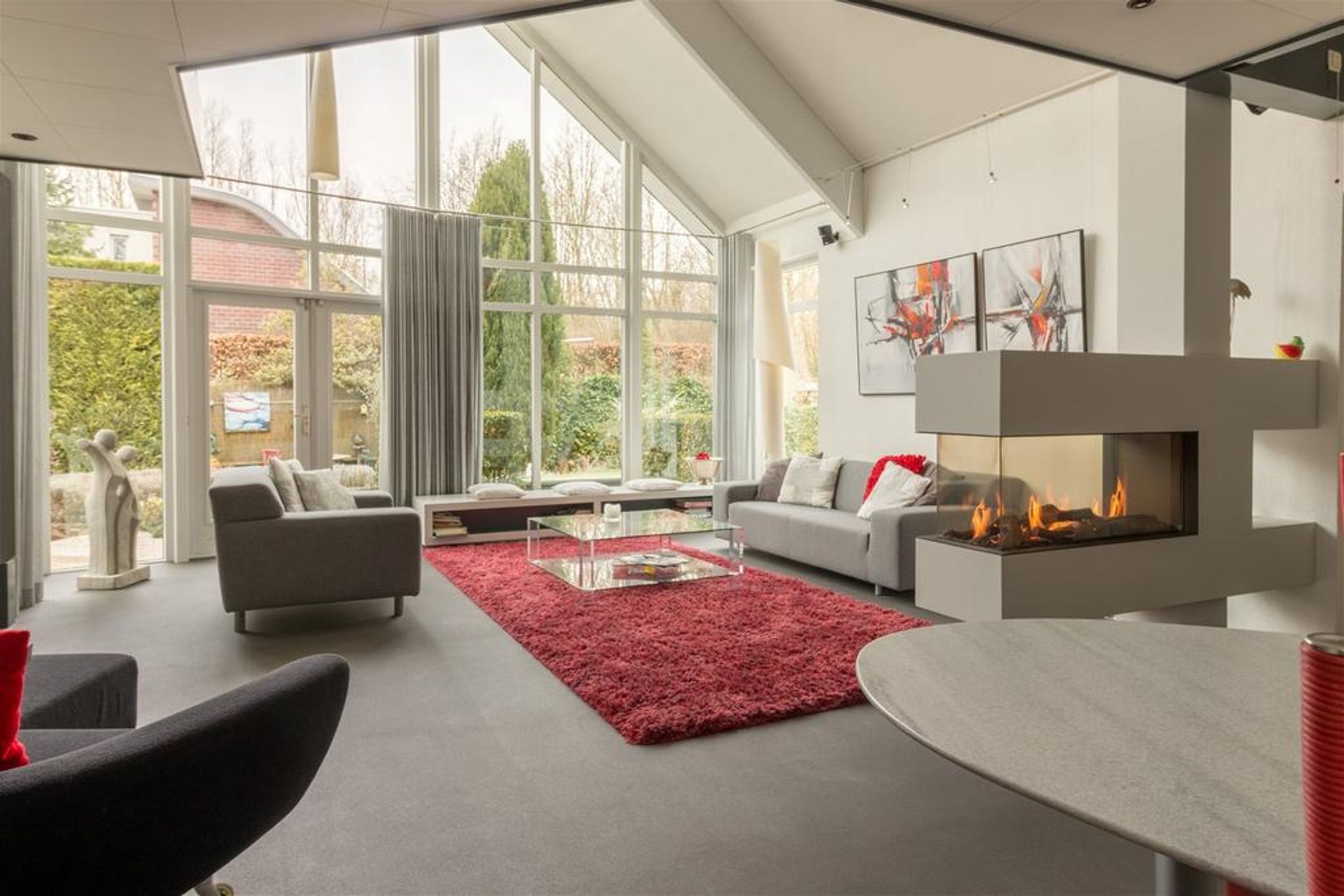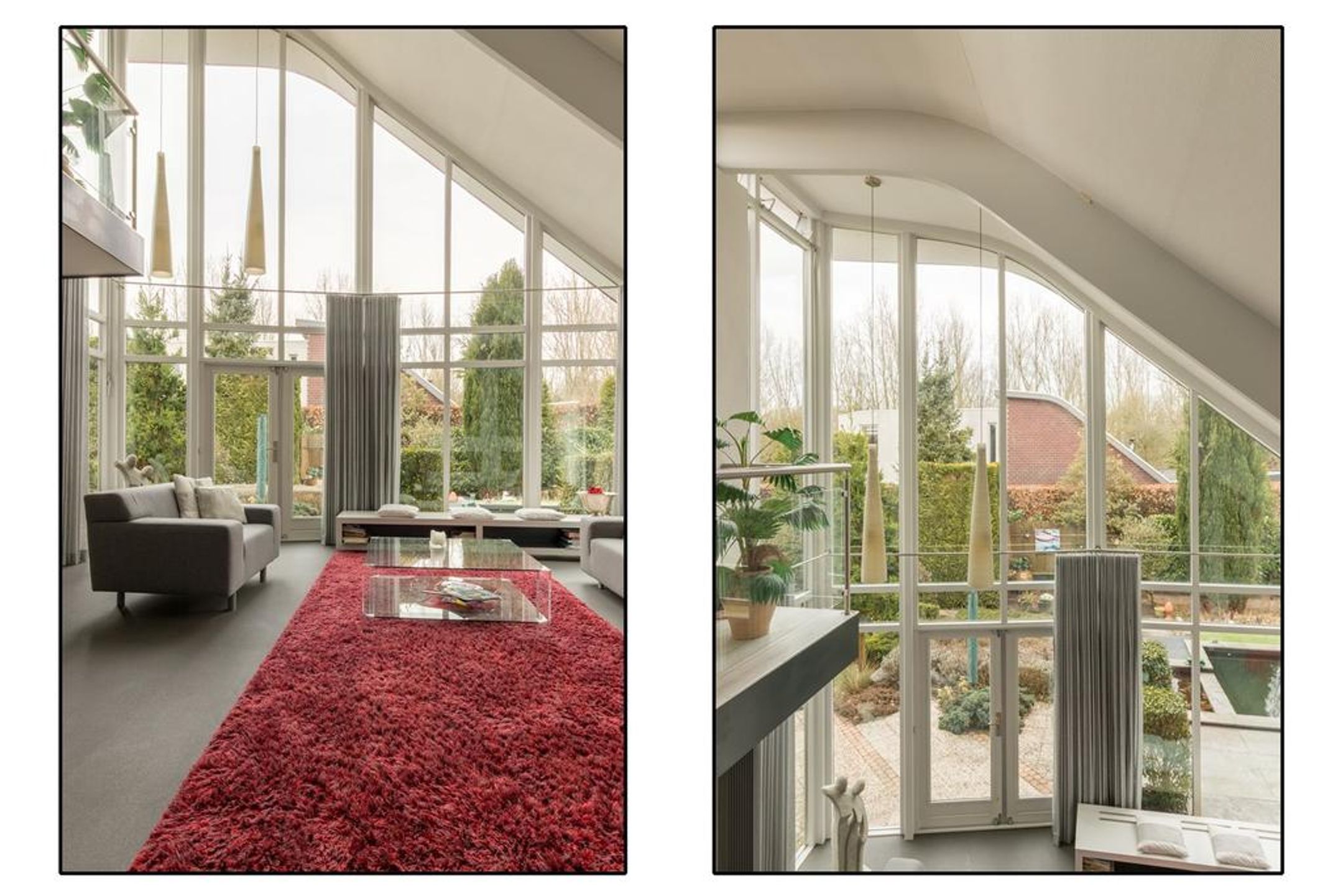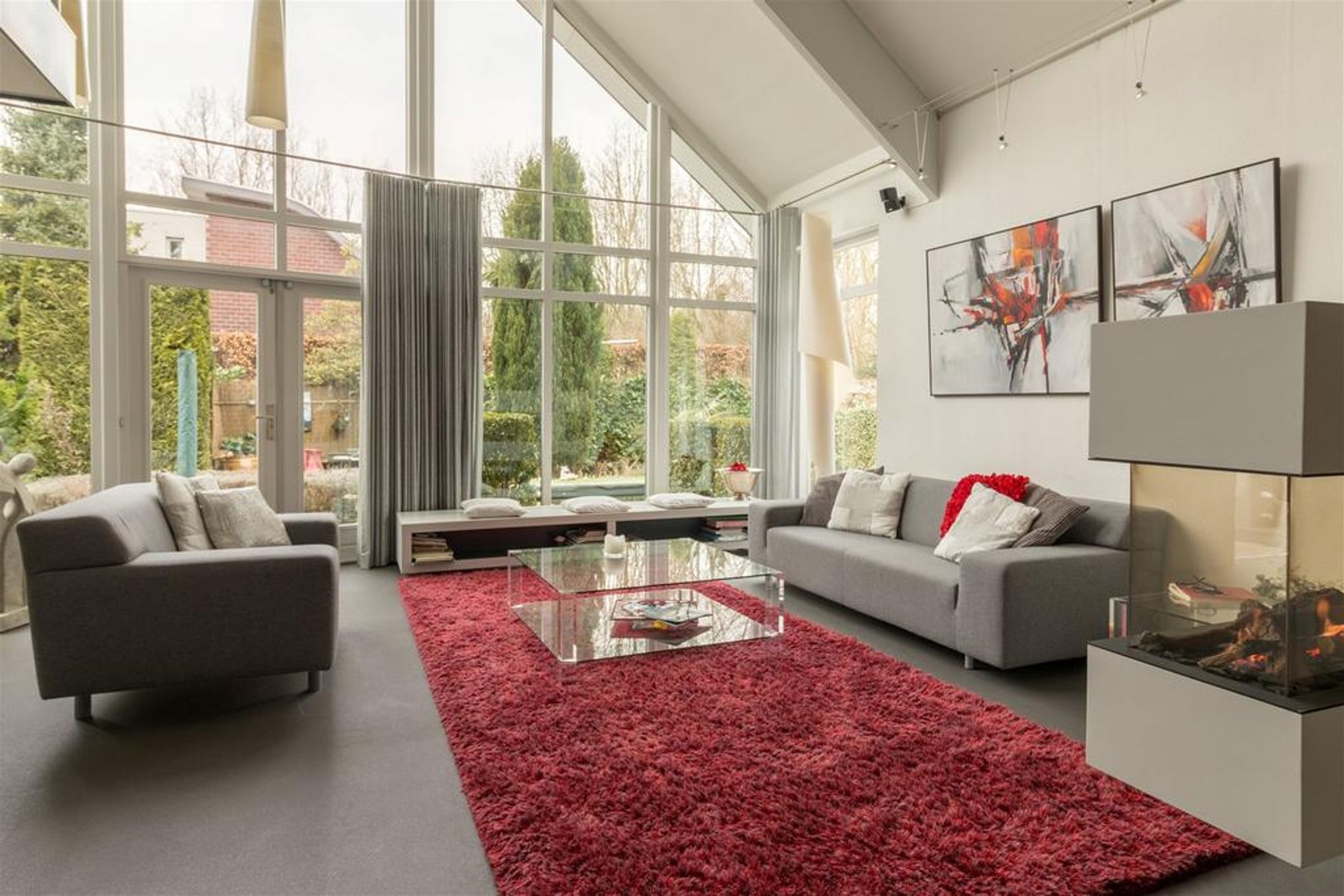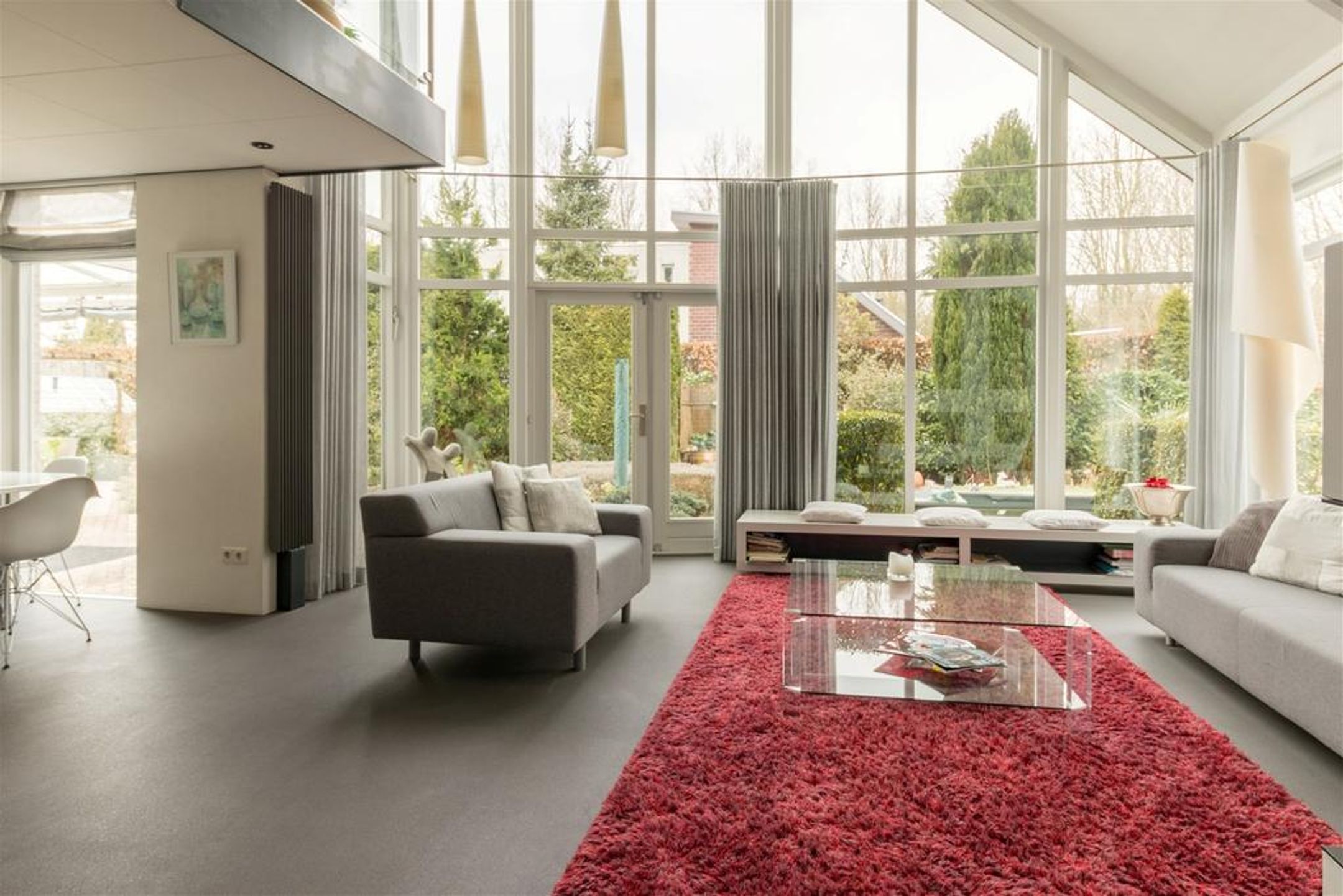 De woonkamer is ingedeeld met zithoek en hoge brede gevel vullende raampartij over de gehele breedte met uitzicht op de tuin, dubbele openslaande deuren naar het zonneterras.