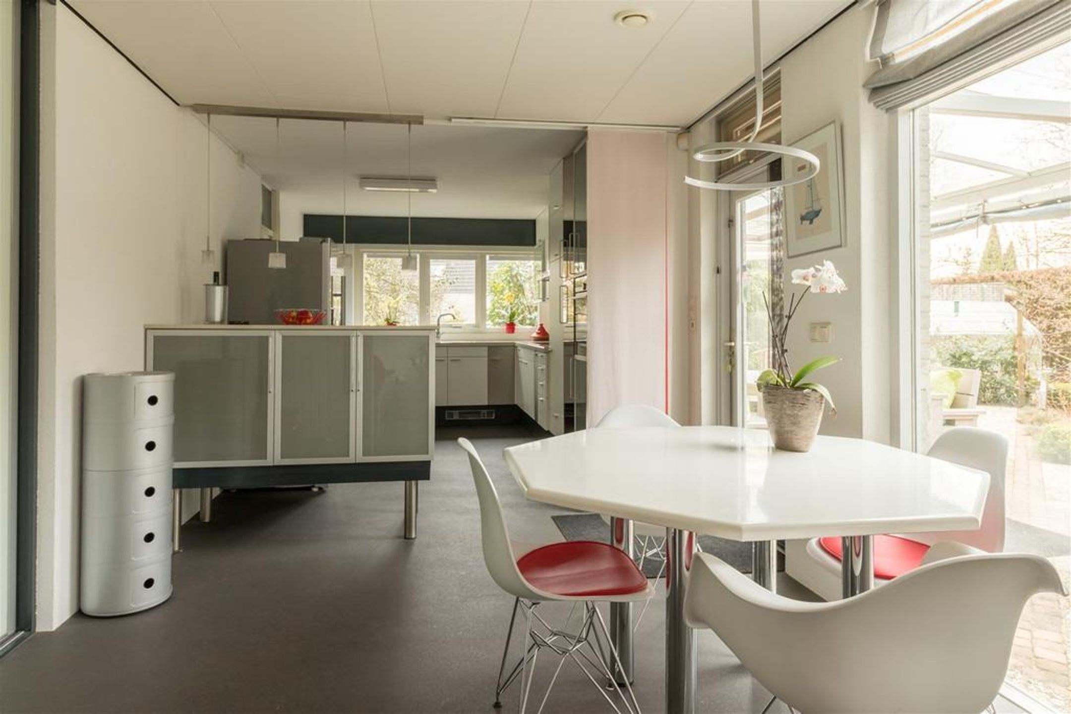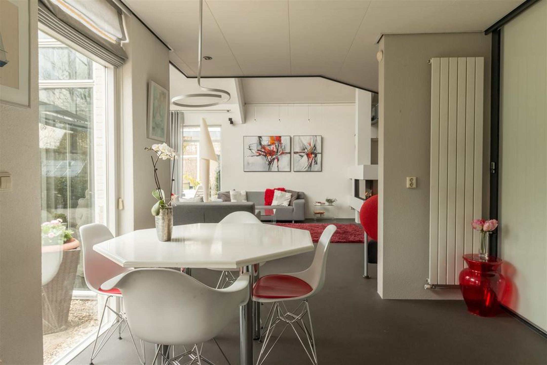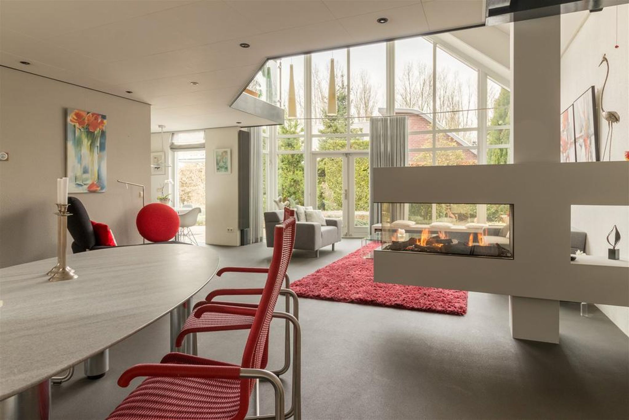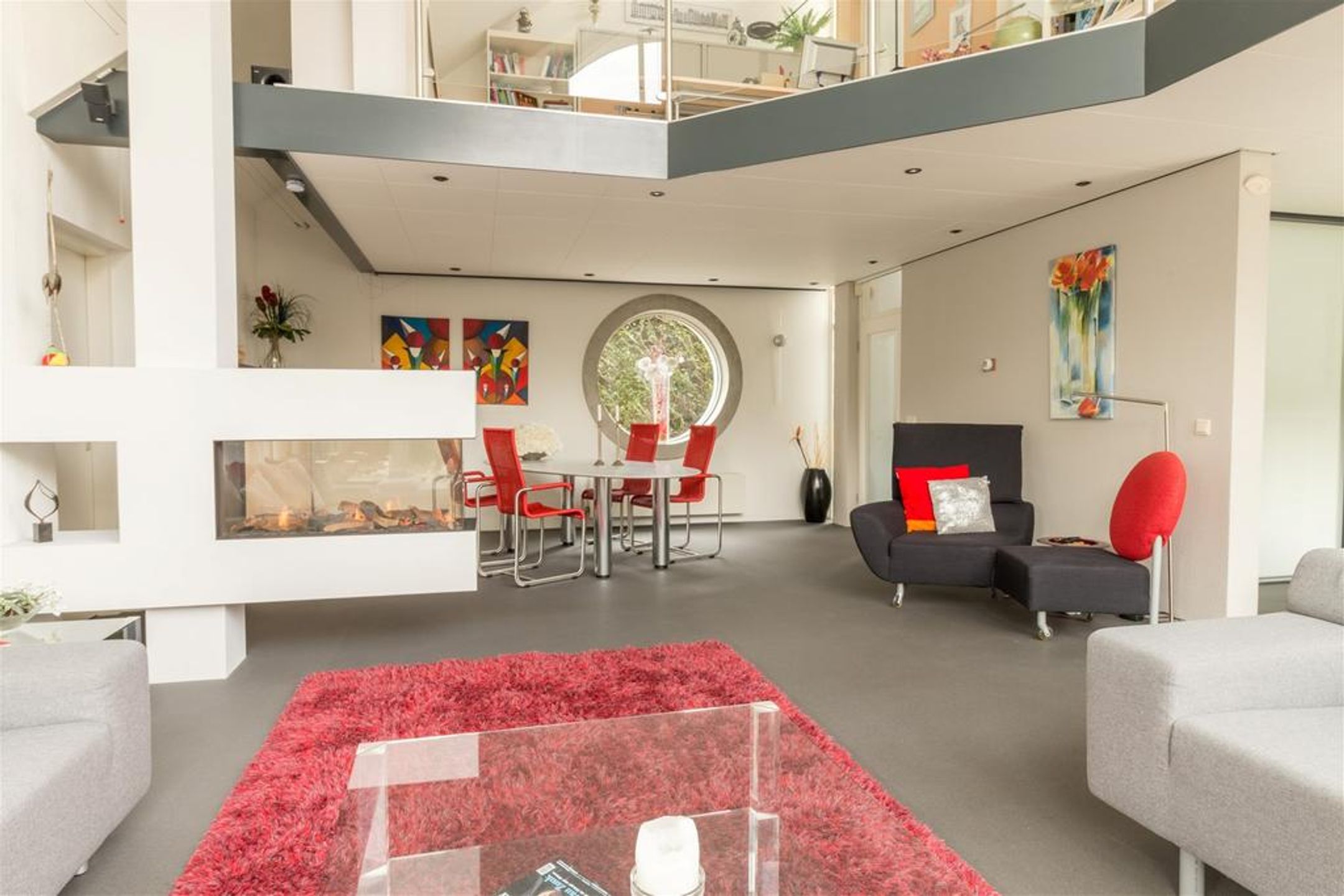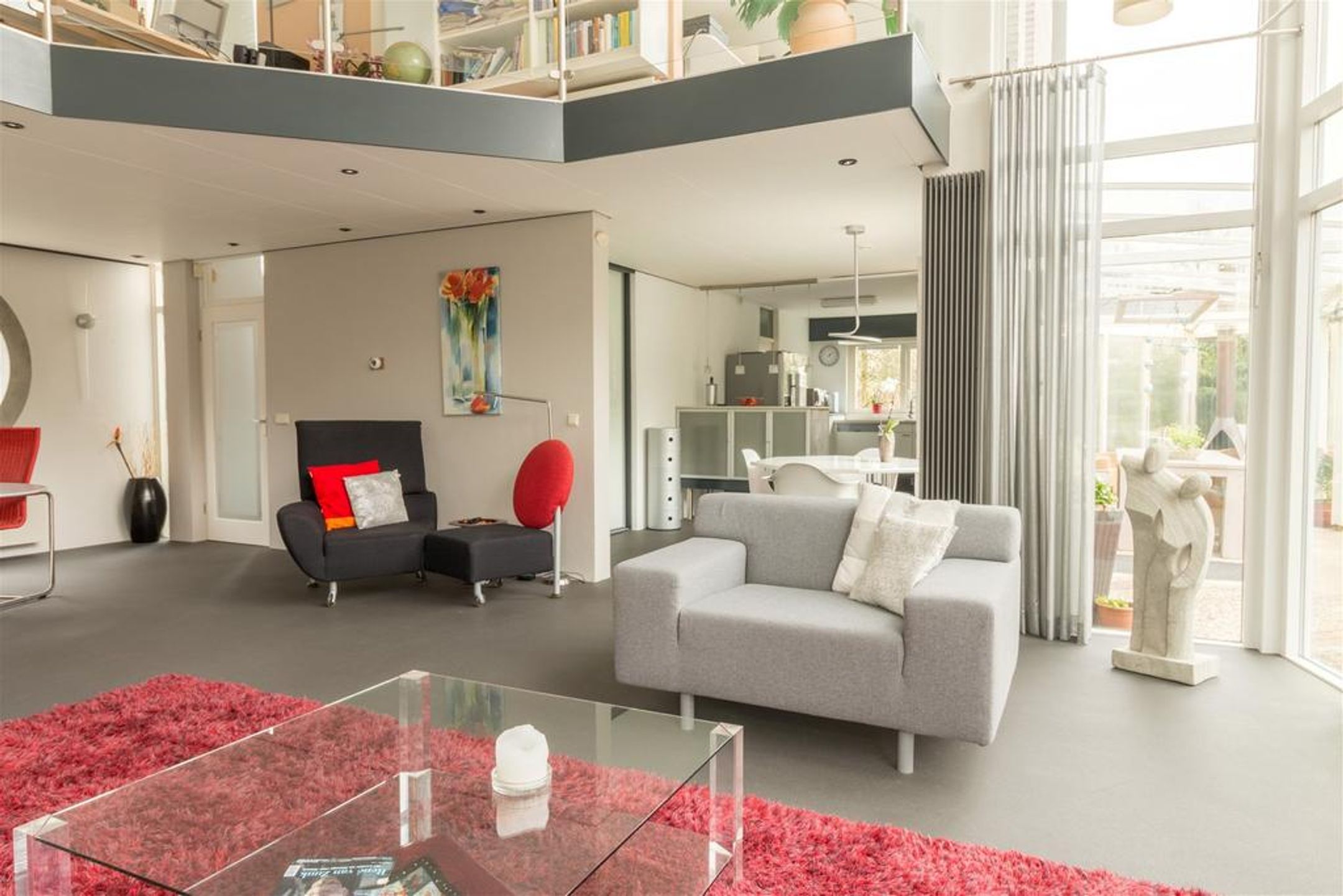 De woonkamer is ingedeeld met zithoek en hoge brede gevel vullende raampartij over de gehele breedte met uitzicht op de tuin, dubbele openslaande deuren naar het zonneterras.