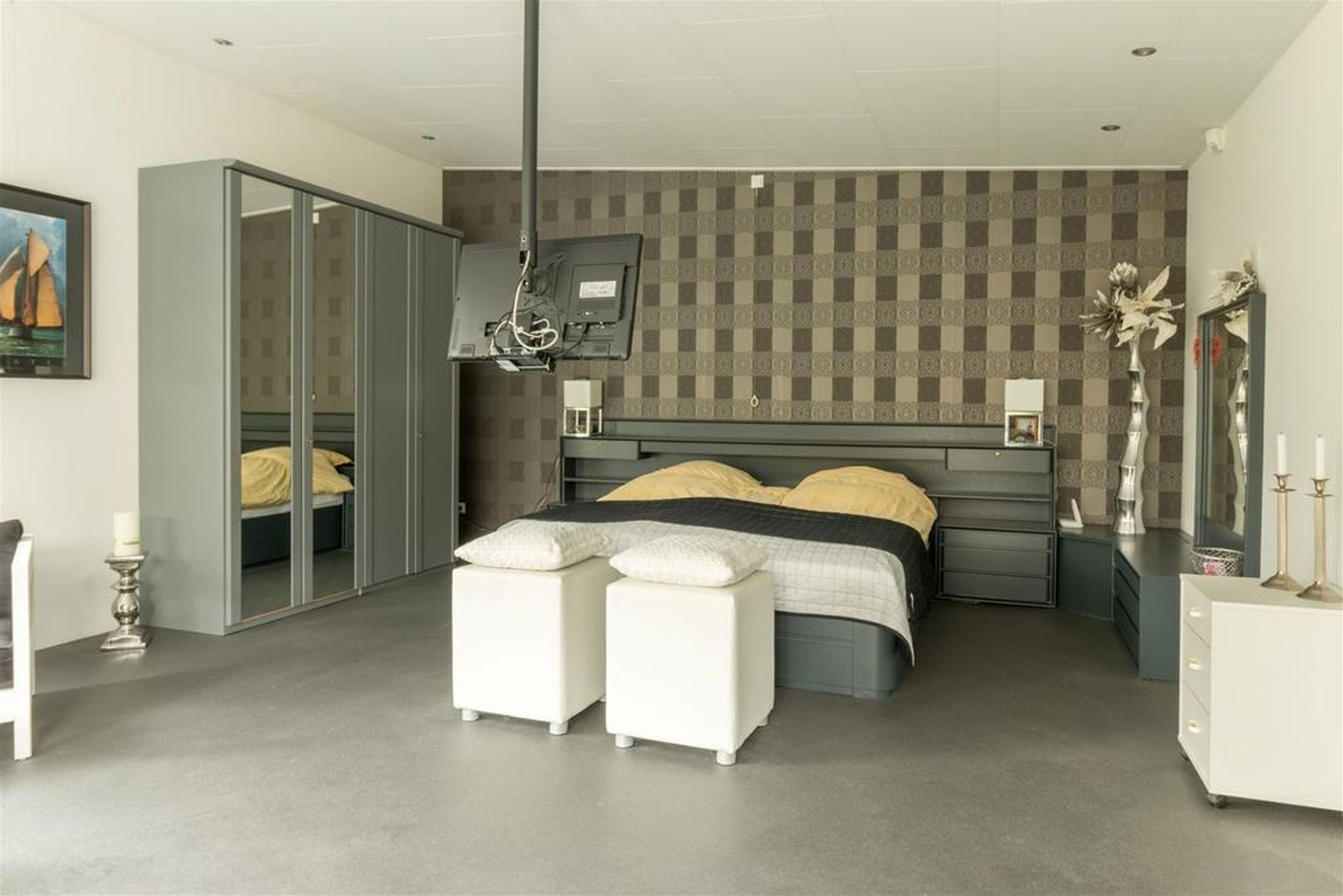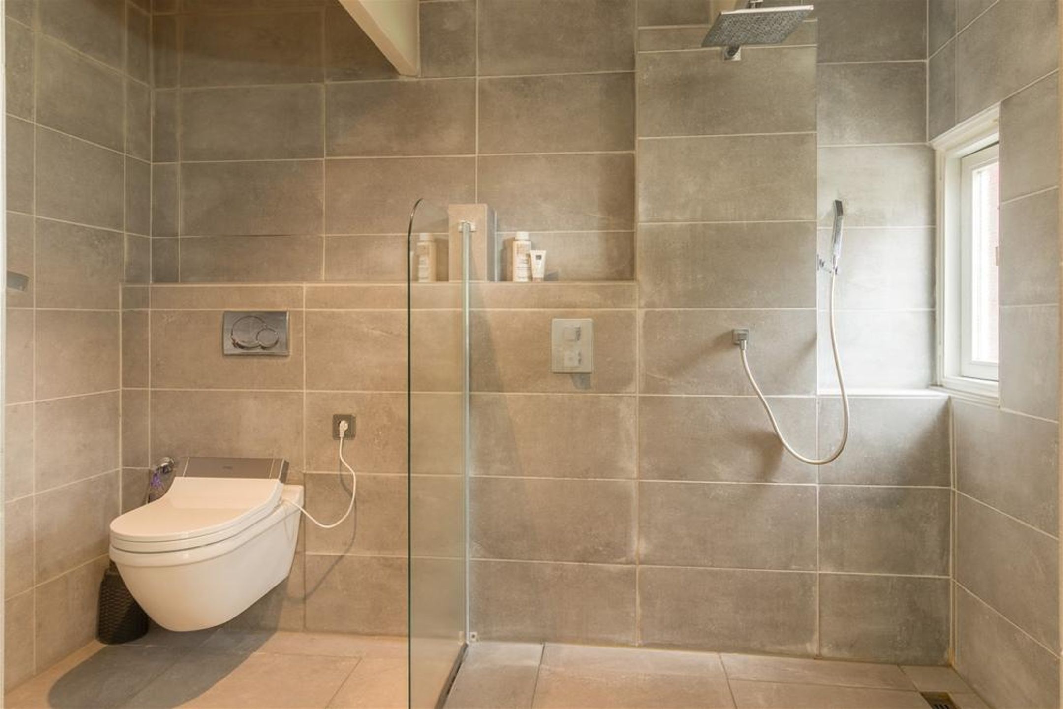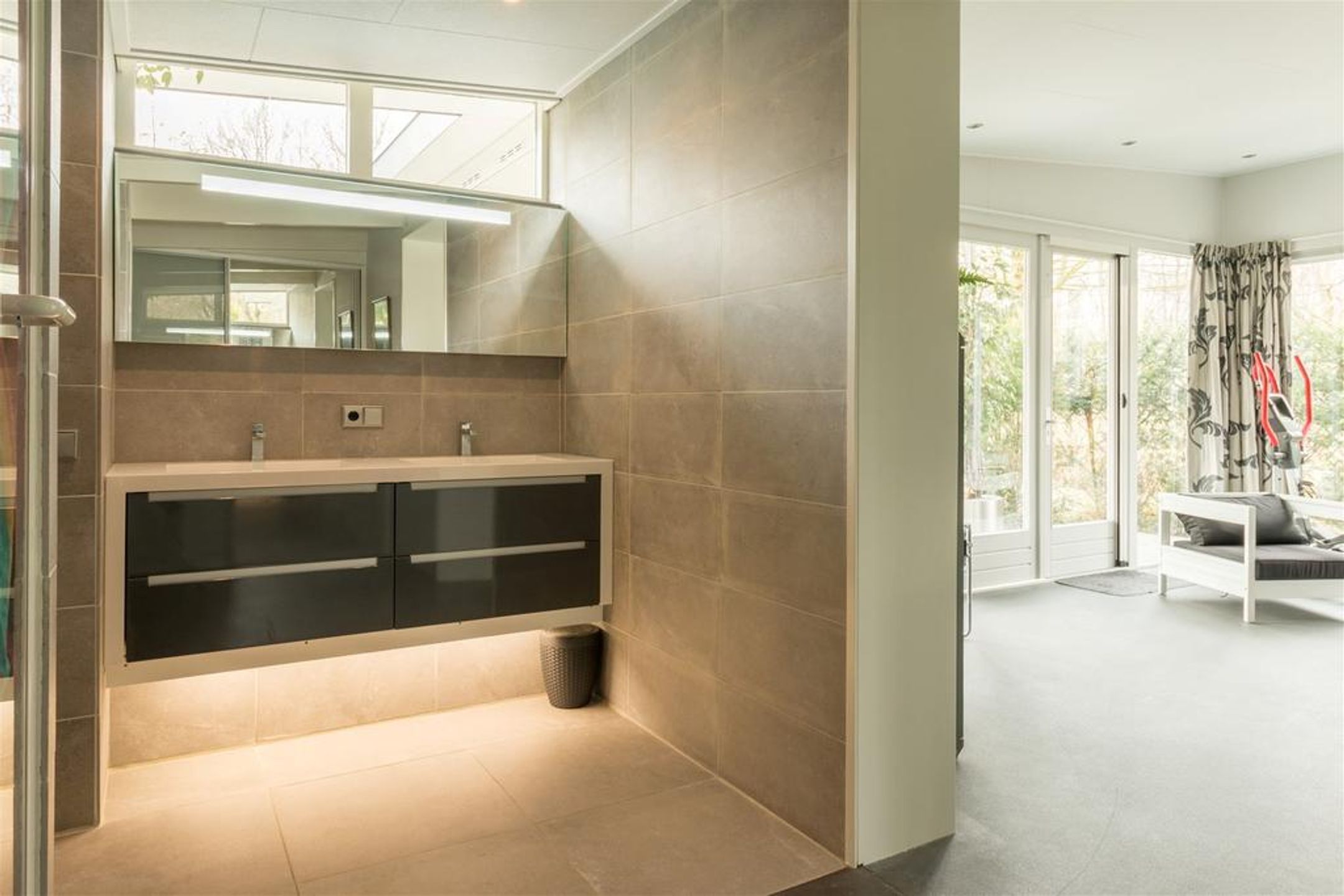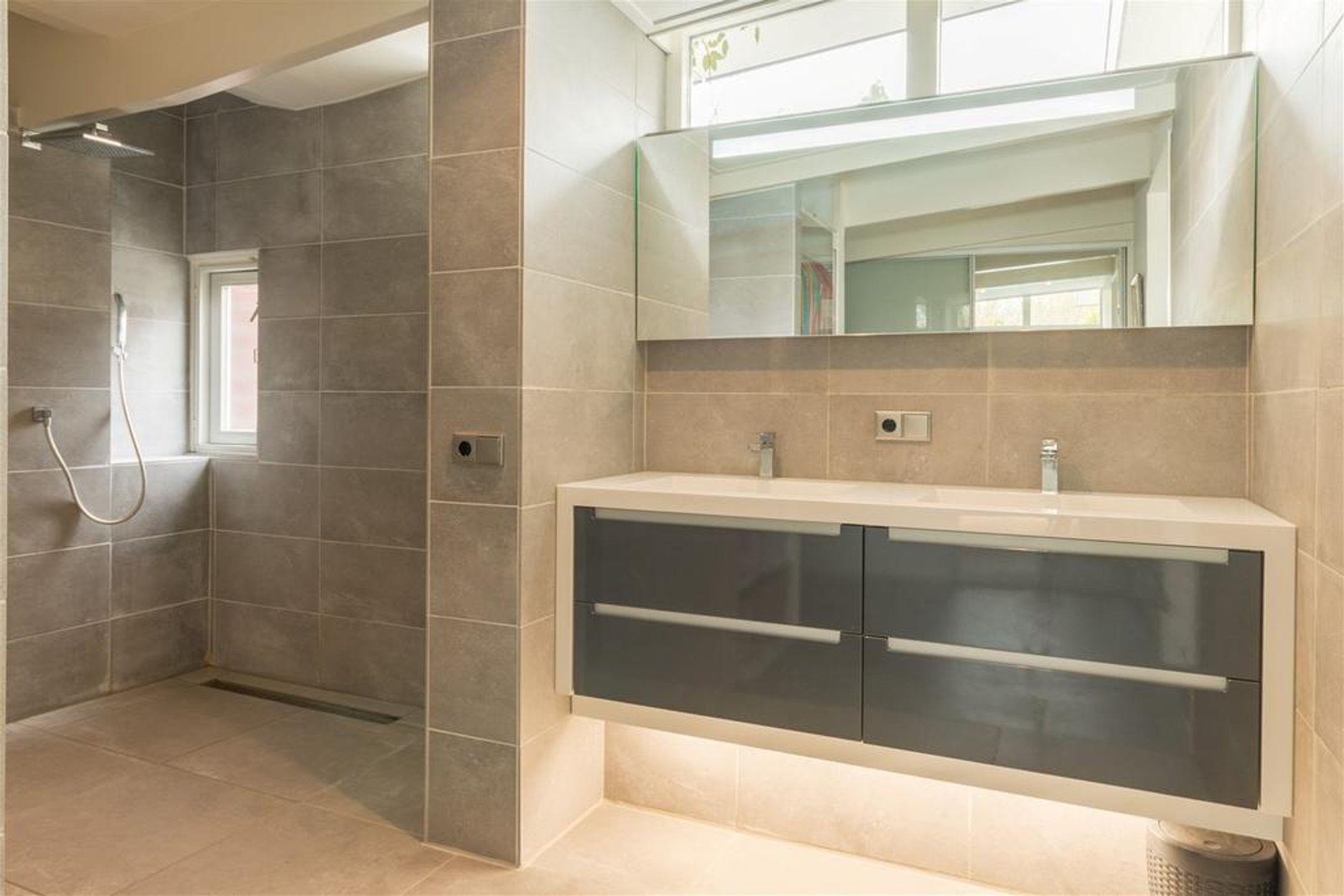 met een grote inloop/walk-in kledingkast, ruime badkamer met inloopdouche, moderne wandtegels tot plafond en vloertegels, dubbele wastafel en vrij hangend Duravit sensowash closet; grote zit-/slaapkamer met uitzicht op de heerlijk zonnige tuin en boswal; het achterterras is via deze zit-/slaapkamer bereikbaar met dubbele openslaande