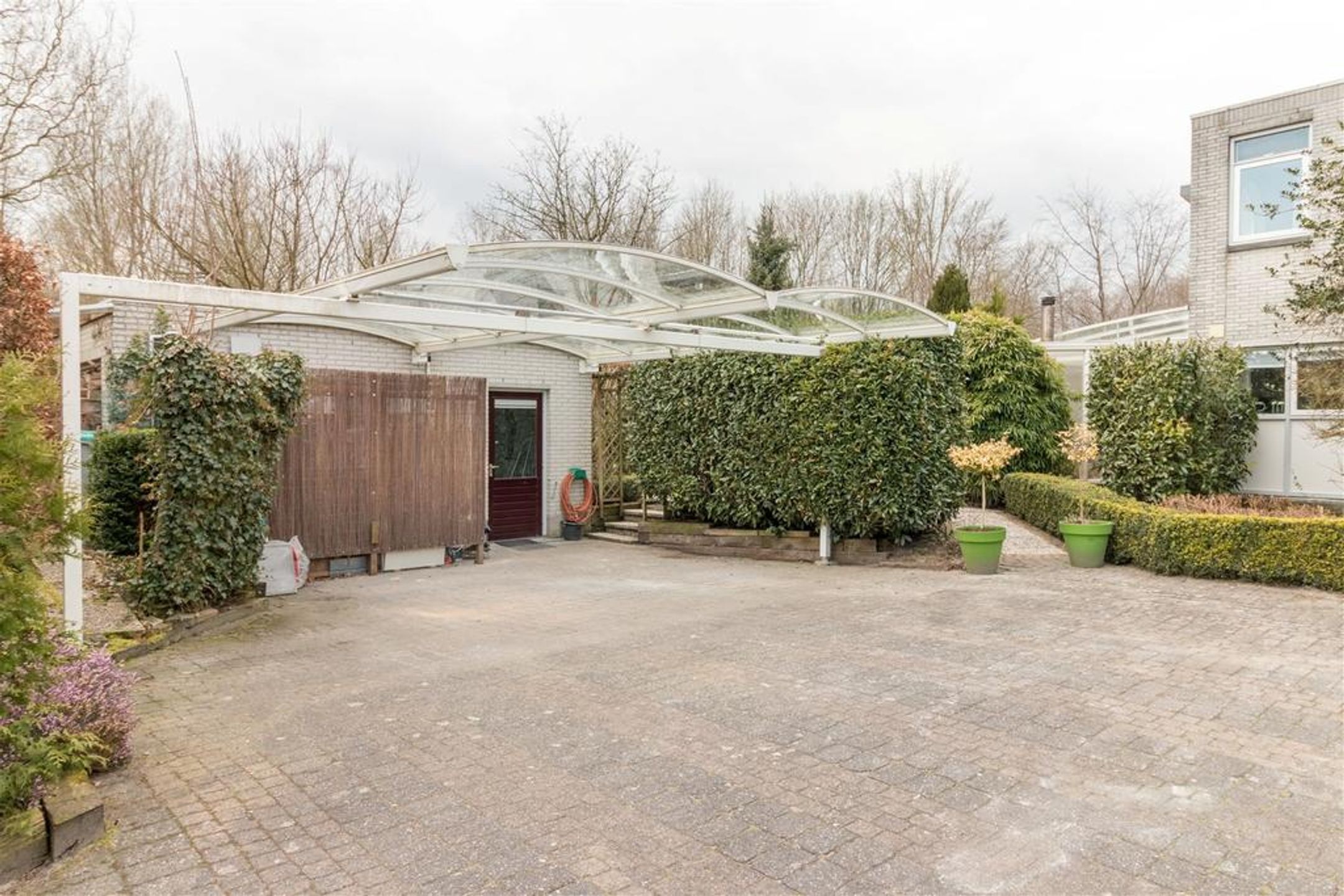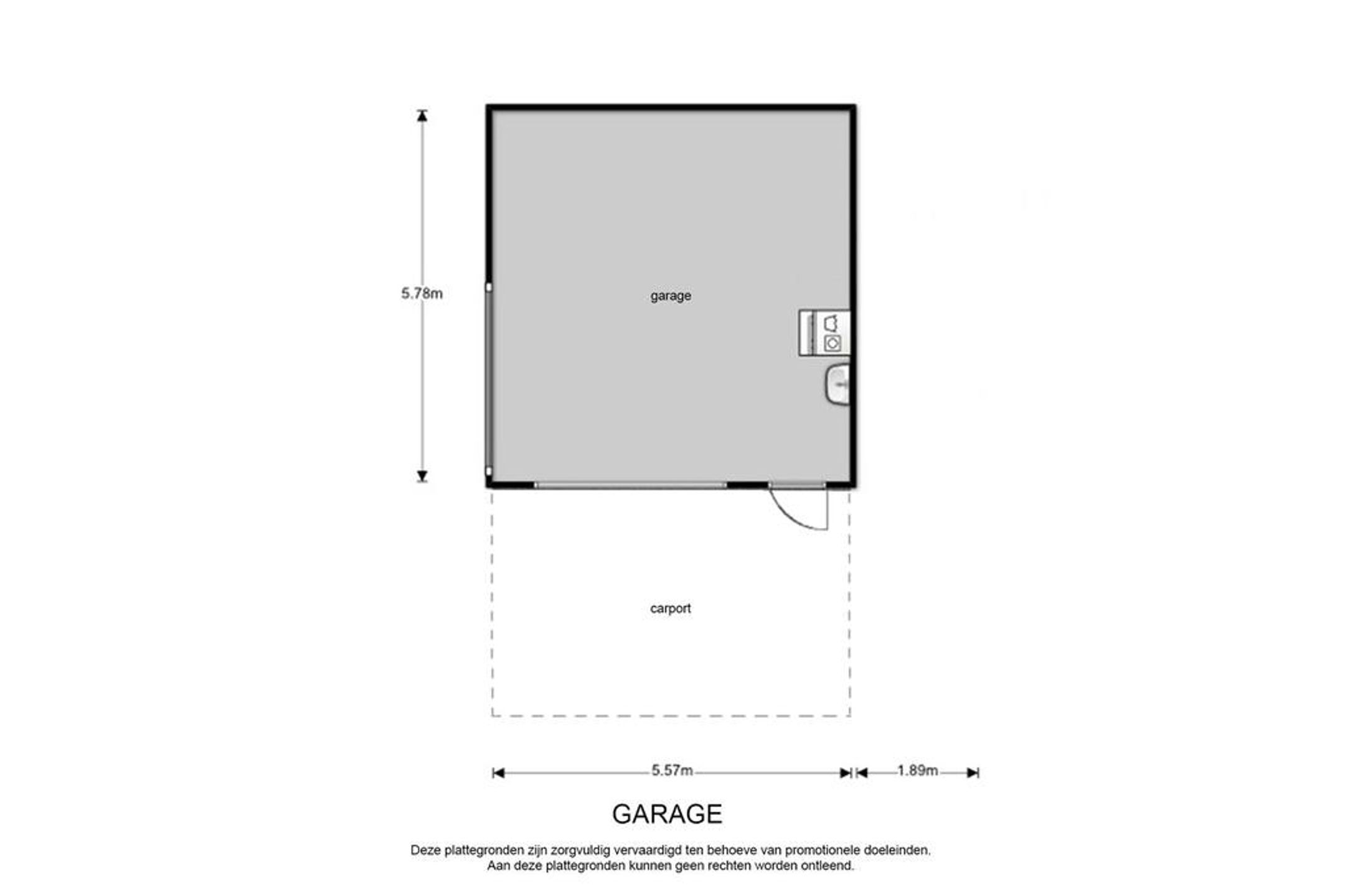 De vrijstaande grote garage aan de voorzijde is extra hoog met vliering en opgebouwd in dubbele muren met spouw en volledig geïsoleerd, betegelde vloer en wasmachine- en drogeraansluiting. Aan de voorzijde is de carport met plaats voor 2 voertuigen. De garage is thans in gebruik als berging/werkplaats.