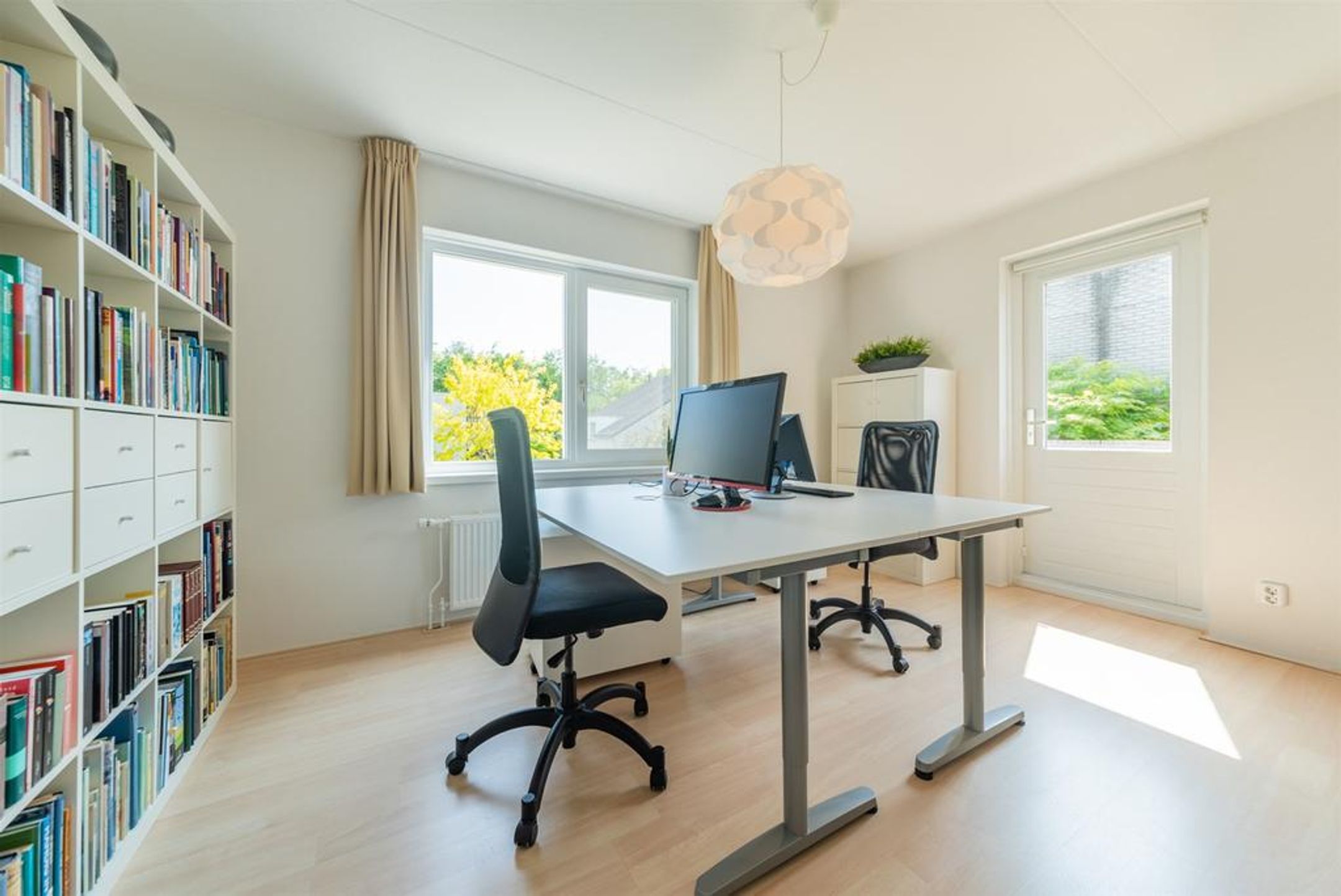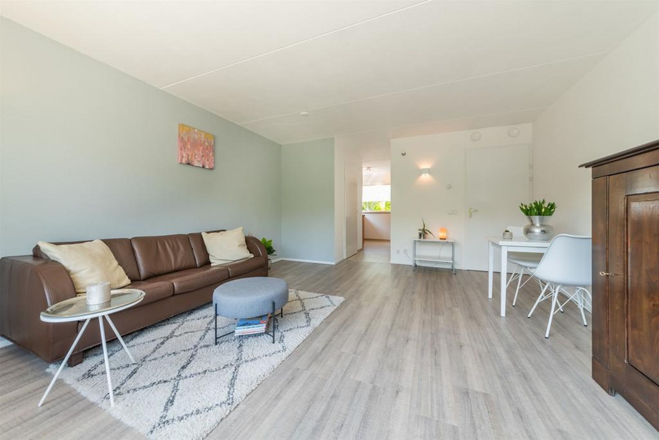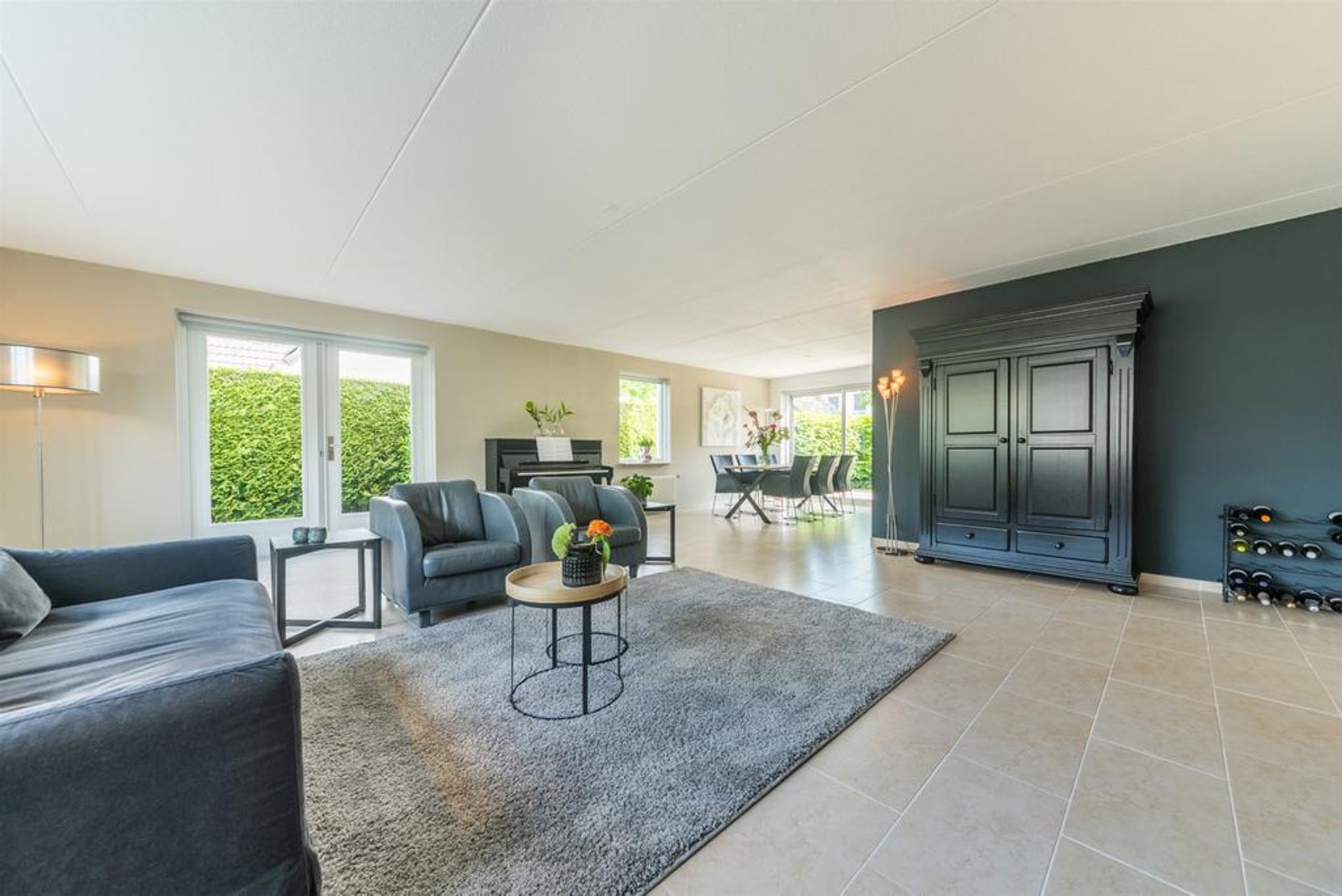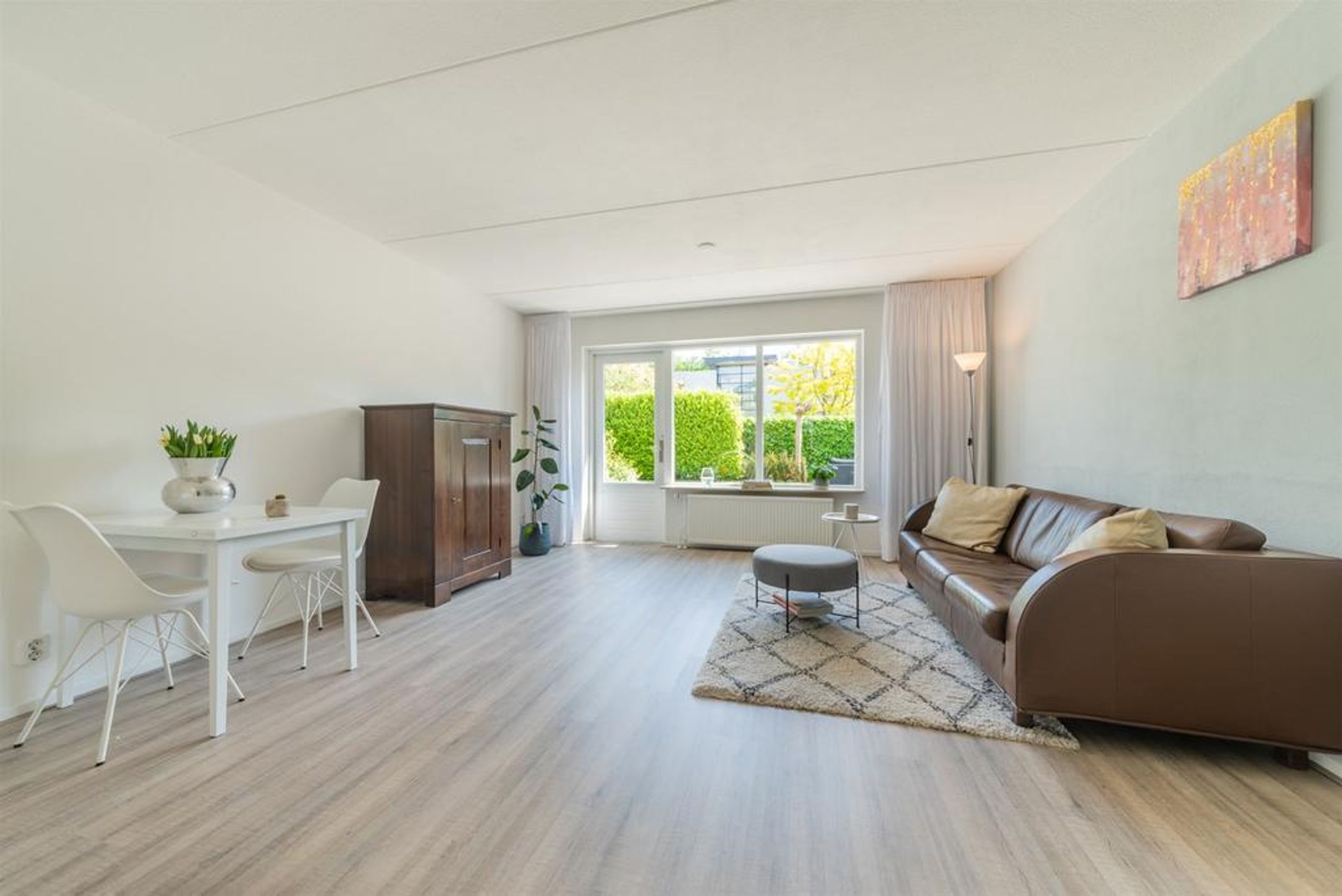 Op de vloer van de tuingerichte living ligt een fraai laminaat. Het grote raampartij voorzien van deur biedt zicht en toegang tot de achtertuin.