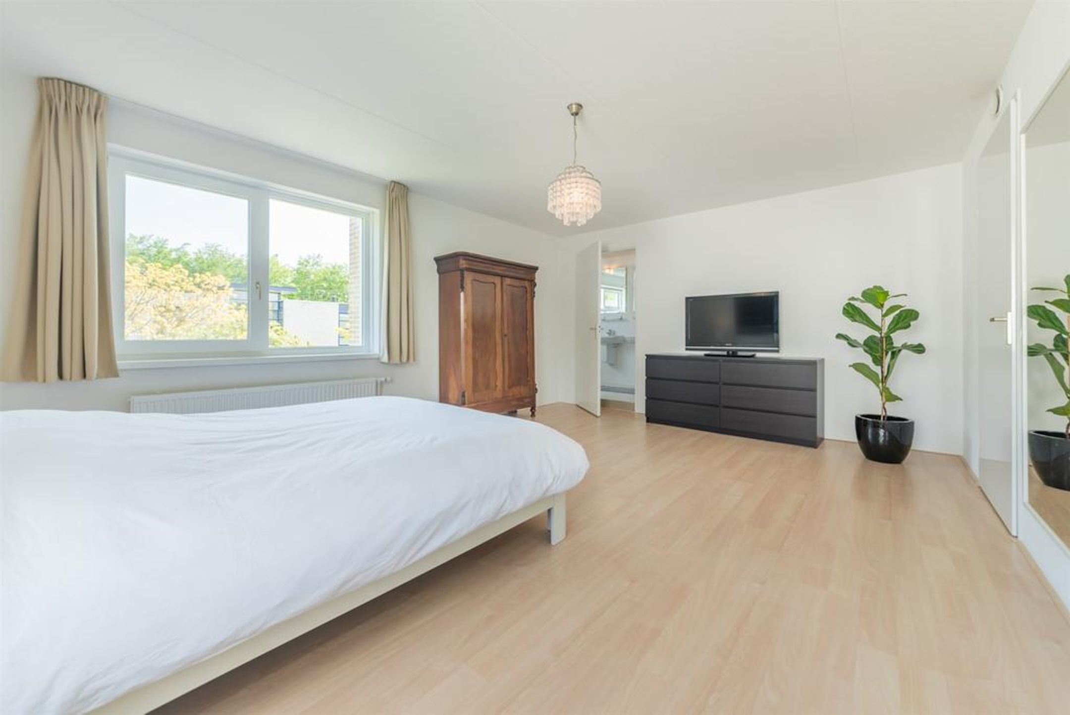 De ruime master-bedroom is voorzien van een inloopgarderobe en een eigen badkamer. Deze badkamer is betegeld met witte wand en vloertegels. Een raam biedt wenselijk daglicht en ventilatie. Voorts treft u een ligbad met thermostaatkraan, een douchecabine voorzien van glazen schuifdeur en thermostaatkraan, twee wastafels, twee planchet en twee spiegels met verlichting en een closet.