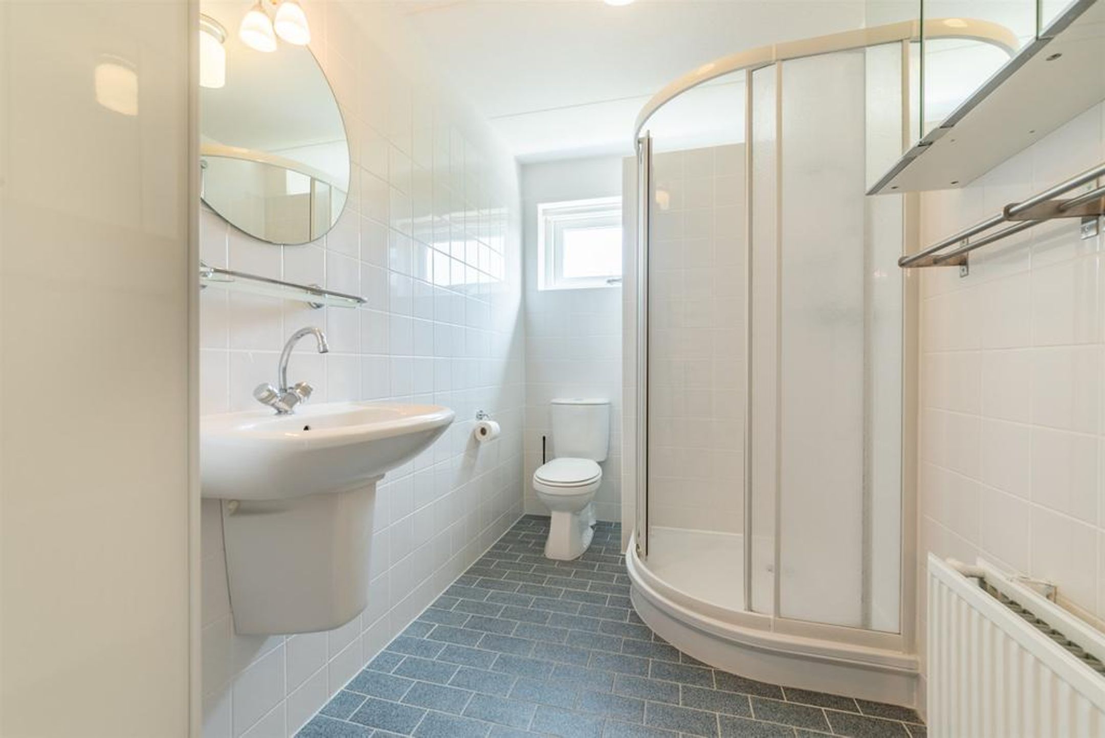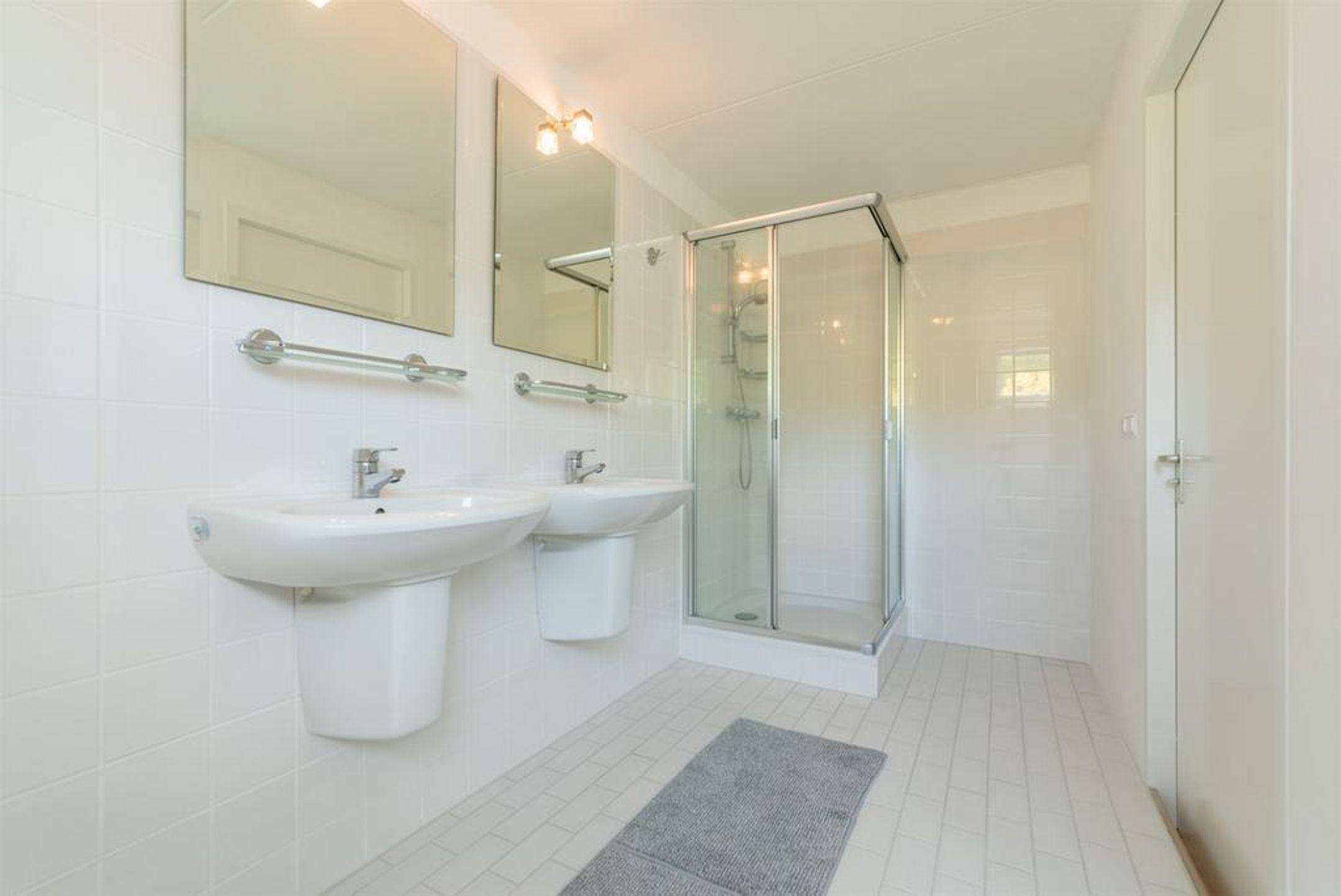 De tweede badkamer op deze verdieping is direct toegankelijk vanaf de overloop en is betegeld met witte wandtegels gecombineerd met blauw/grijze vloertegels. Ook hier draagt een raam zorg voor licht en ventilatie. Verder is deze badkamer ingericht met een douchecabine met kunststof schuifdeur en thermostaatkraan, een wastafel voorzien van planchet en spiegel, een wit hoogglans wandmodule en een spiegelkast.