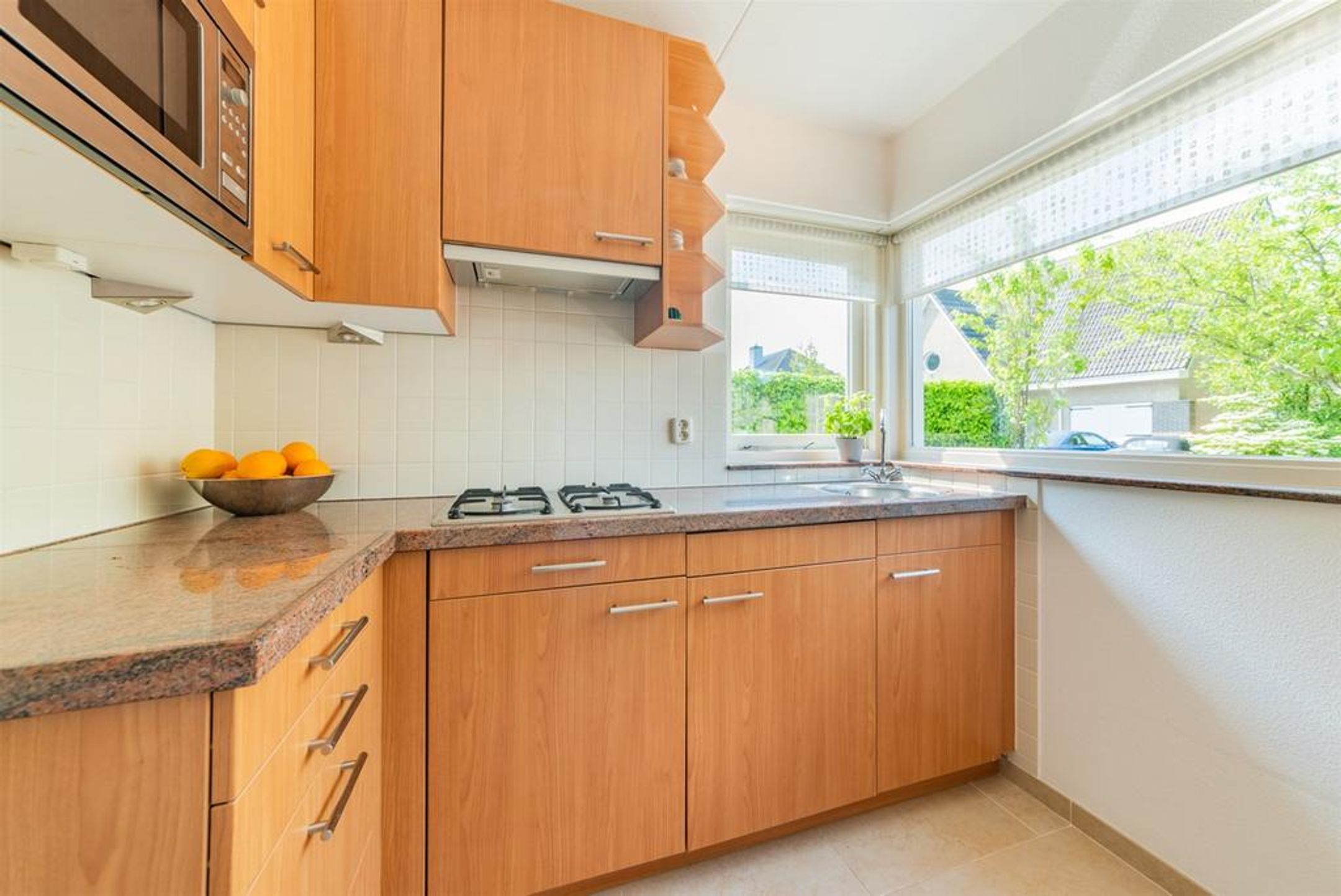 In de keuken liggen dezelfde grote vloertegels als het hoofdgebouw en de hal. Een hoekraam draagt zorg voor wenselijk daglicht. De keuken staat opgesteld in een hoekopstelling en is uitgevoerd met hout look fronten gecombineerd met een graniet werkblad voorzien van waterkering. Voorts beschikt u over een SIEMENS oven/grill, een 4 pits gaskookplaat, een afzuig unit en een inbouw koelkast.