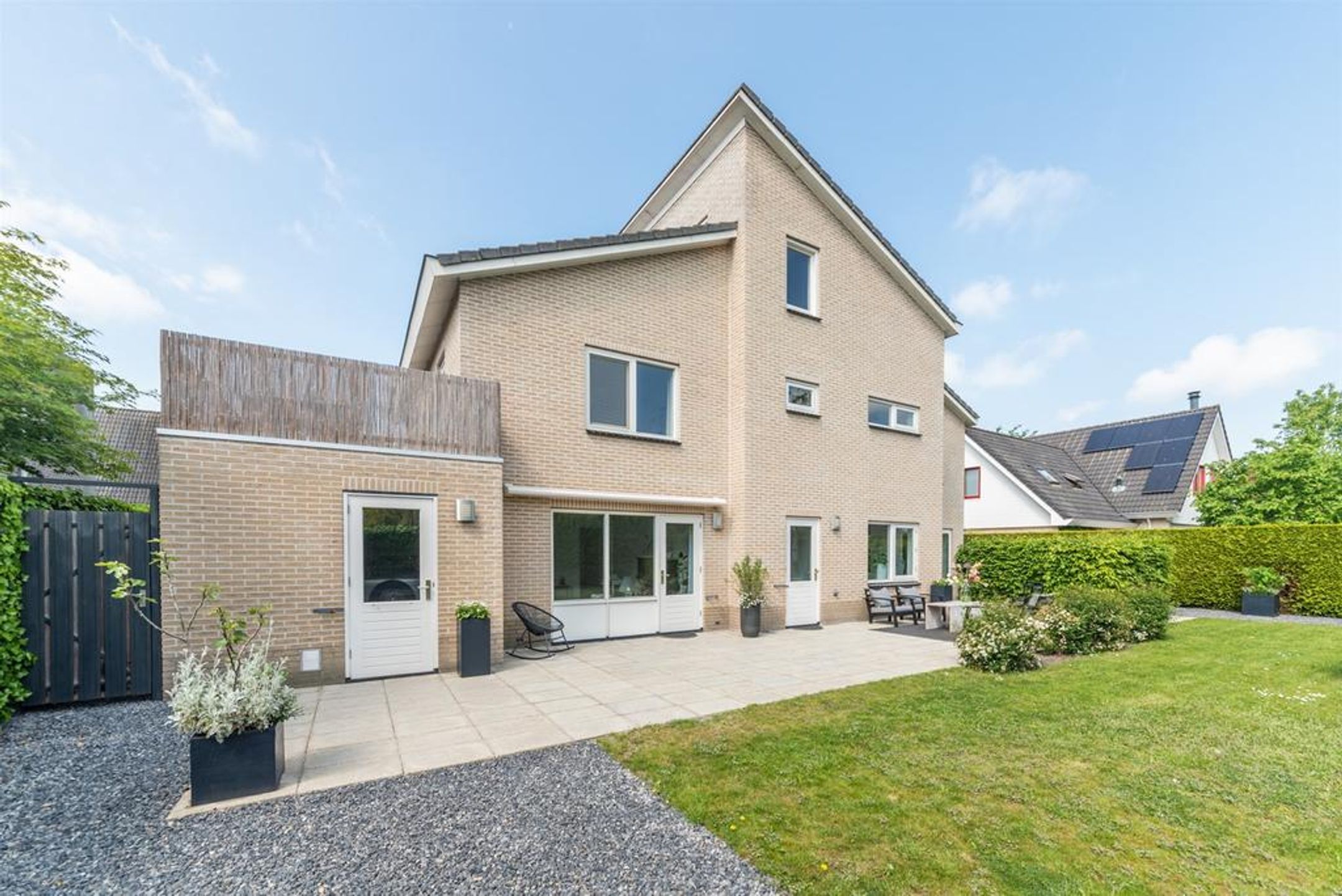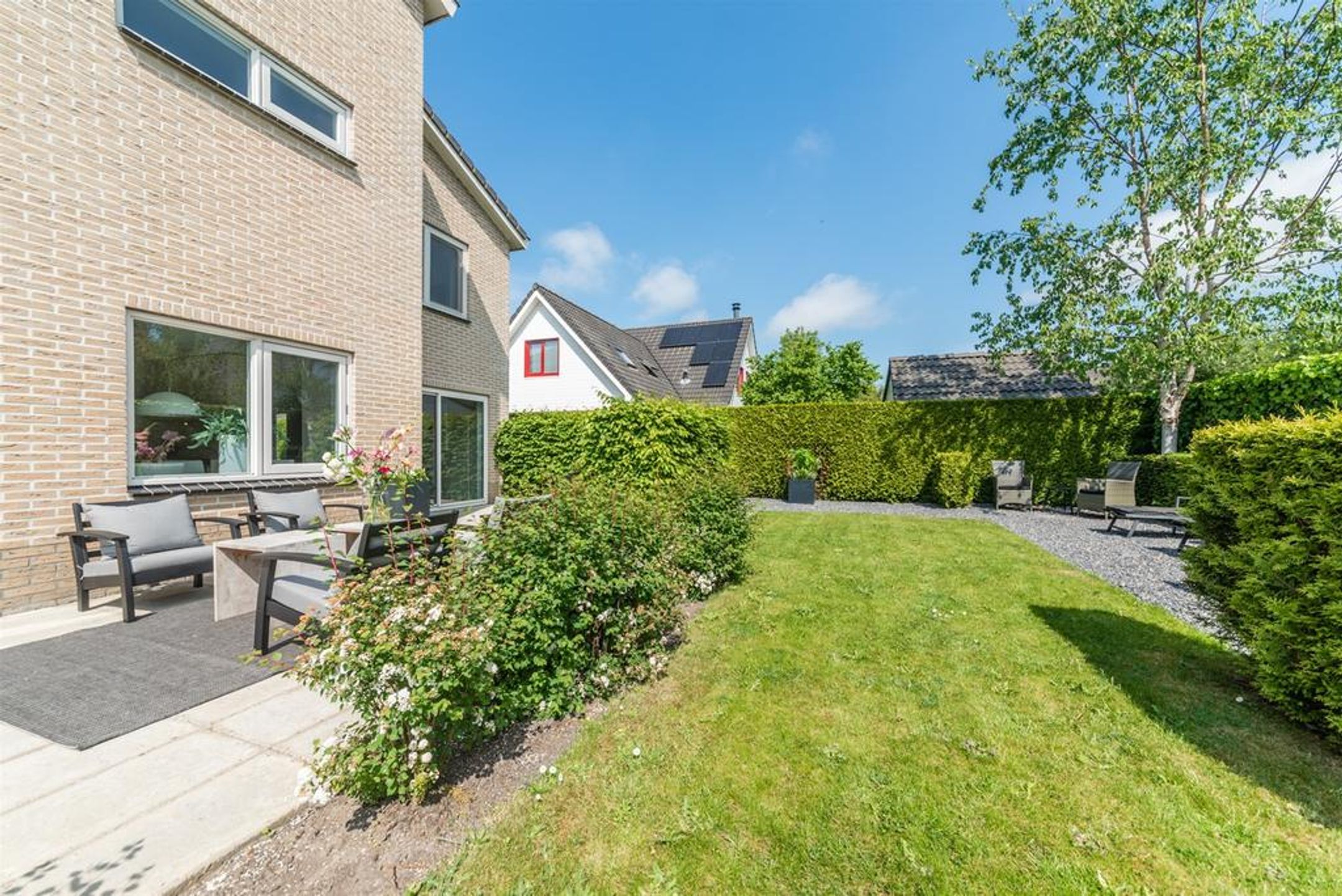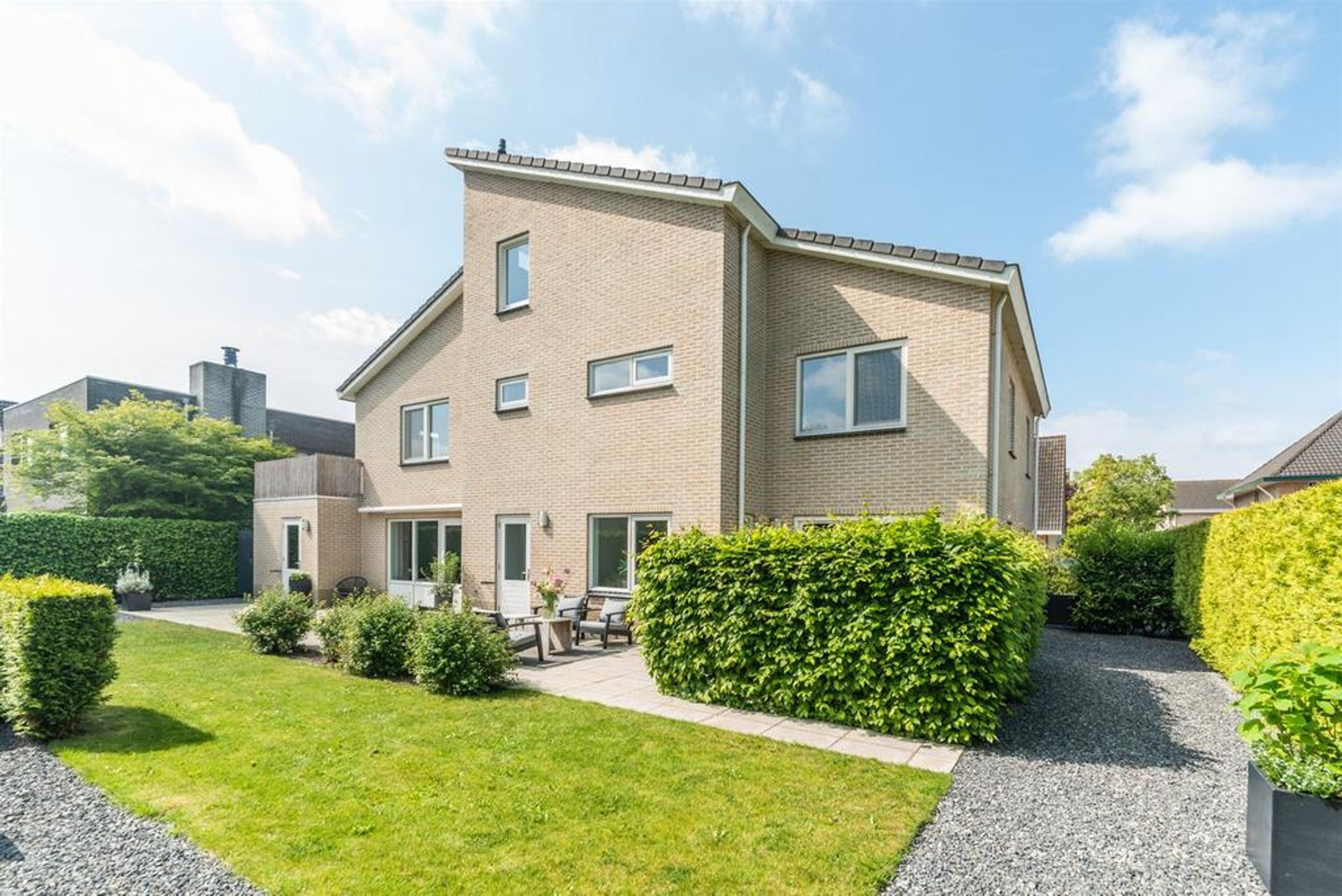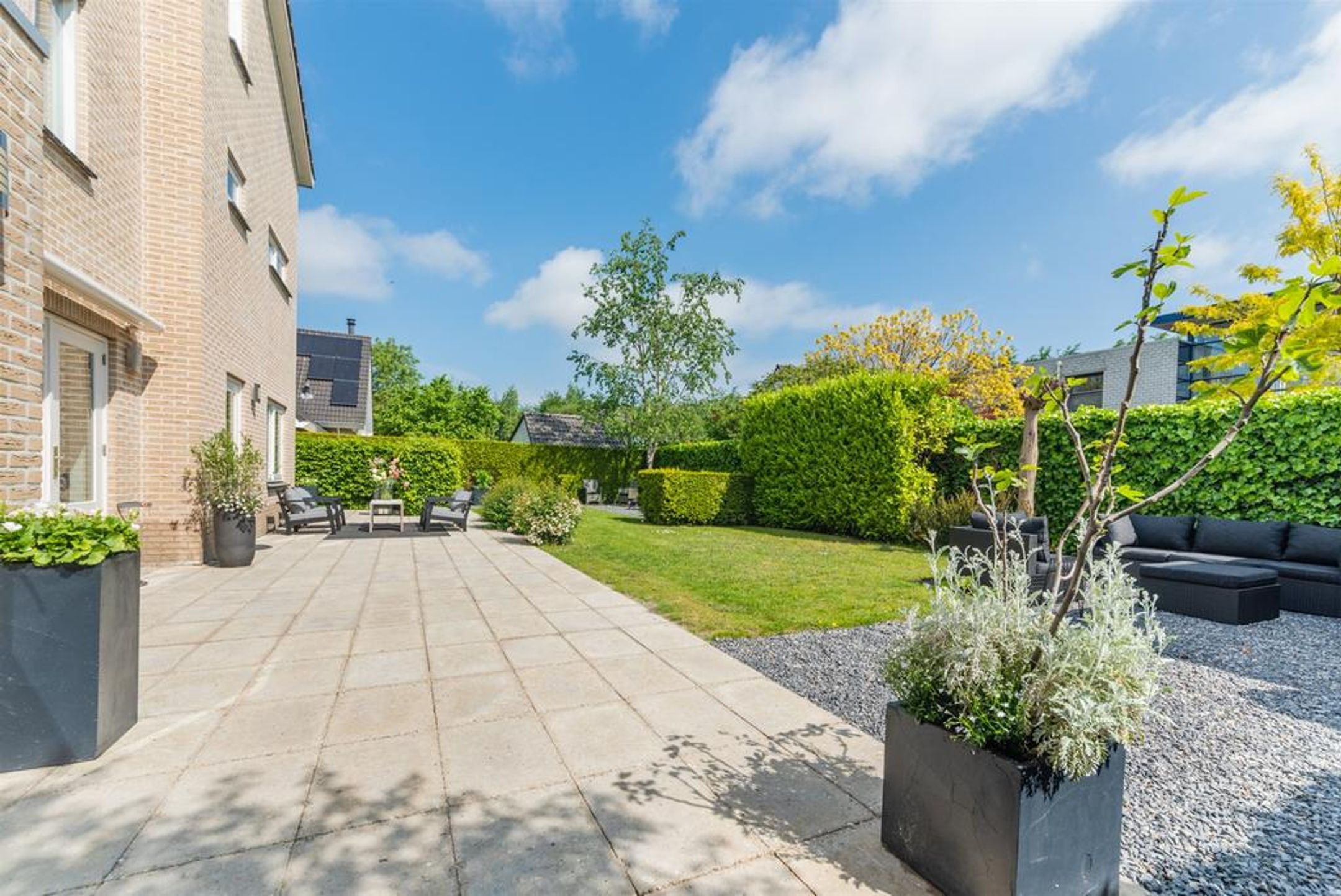 De zeer brede en zonnige achtertuin kenmerkt zich door het zeer brede zonneterras t.p.v. de gevel, de twee terrassen links en rechts achter, het grote gazon, de tegels en siergrind, de groene laurierhagen, taxushagen, conifeerhagen, beukhagen en de diverse tuinkamers voorzien van struiken en bomen.
