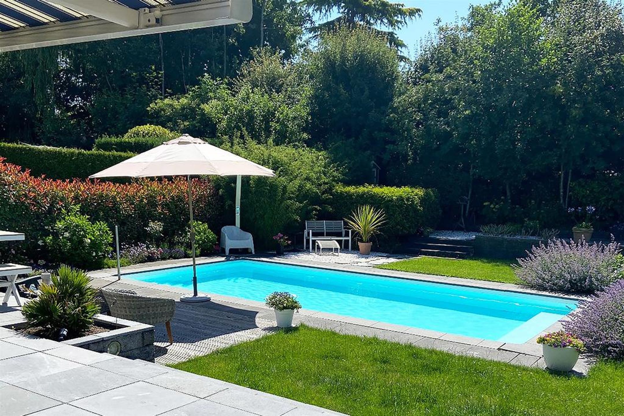 Zwembad is onderheid en voorzien van elektrisch bedienbaar solar zomerdek met afstandsbediening en een winterzeil, voorzien van een Romaanse inlooptrap