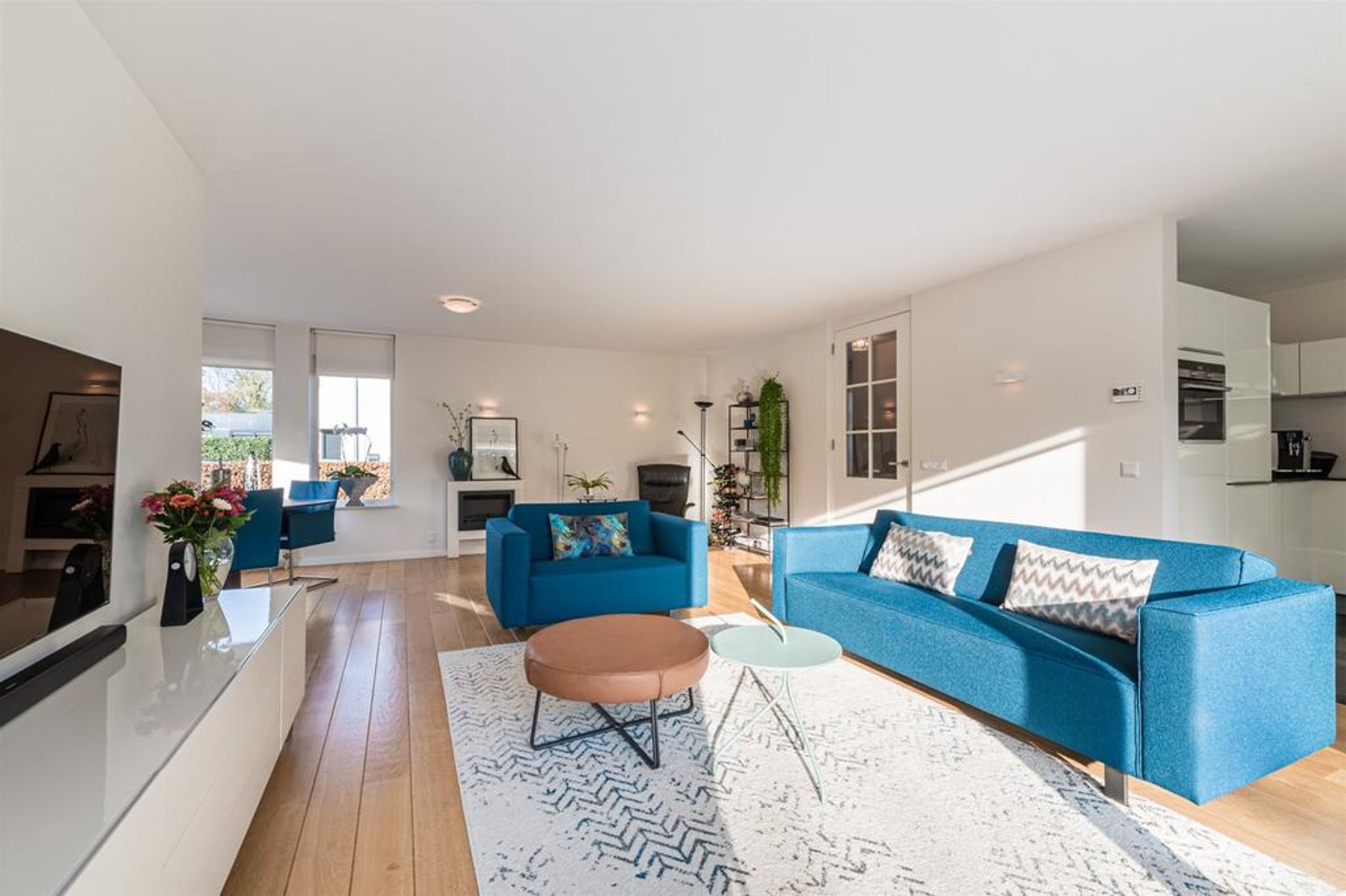 Ruime tuingerichte living met geheel glad gestucte wanden en plafond