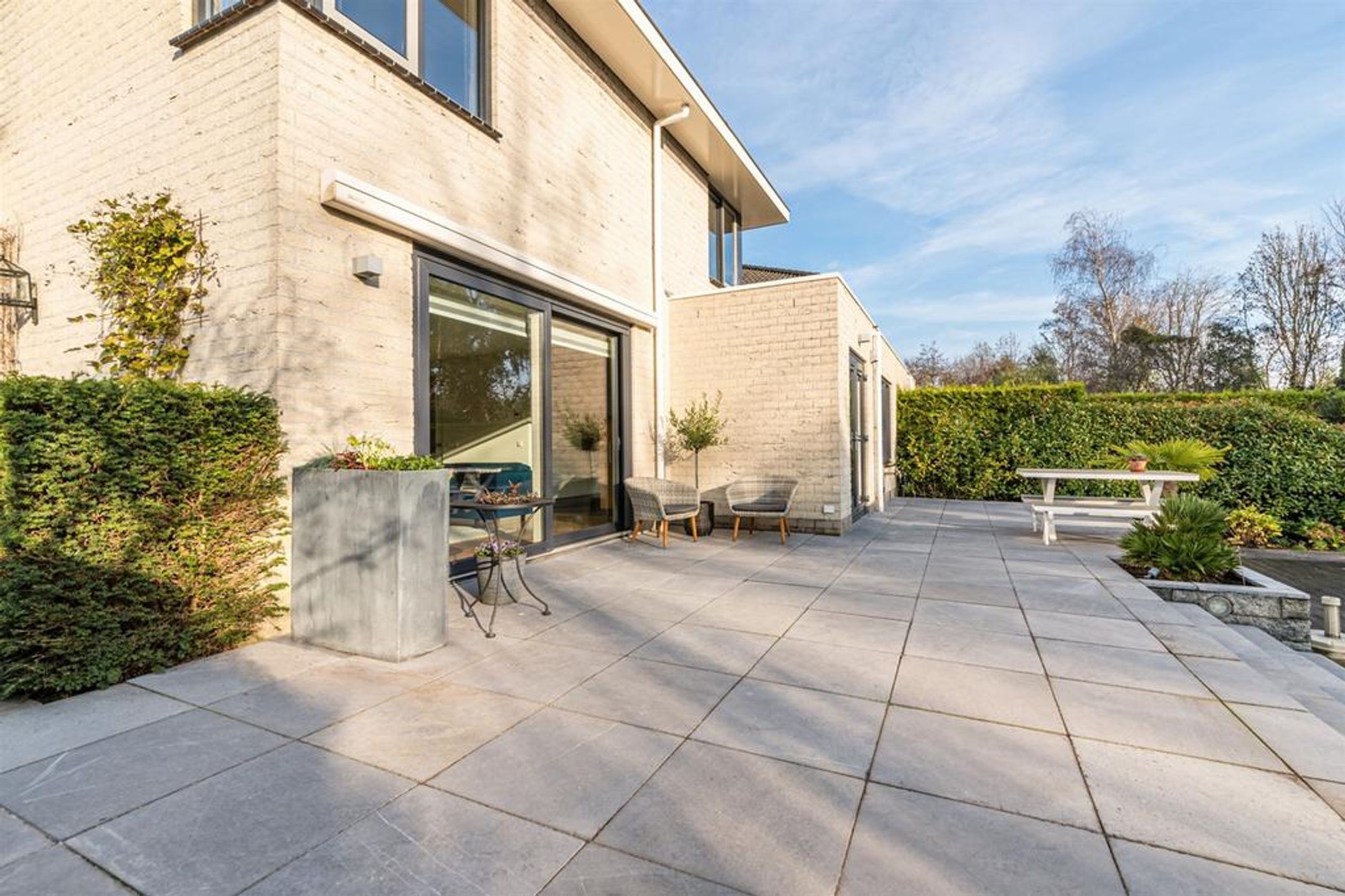 Groot zonneterras over gehele breedte perceel voorzien van natuursteen tegels