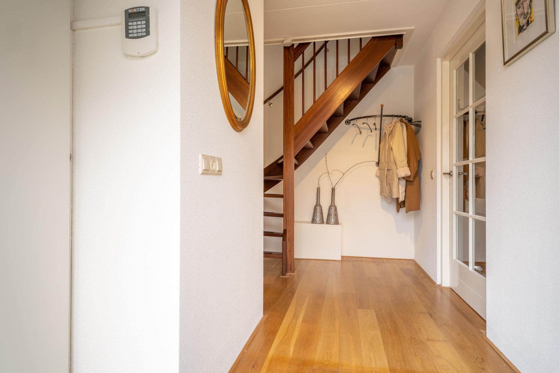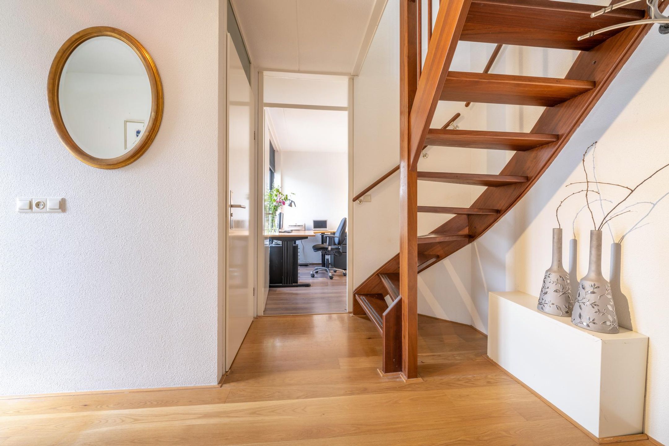 Toegang tot meterkast, garderobe, toilet, living, werkkamer en trapopgang.