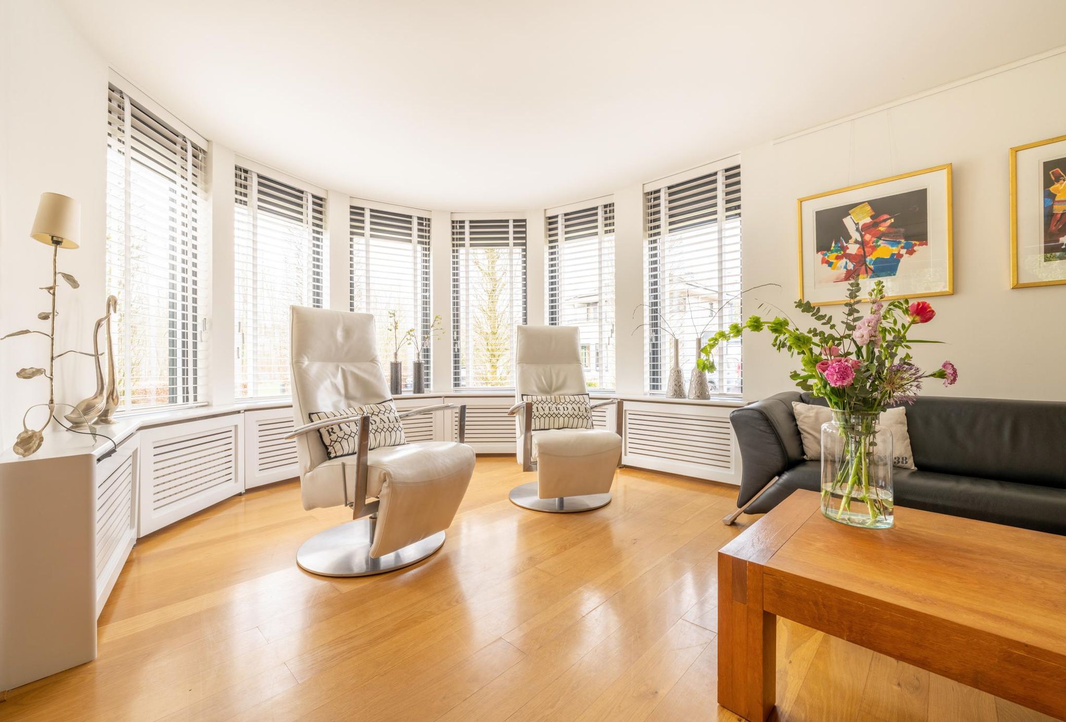 Ruime tuingerichte zitkamer en halfronde erker met zicht op bosrand.