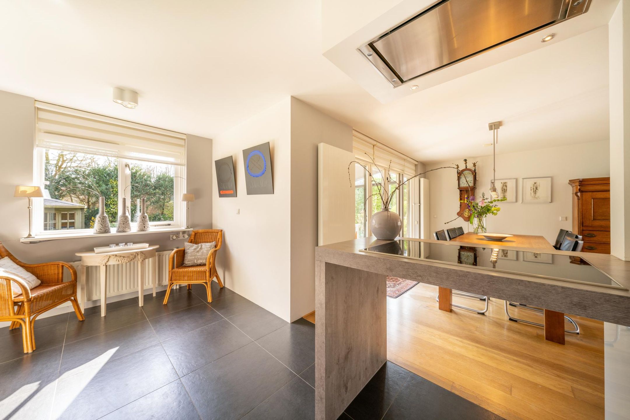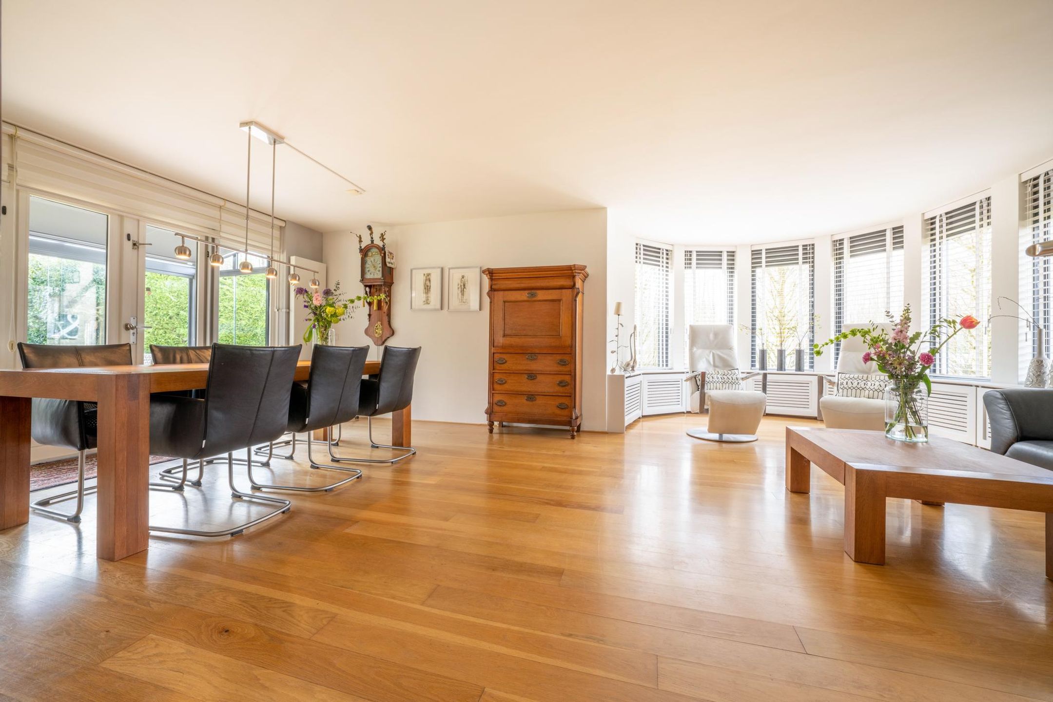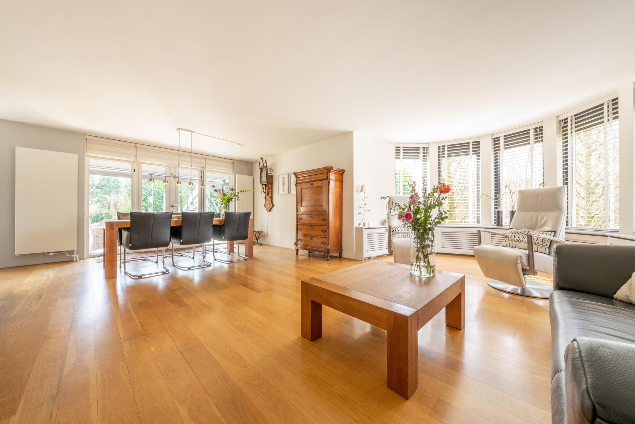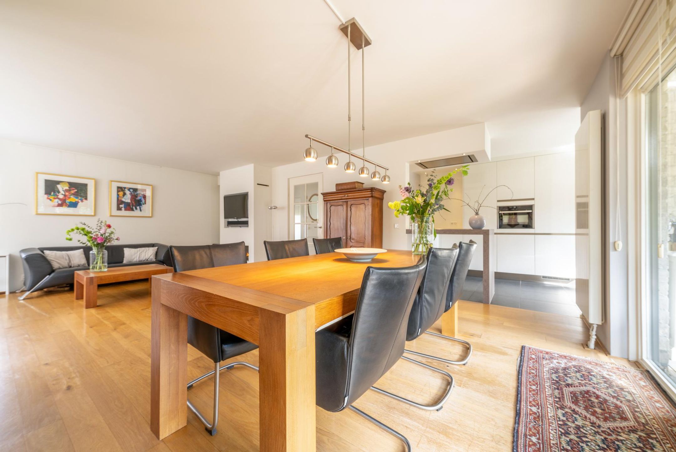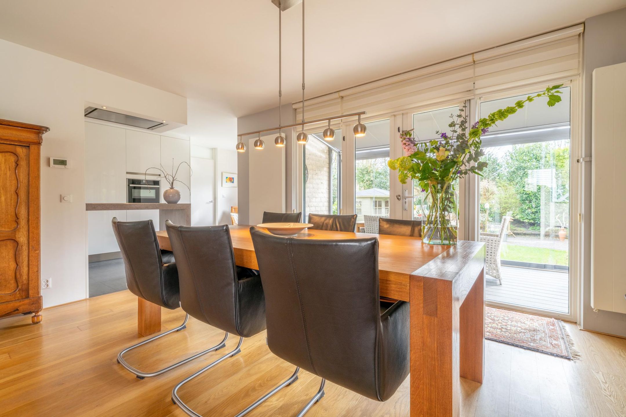 Ruime eetkamer met weids zicht op achtertuin en aangrenzende boswal.
