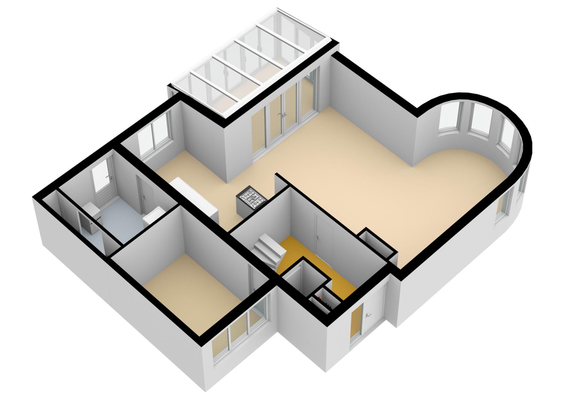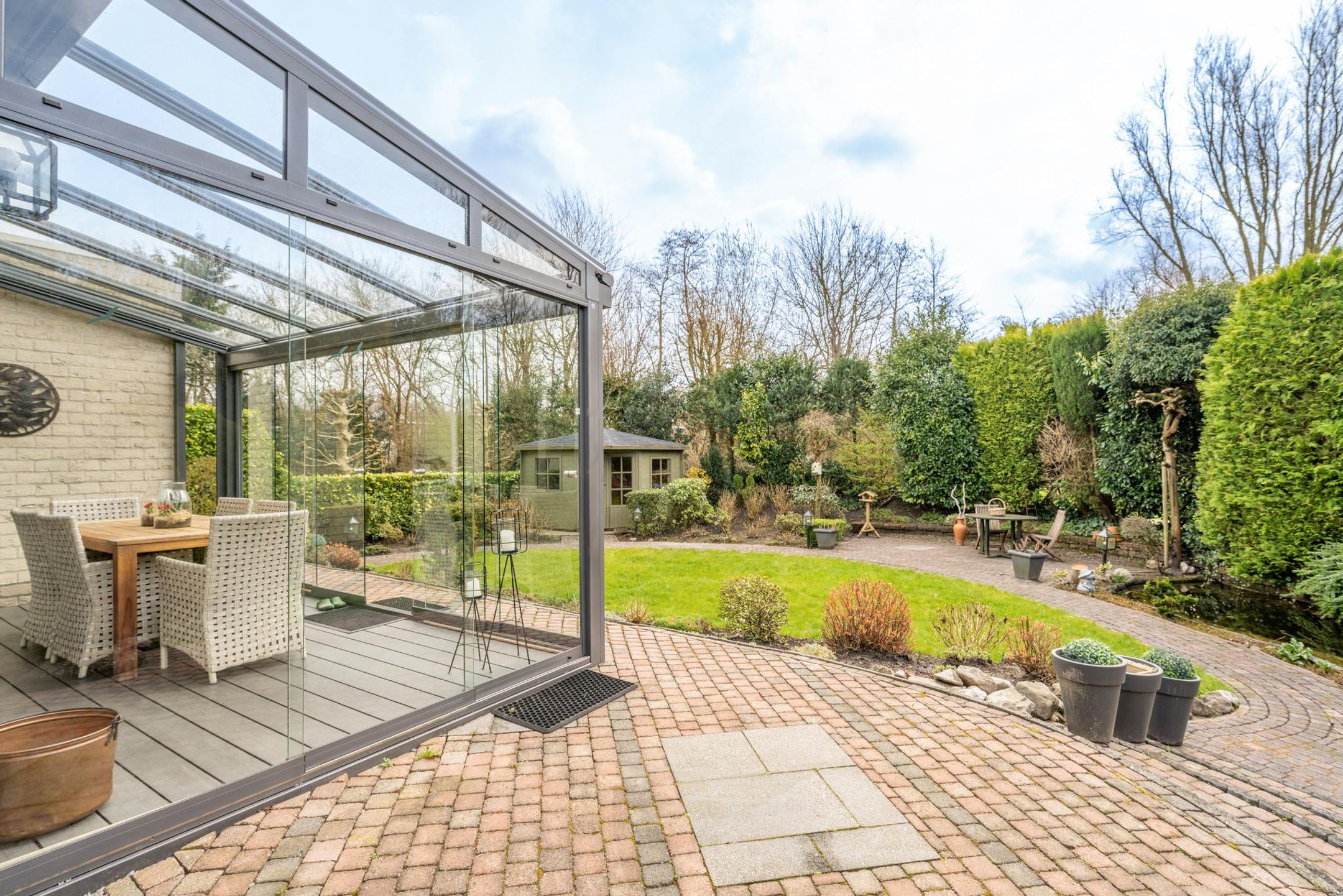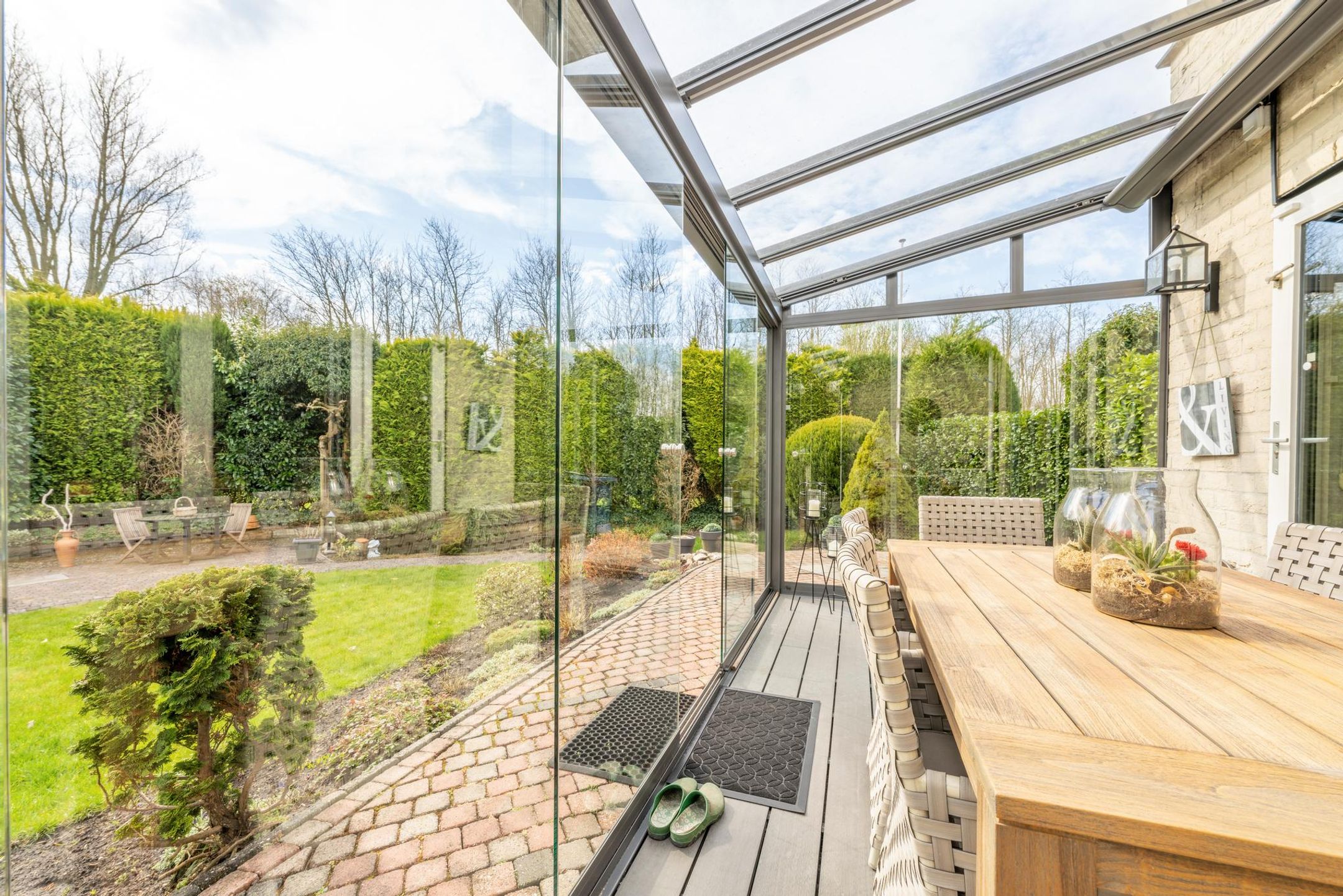 Hoogwaardige constructie met glazen dak en hardglazen schuifdeuren aan zij- en achterkant.
