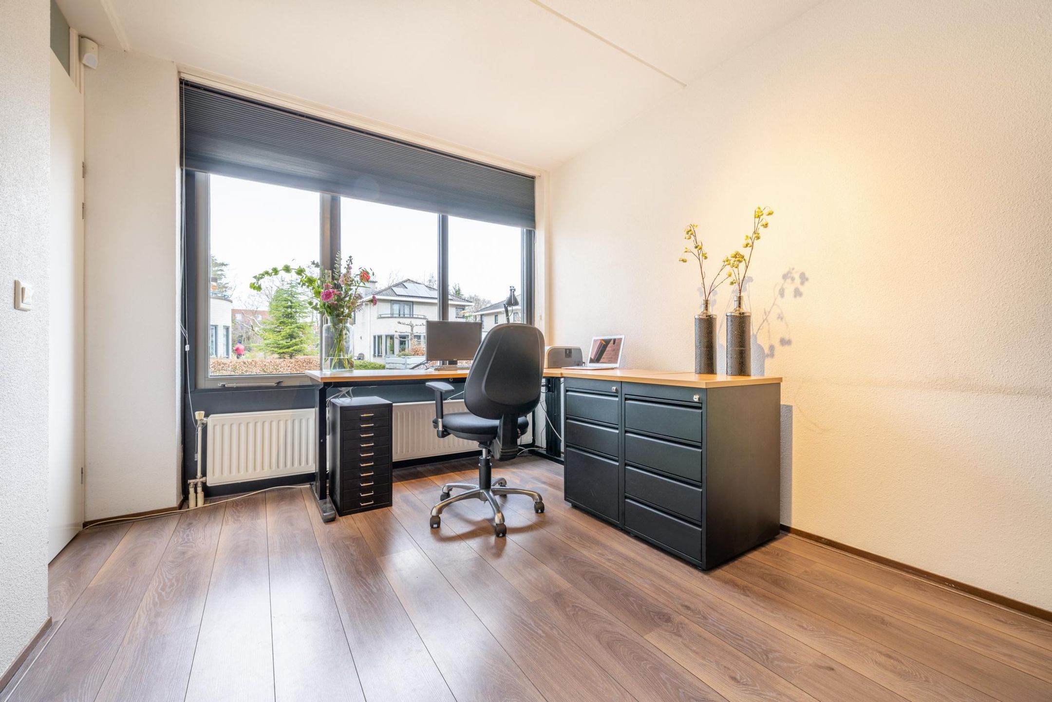 De kamer biedt ruimte aan een groot bureau en brede kastenwand.