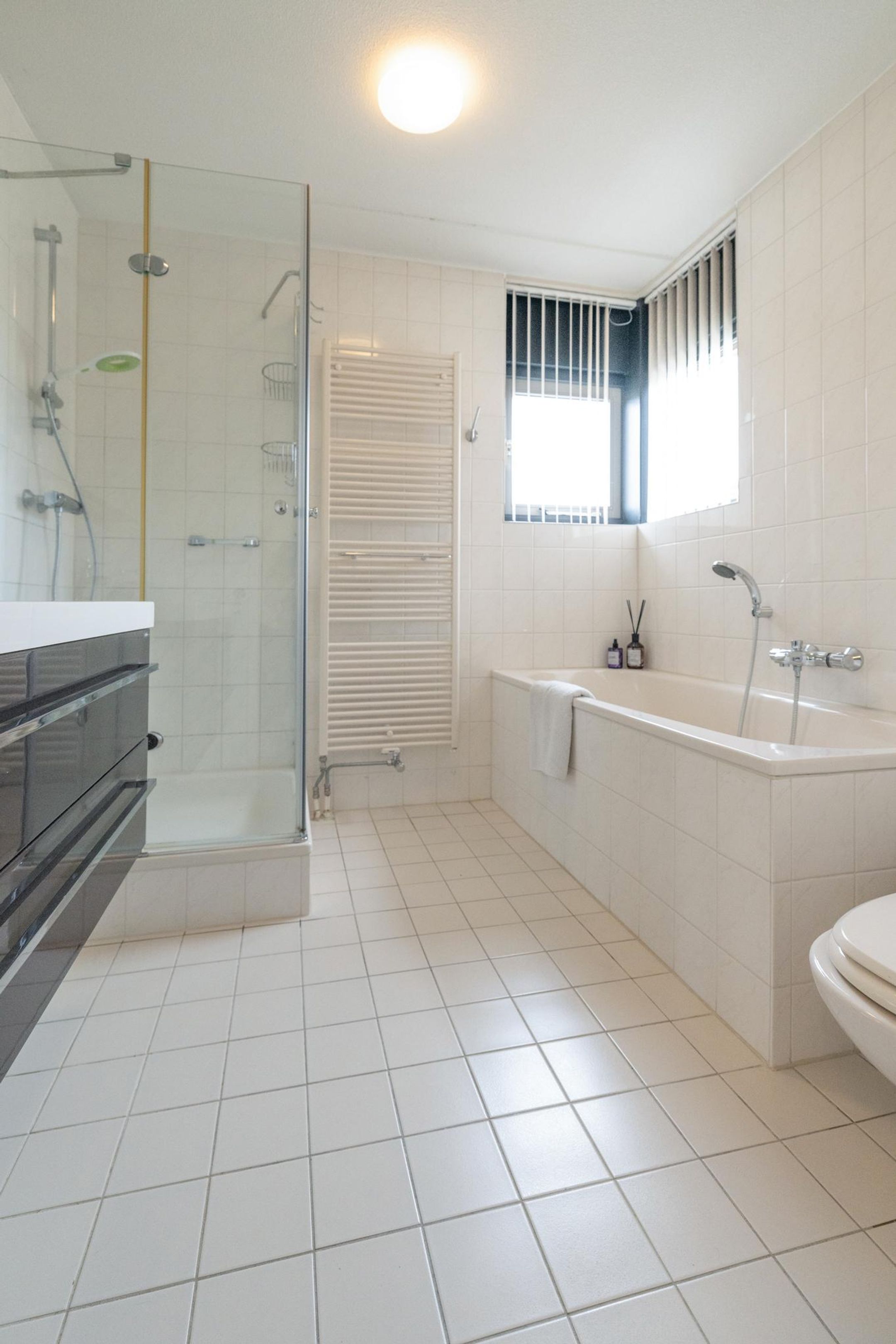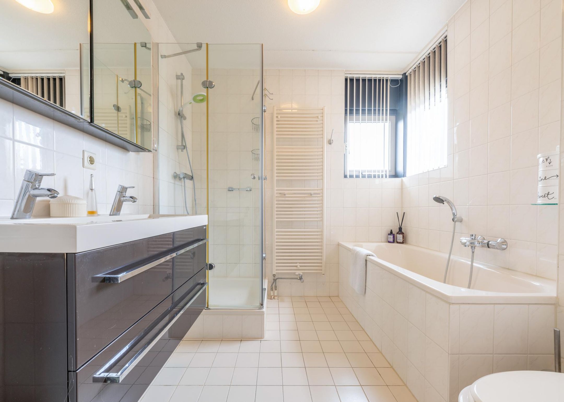 Royale en complete badkamer, rondom doorbetegeld tot het plafond.